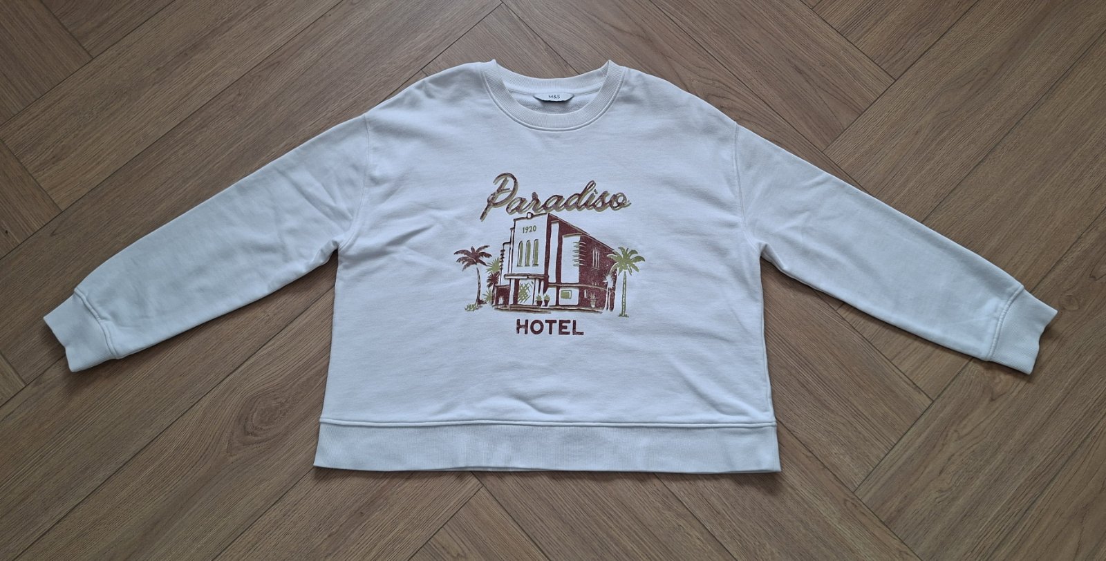 Dámska bavlnená mikina vo výbornom nosenom stave (bez poškodení; minimálne nosená). Obliekanie cez hlavu, bez odopínacích patentov. Značka: Marks and Spencer (odstrihnutý vnútorný štítok); veľkosť: L.