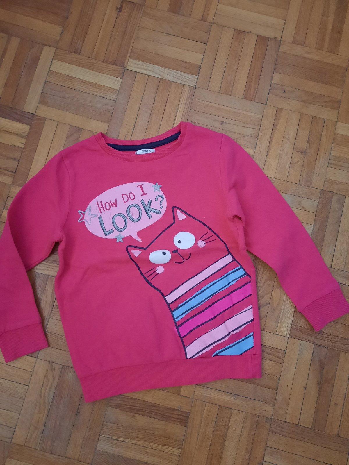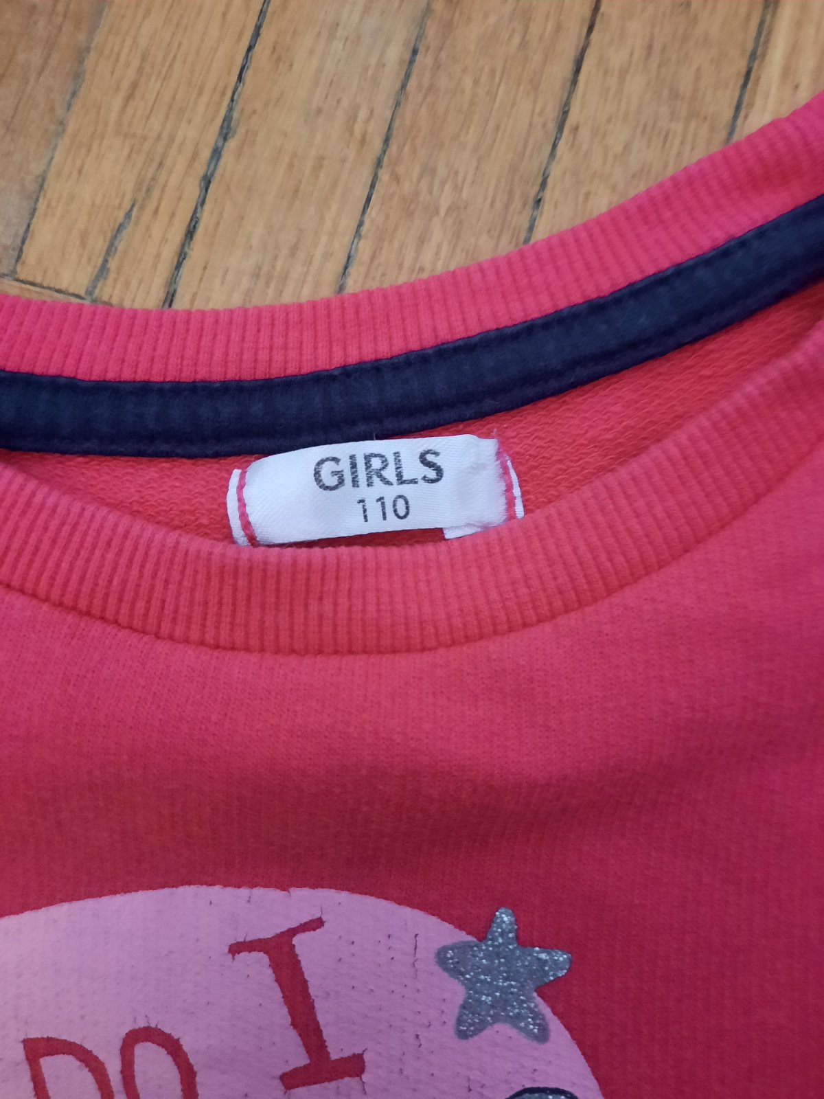 Pekná bavlnená mikina pre dievčatko v peknom stave, iba na ľavom ramene sa podarilo spraviť dierku (stačí dať nažehlovačku-záplatu podľa vlastného výberu). Manžety na rukávoch aj dole.