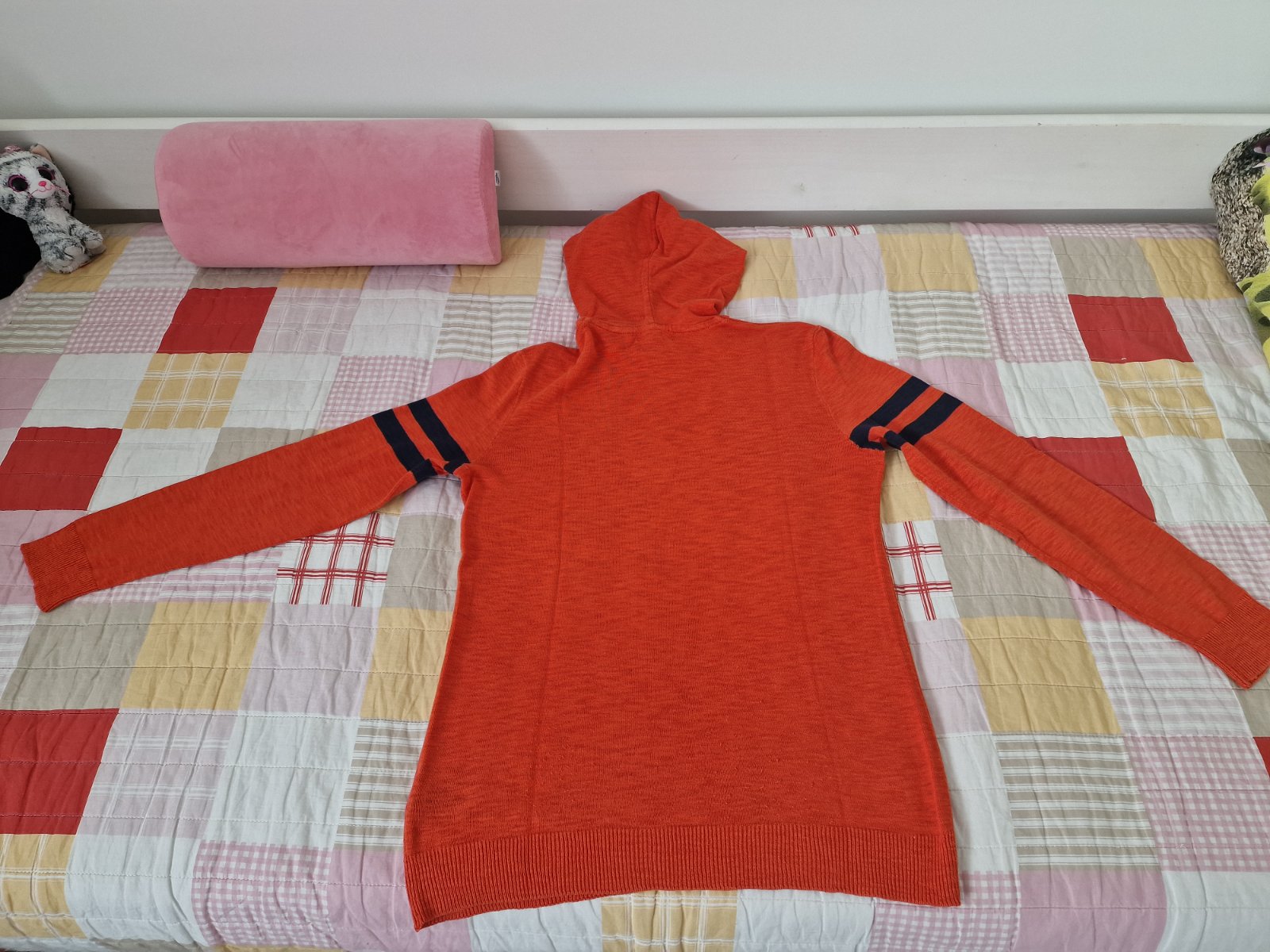 Zaujímavý svetrík z H&M.Tenký ľahký. Syn ho nosil, keď ráno bolo chladno, ale poobede horúco. Nezaberá veľa miesta. Nosený, ale ešte stále v pohode. Jedna zašitá dierky, pozri foto na ľavej zadnej strane rukáva hore. Veľkosť cca 176. Dĺžka 66 cm, pod pazuchami 52 cm, rukáv od ramena 61 cm, od krku 61+ 11.