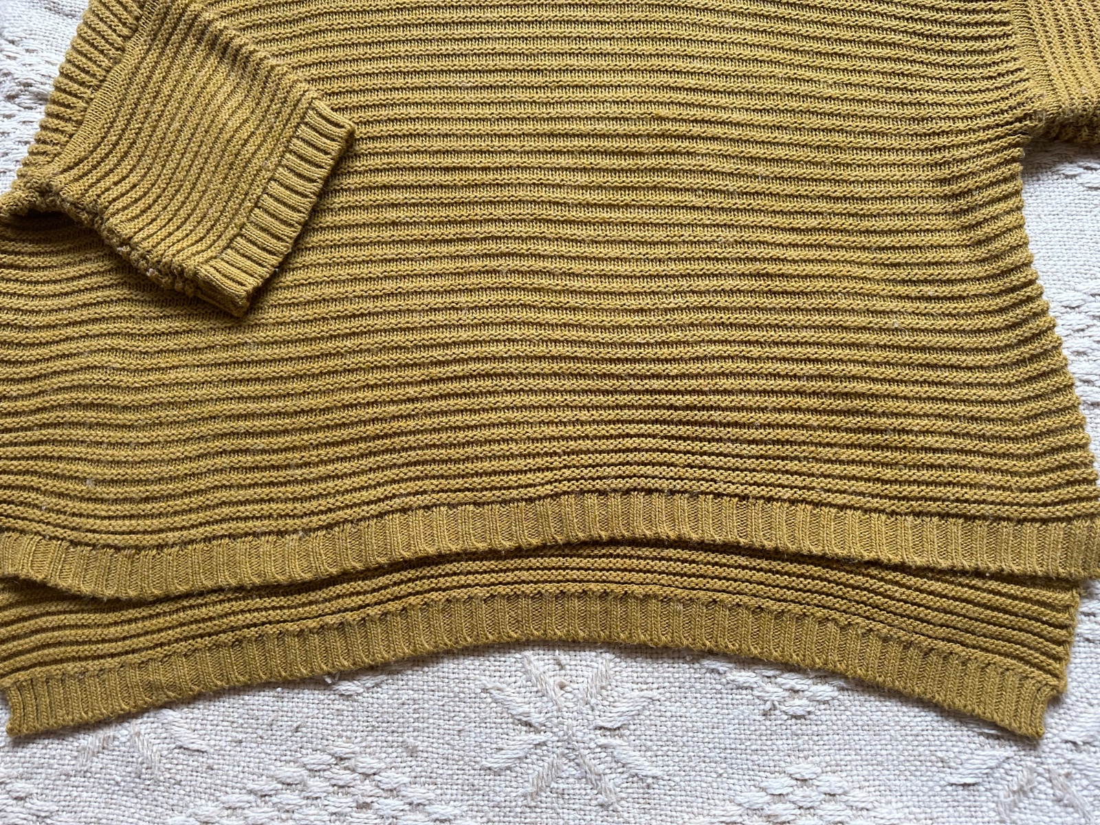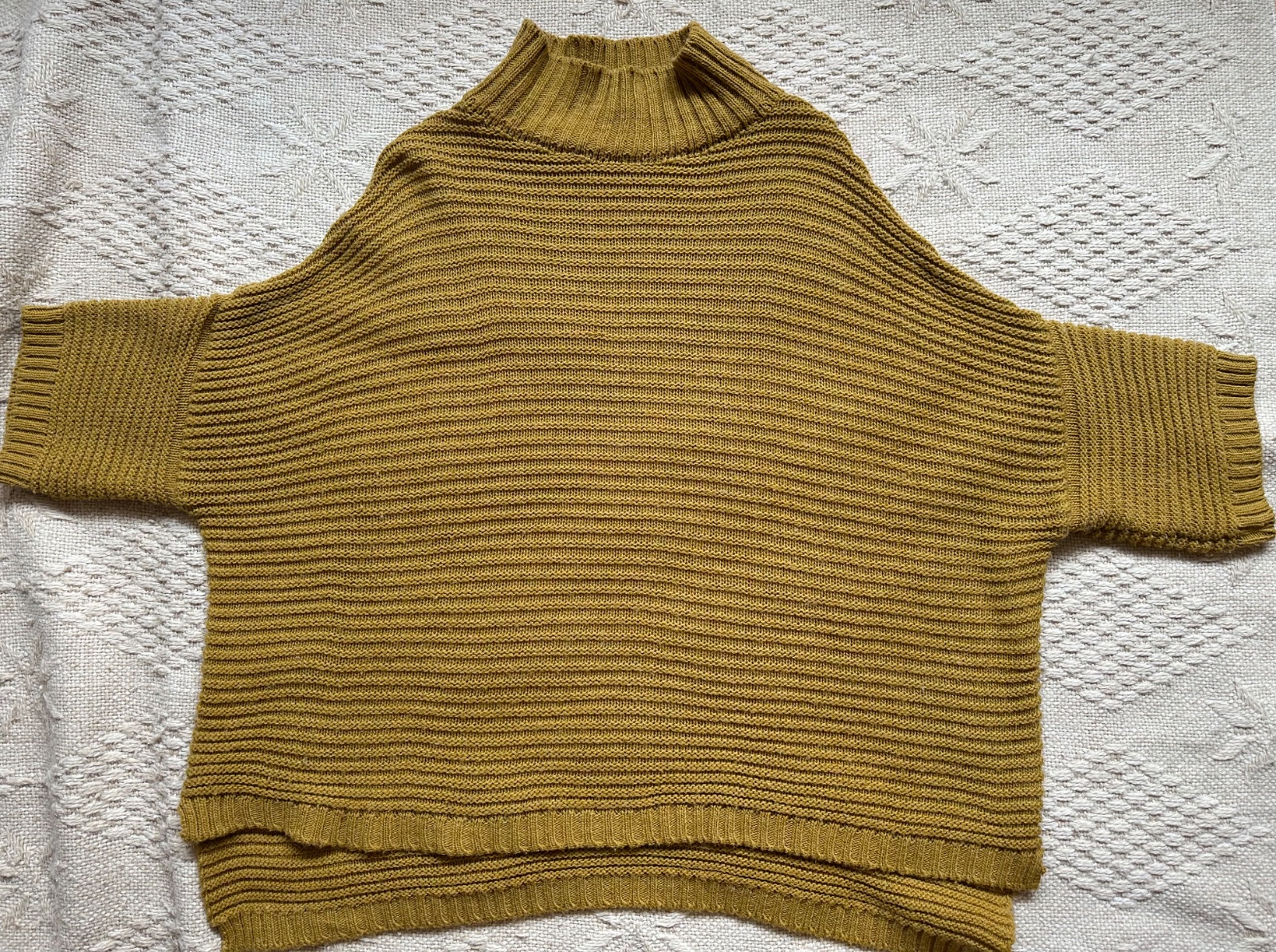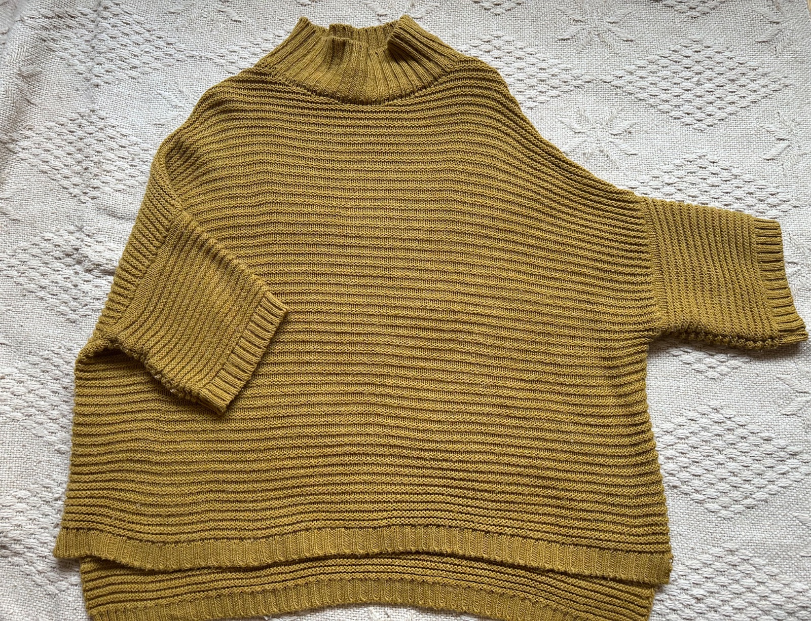 Over size pletený pulover s prímesou vlny a mohéru. Rovný strih, Stojačik, krátky rukáv, padne do 3/4 ruky. Po bokom mini rozparky. Predná časť trošku kratšia, dĺžka 70 cm, zadná časť 75 cm. Šírka hrudník 2 x 65 cm. Sadne aj na M. Ľahký, padavý. Veľmi pekný stav.