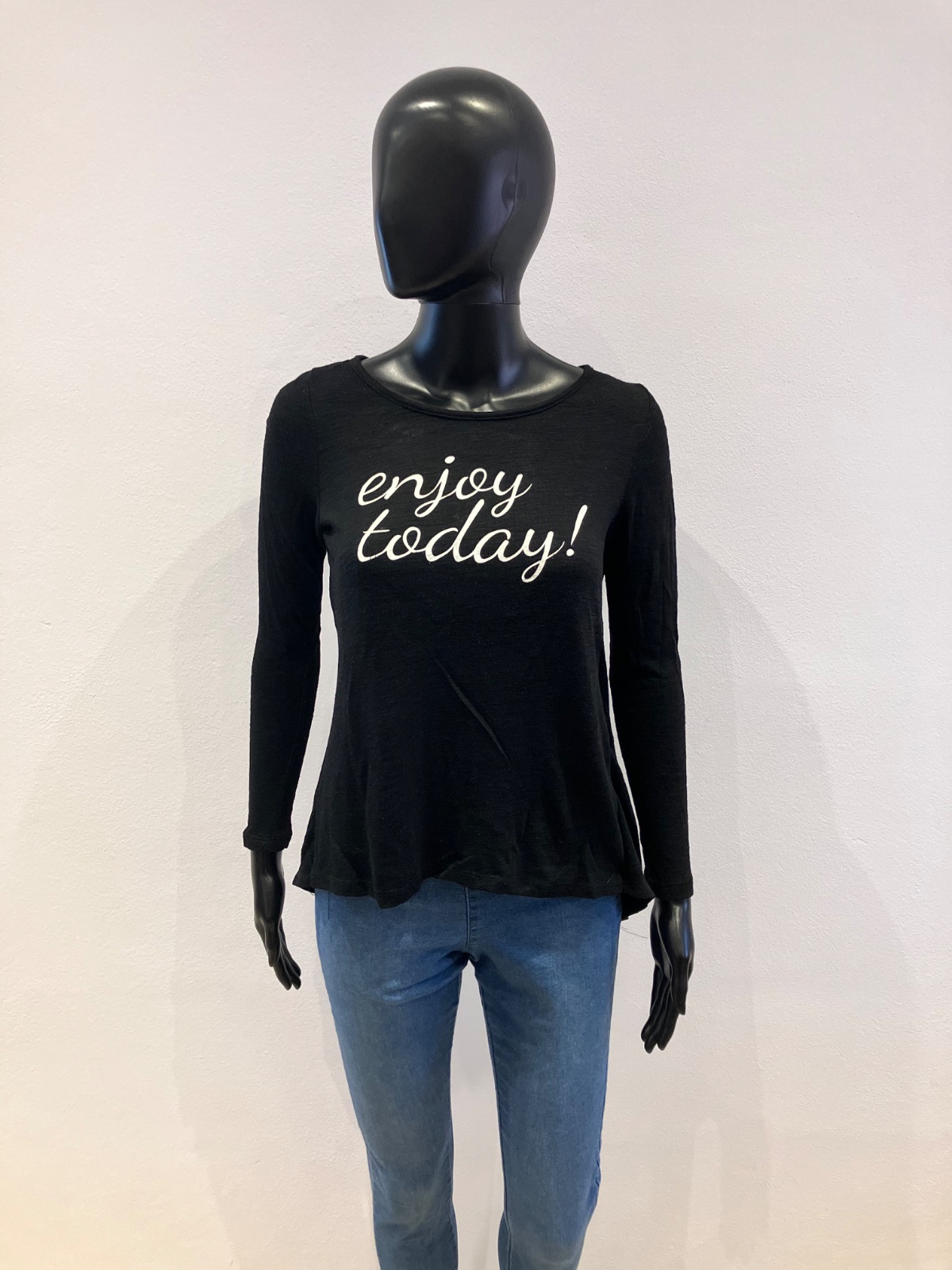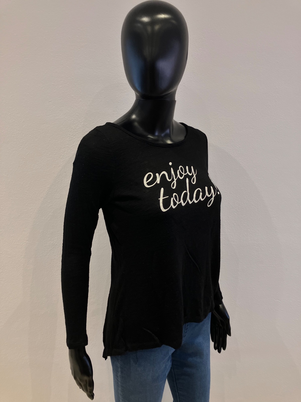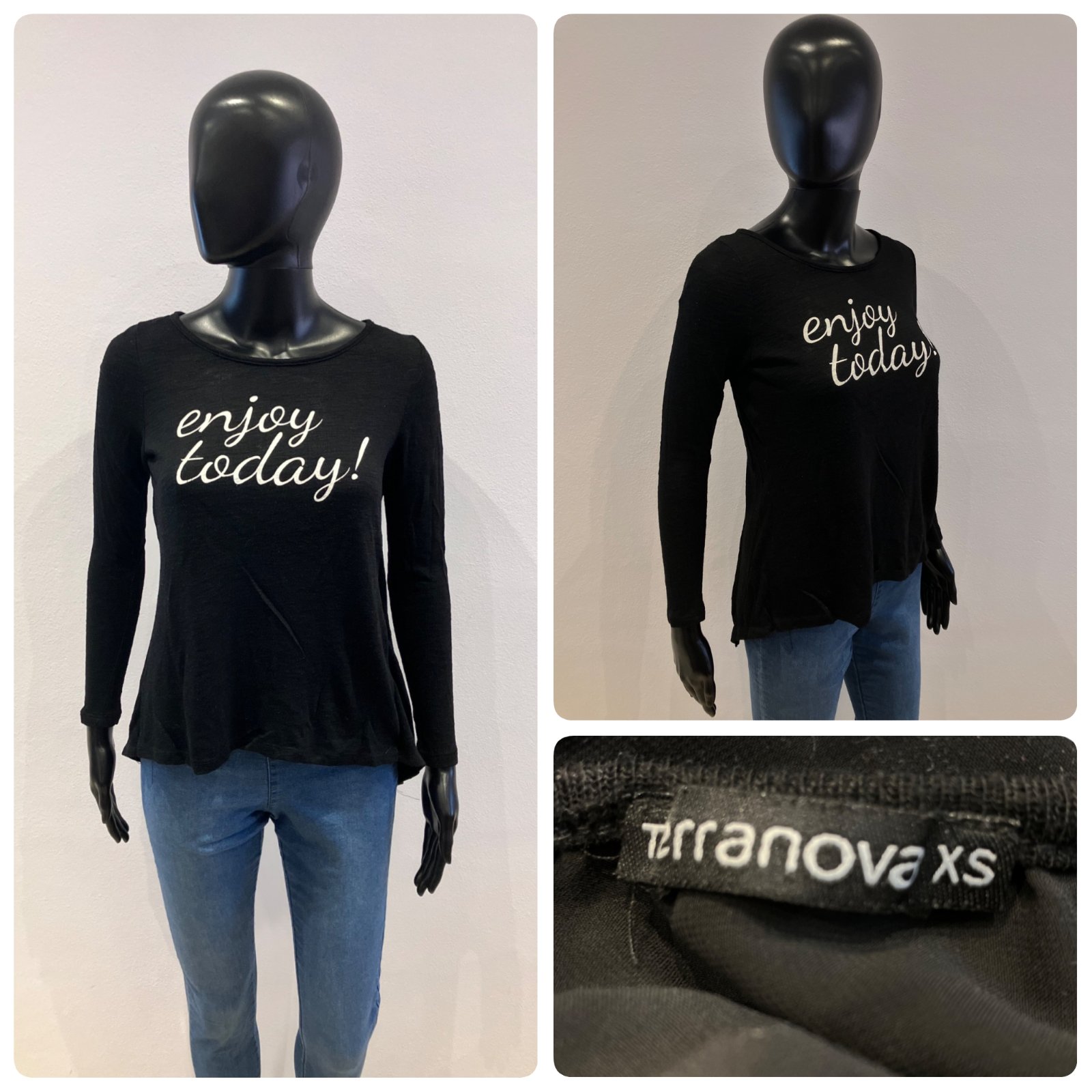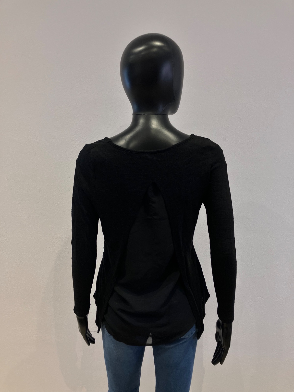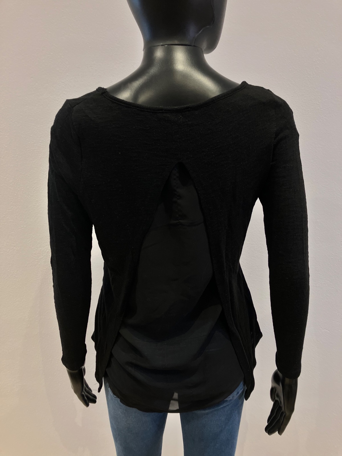 Dámsky sveter s bielym nápisom, vzadu jedna časť ako blúzka, elastický, okrúhly výstrih, tenký.