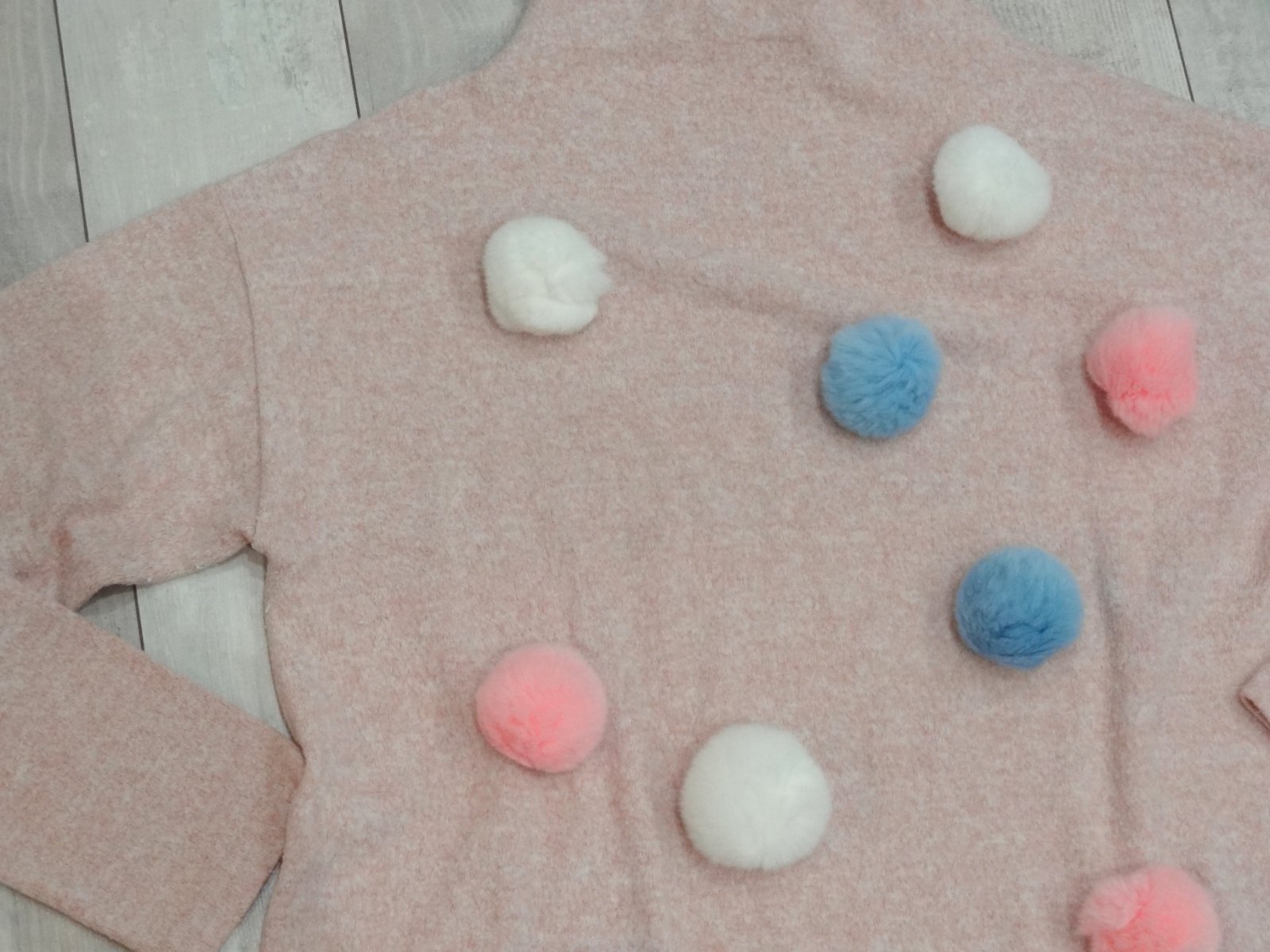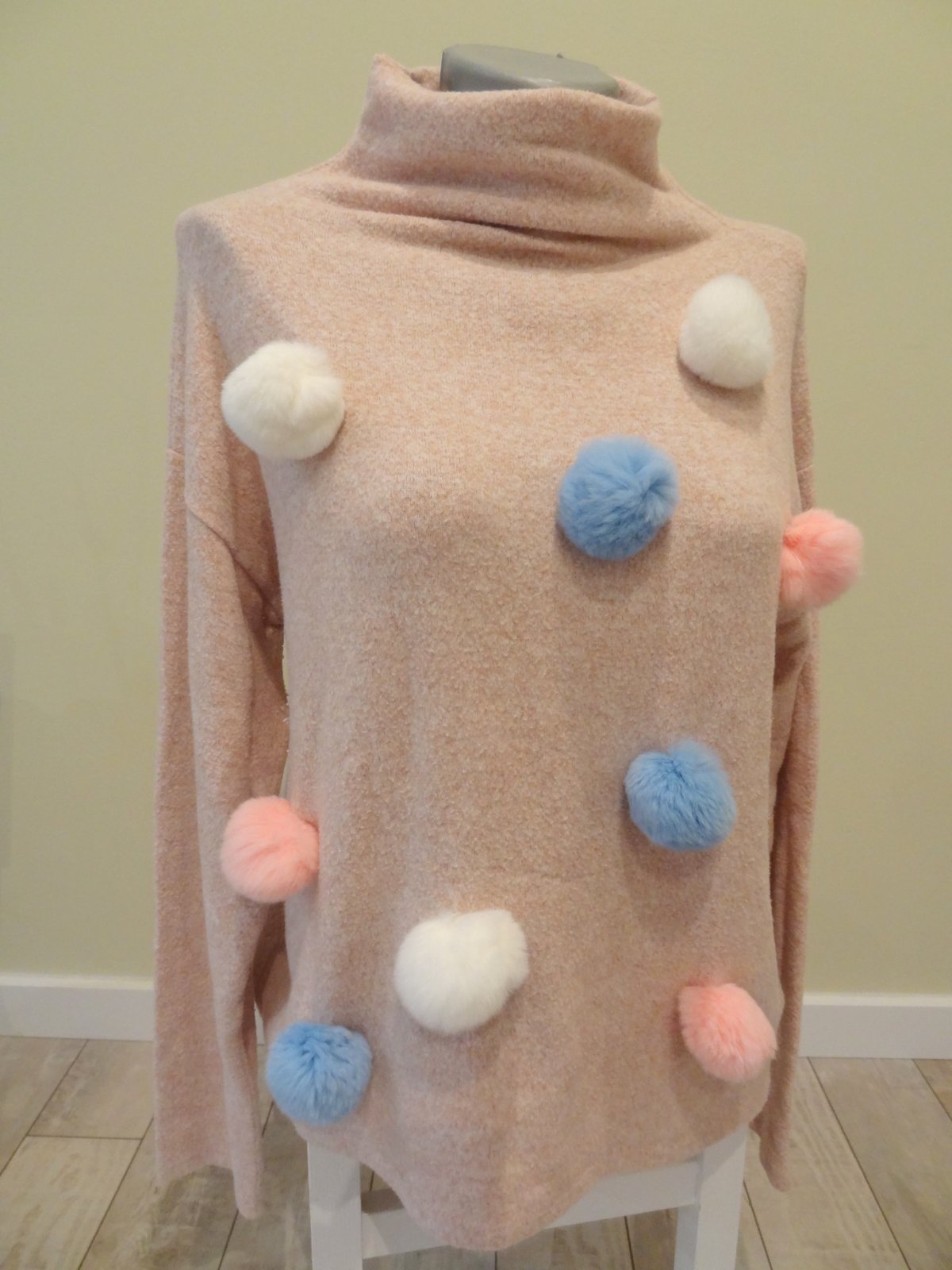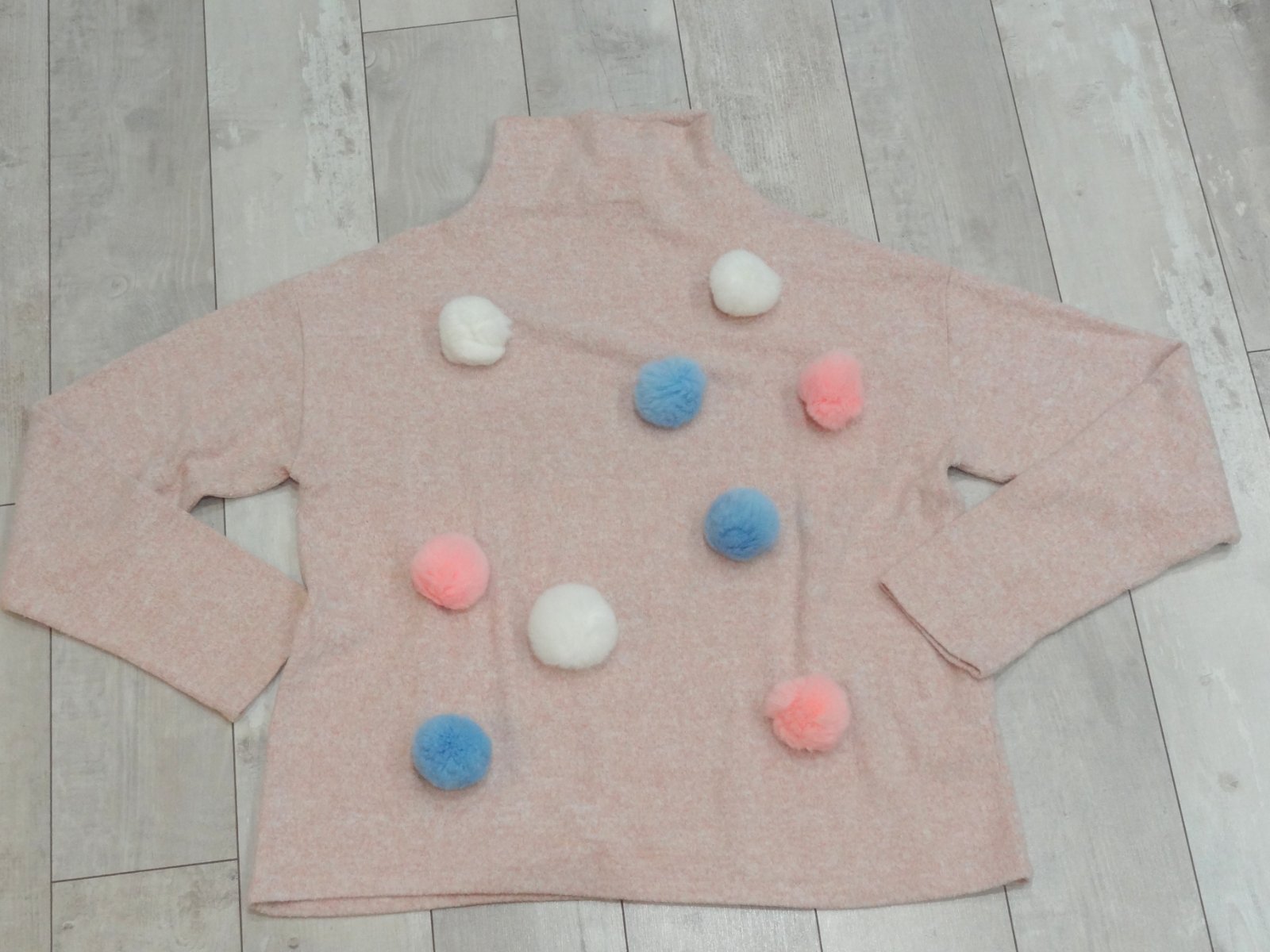 Dámsky pulover/rolák s brmbolcami ...v zachovalom stave ... značka: STRADIVARIUS ... brmbolce sú našité HANDMADE ... veľ. L - dlžka 62 cm, šírka pod pazuchami 55 cm, šírka pás 53 cm