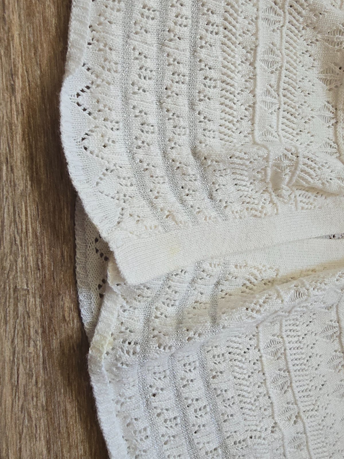 Predam noseny biely sveter. Ma zmolky a na spodnej casti svetra na jednej strane viac. Je to odfotene. Sirka pod pazuchami 41cm, dlzka 56cm, rukav od pleca 63cm