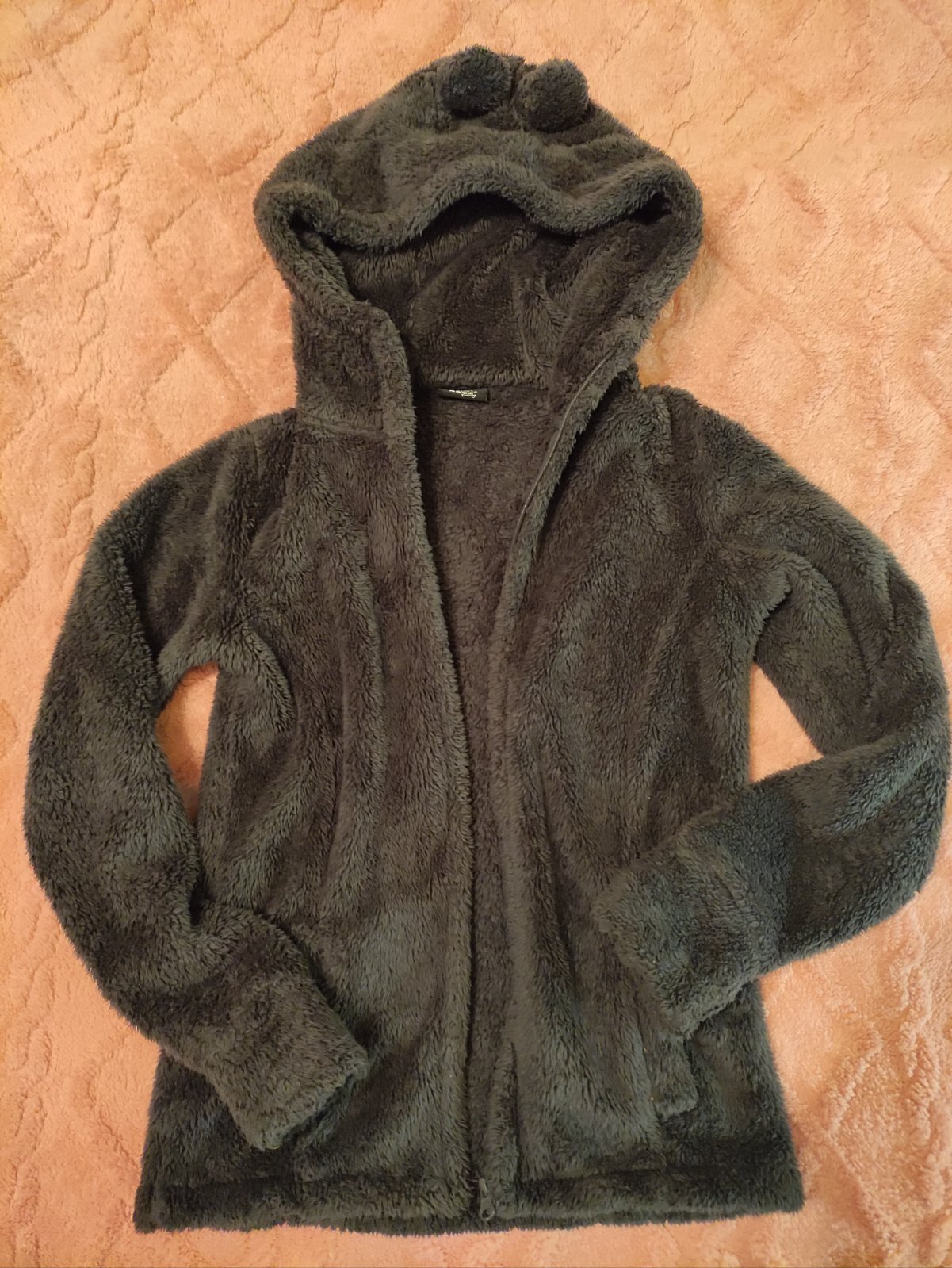 Predám teplákovú mikinu tmavej šedej farby s kresbou tvére dievčaťa. Je nosená, ale v dobrom stave bez poškodení, len má žmolky. Veľkosť asi 158, Rozmery: celková dĺžka od ramena po spodok - 56 cm...