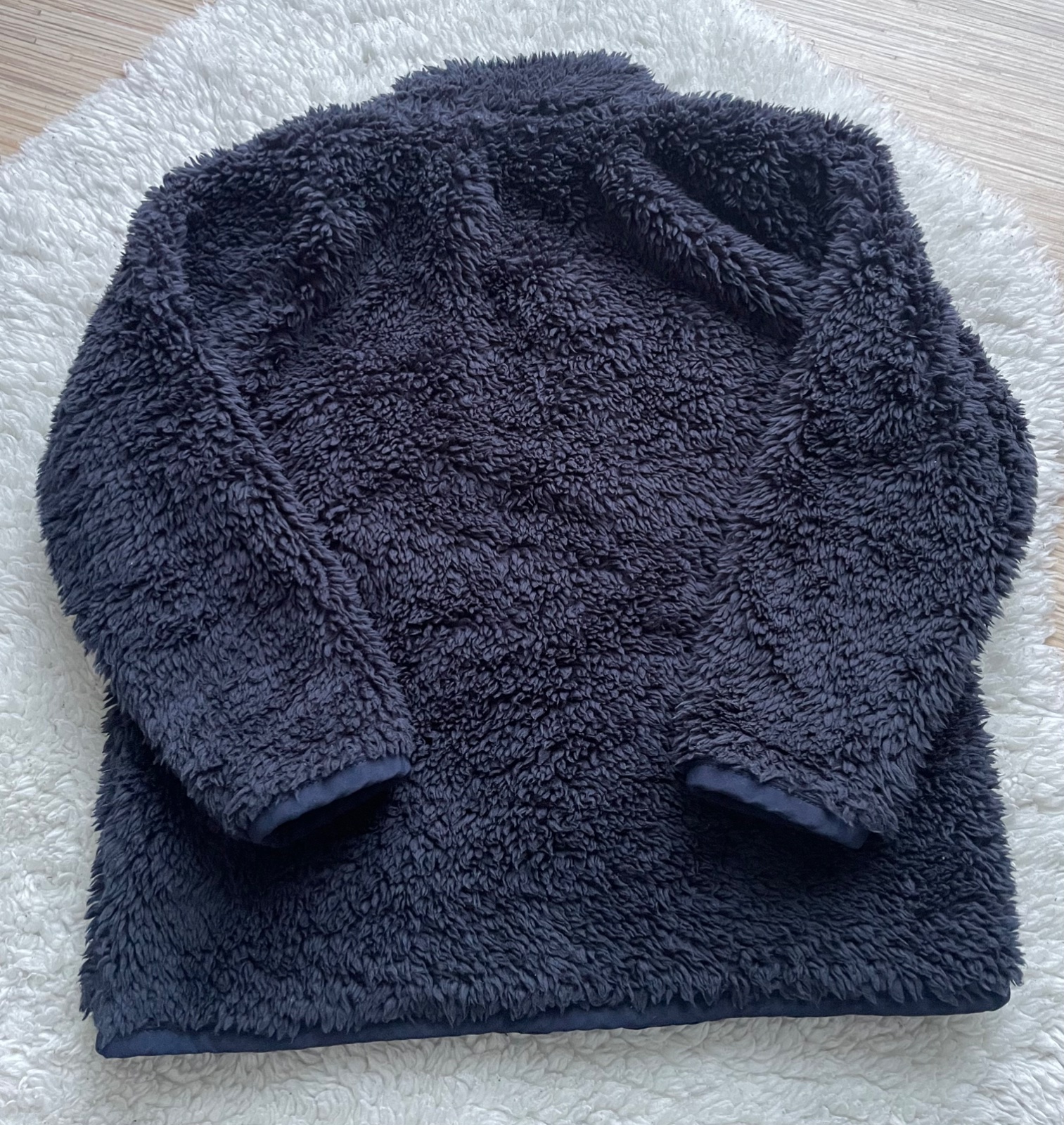 Tmavomodra makkucka plysova mikina/bunda so zapinanim na zips, predne vrecko so sustiakovej latky na zips, nepodsita, raz oblecena