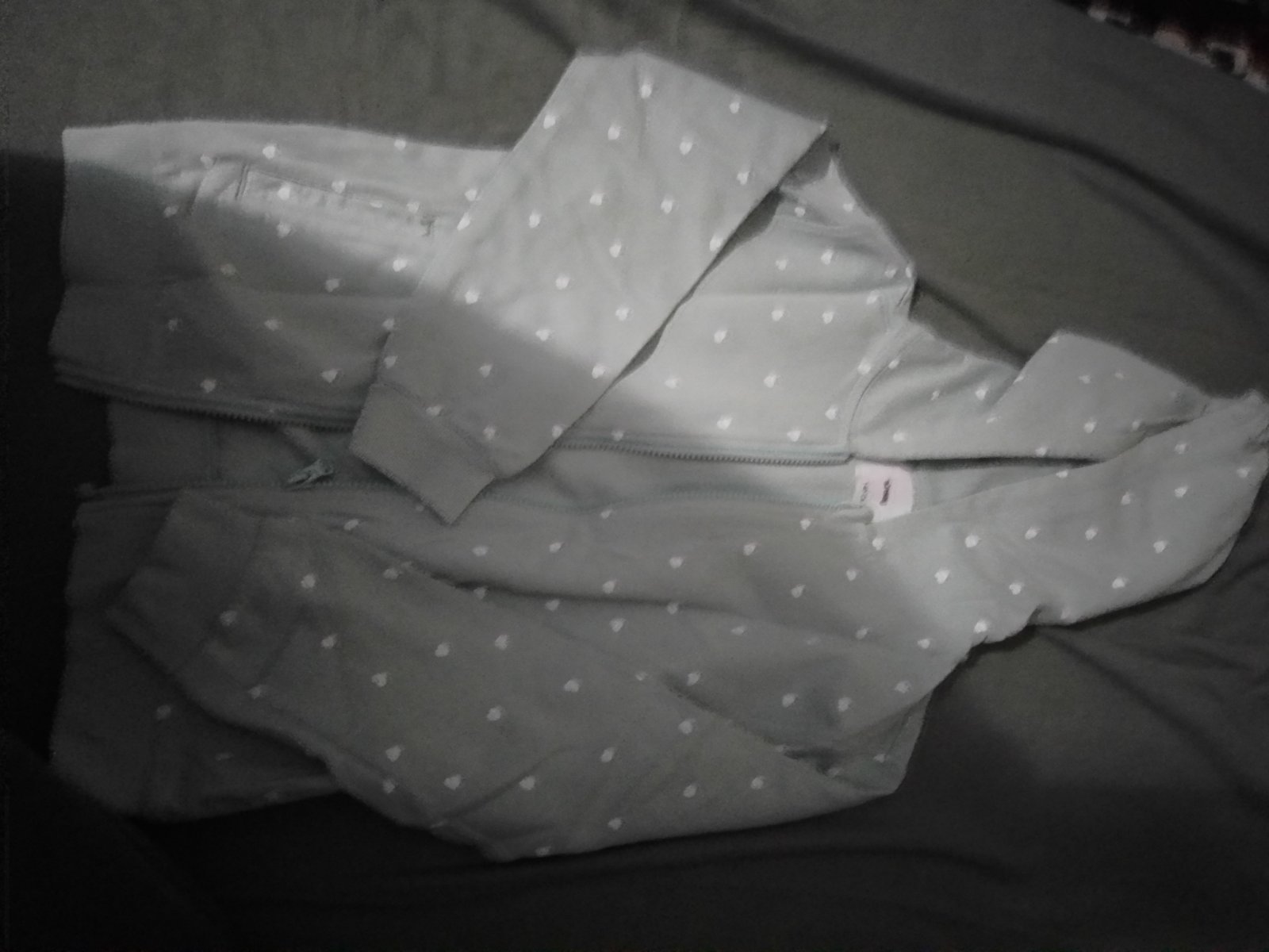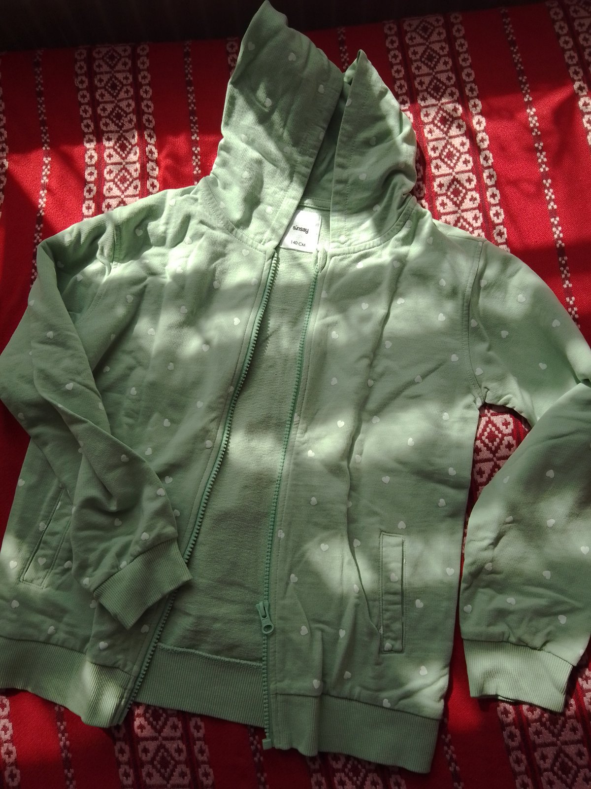 Predám málo nosenú dievčenskú svetlo zelenú mikinu s bielymi srdiečkami.