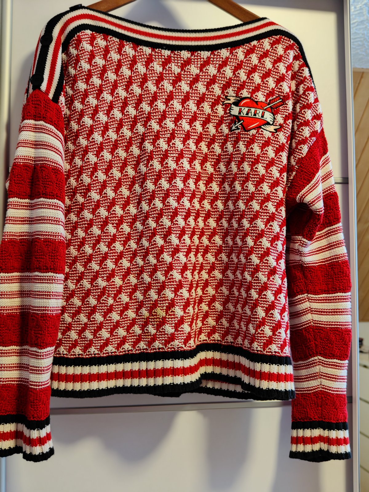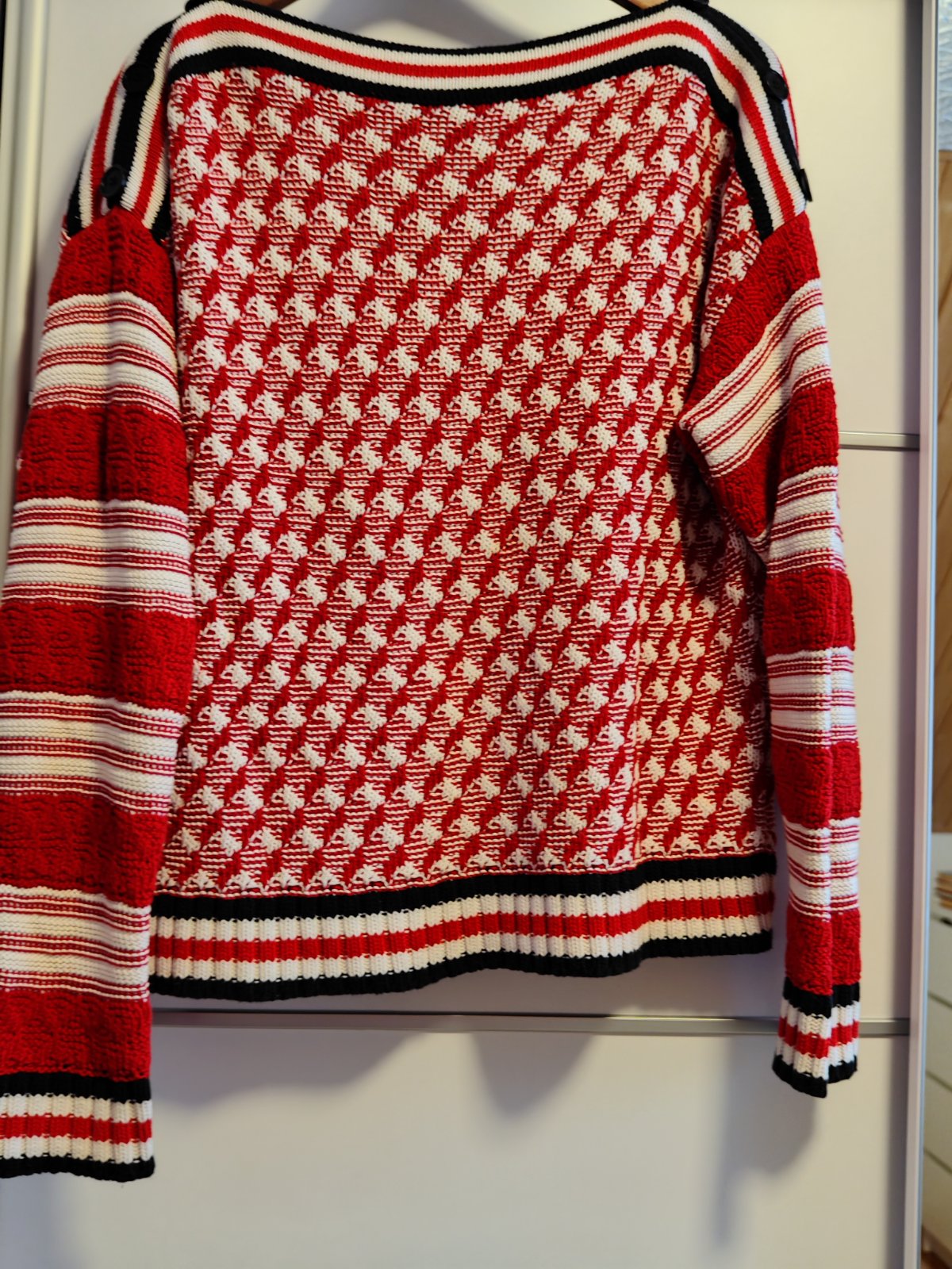 Nádherný kvalitný sveter v červenou bielou čiernej kombinácii, maximálne kvalitný a krásny veľkosť uvedená m ale je väčší aj L/XL, PC velmi vysoka, maličko nosený bez poškodenia