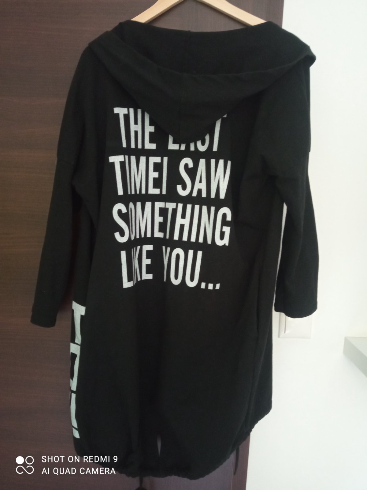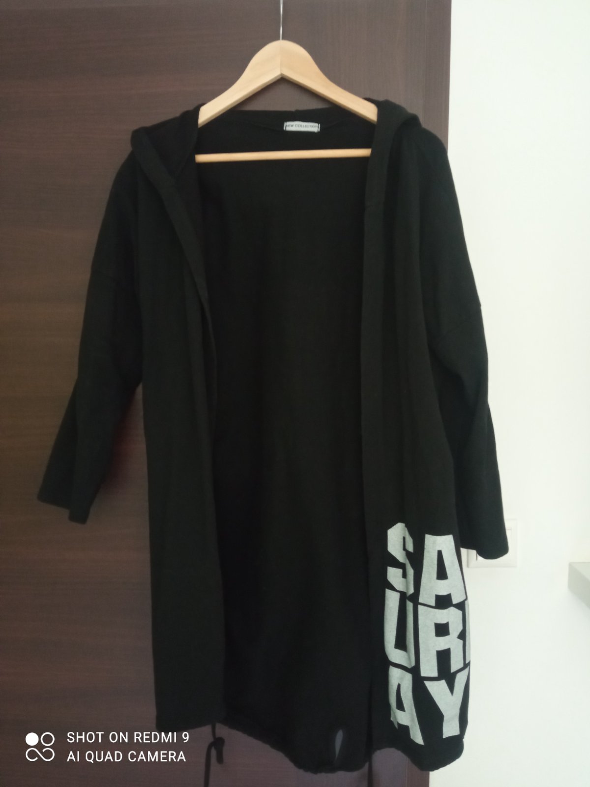 Kardigan čiernej farby s kapucňou univerzálnej veľkosti. Bez zapínania s dvomi vreckami