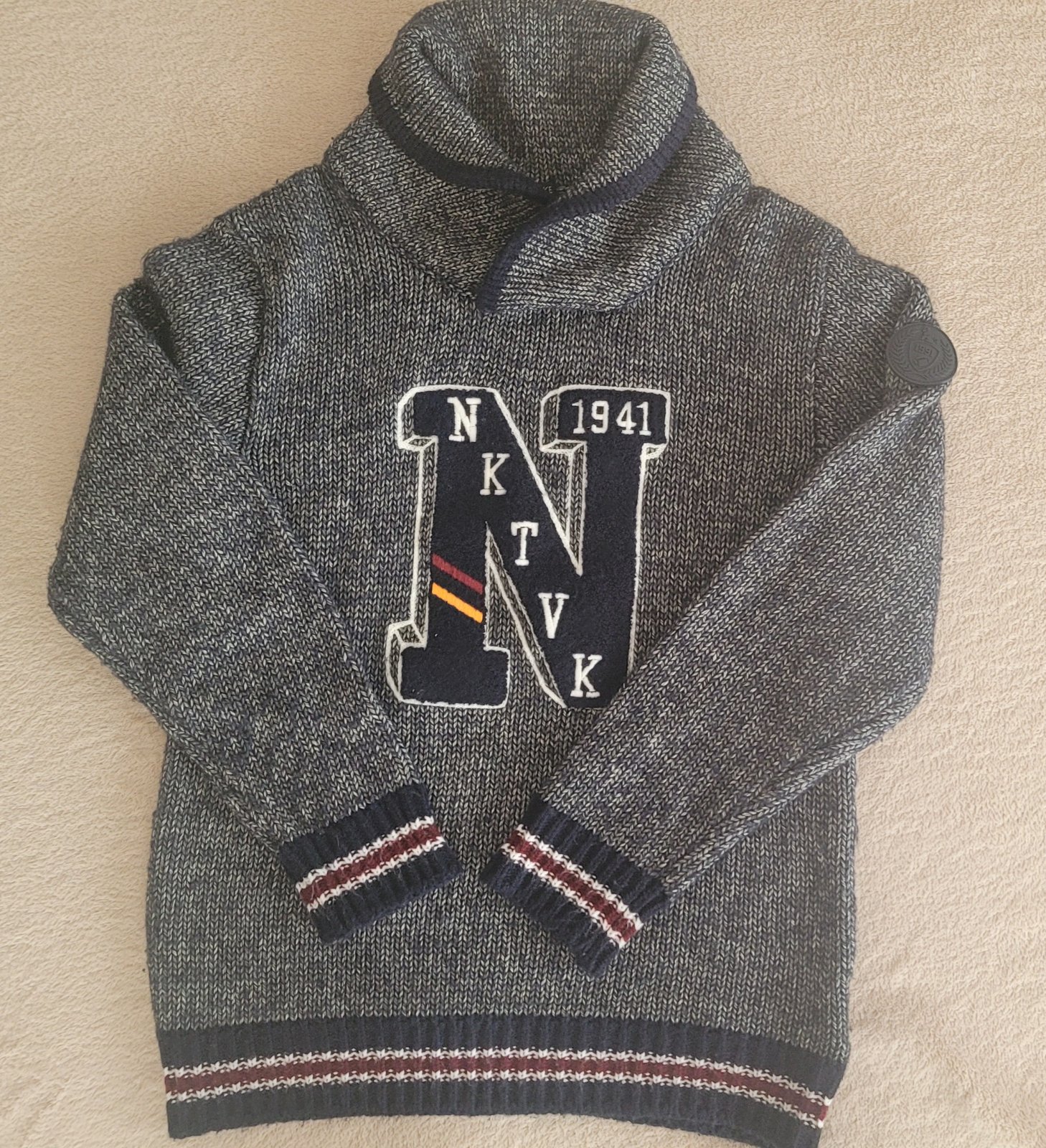 Kvalitný a pekný tmavomodrý pulover s bielymi obrázkami člnov, plachetníc a lodí, vo veľmi dobrom stave. Oblečený max. 2x. Dĺžka 56cm, šírka 44cm, rukáv od krku 62cm.