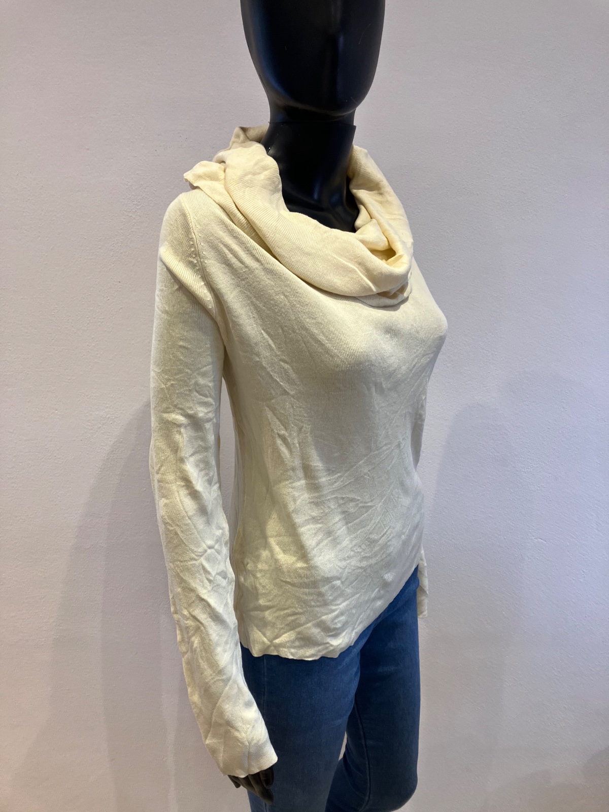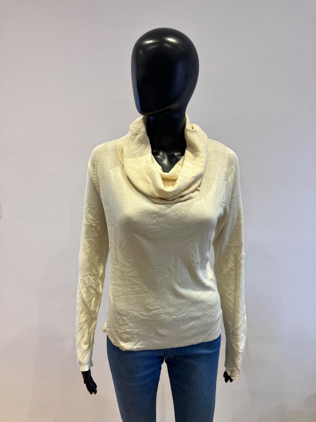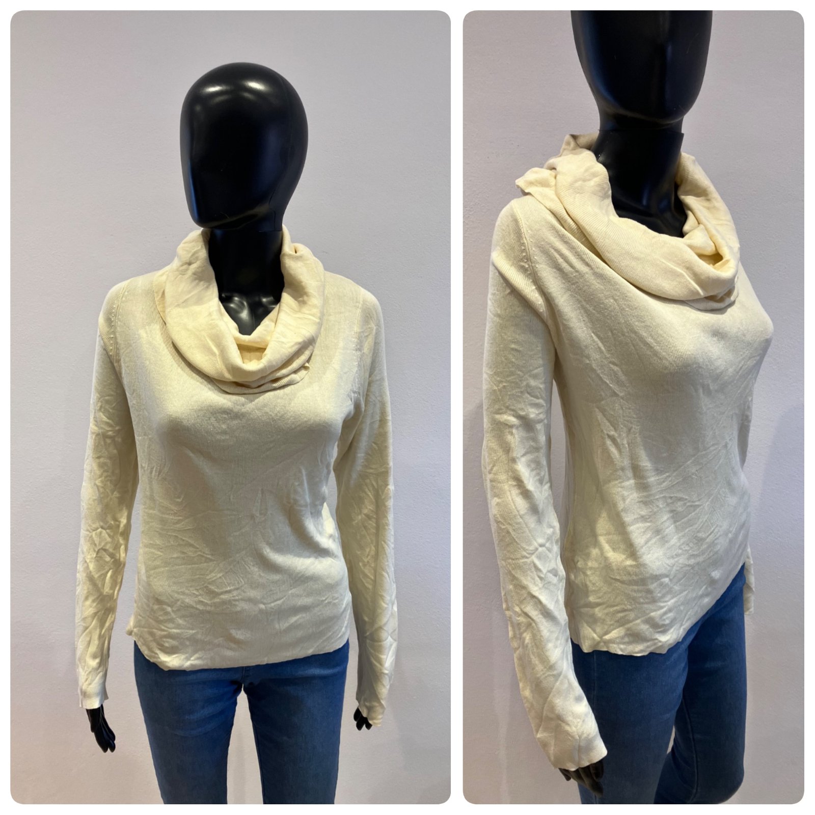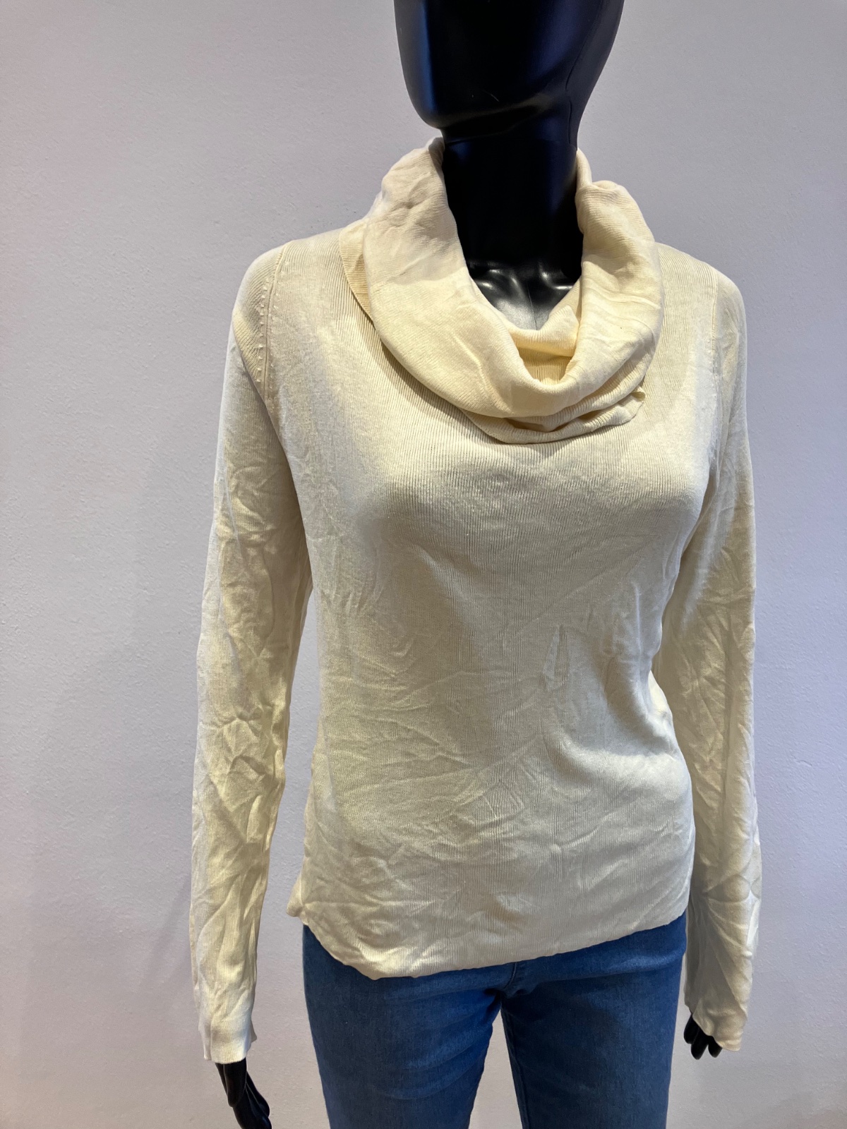 Dámsky sveter so spadnutým rolákom, tenký, elastický, materiál 80%silk 20%bavlna. Farba maslová.