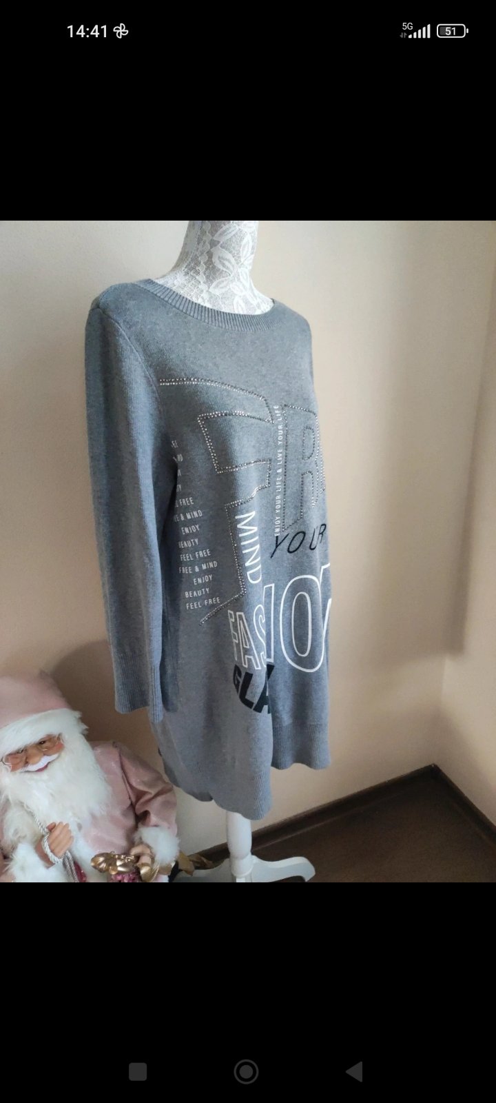 Svetlo sivý sveter pretkavany striebornou niťou Výborný stav, malo nosený Rozmer si žiadajte, ale je to volny strih, neviem kde merať a čo