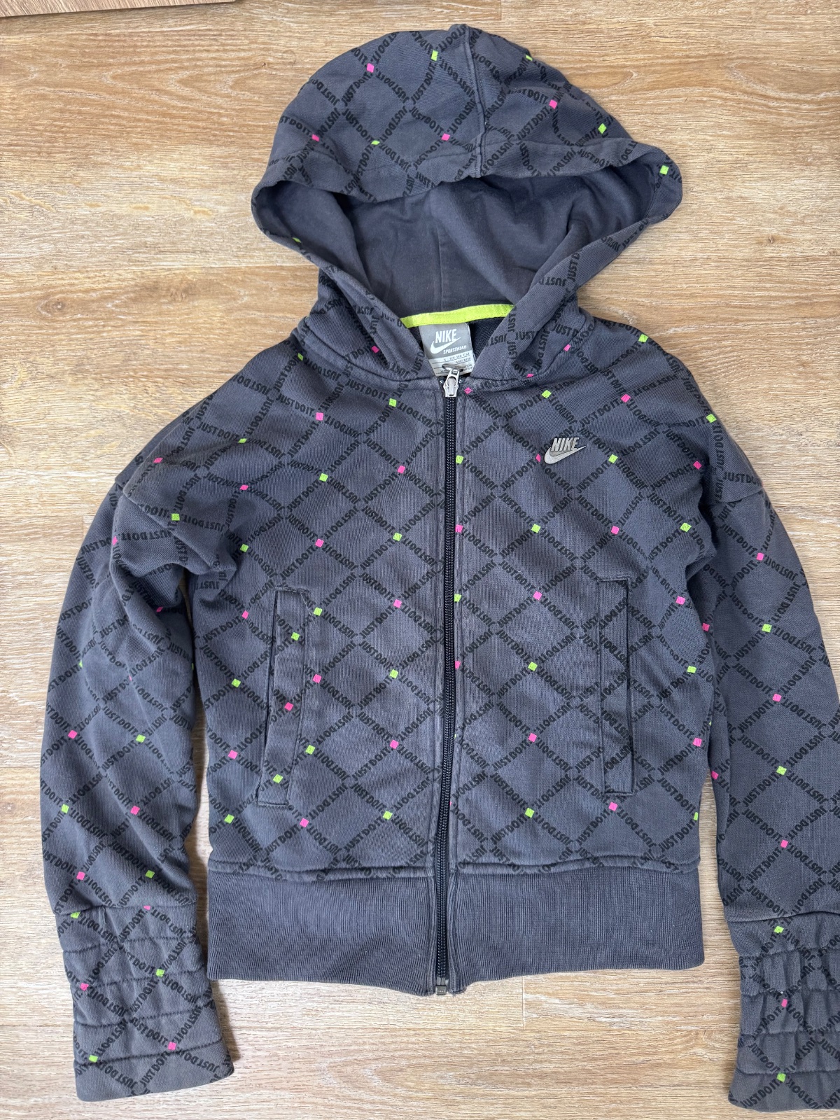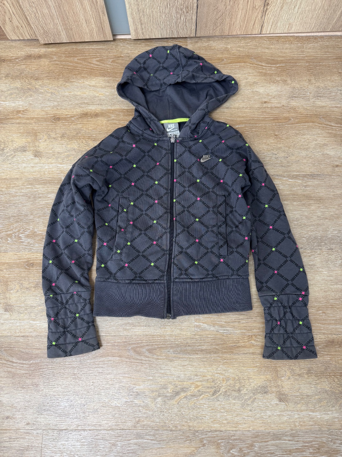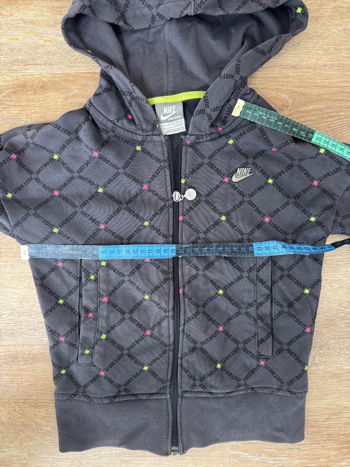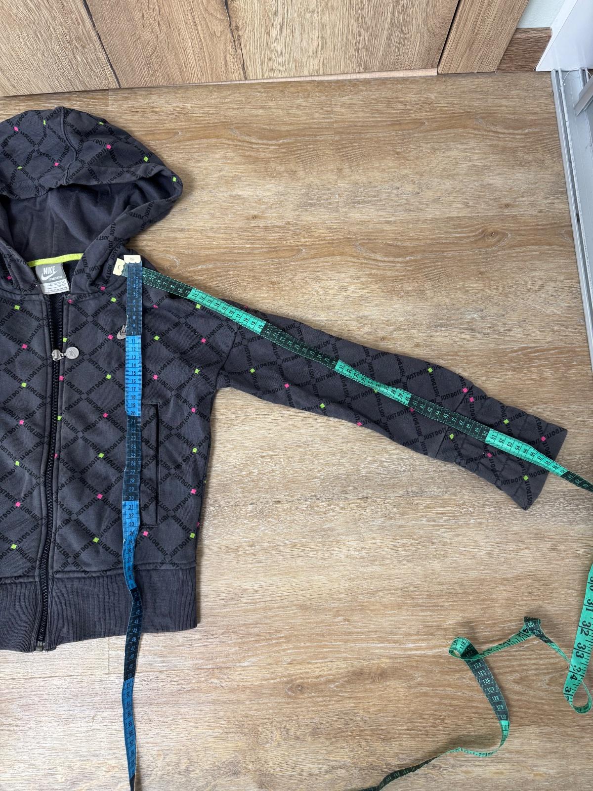Ponúkam nosenú Nike mikinu na zips v peknej tmavošedej farby. Je vo veľkosti cca 8-10rokov ale prikladám aj rozmery. Bola nosená, no naďalej v peknom stave. Poštovné podľa taríf.