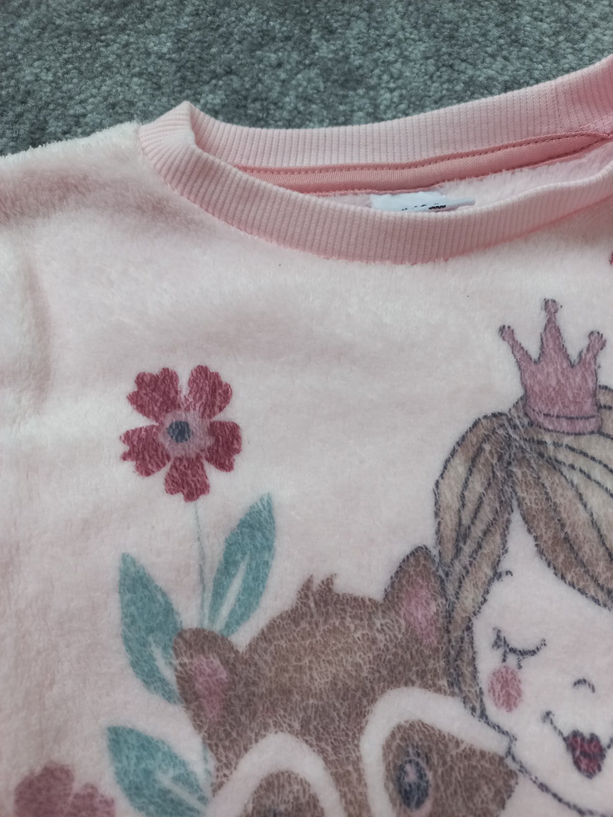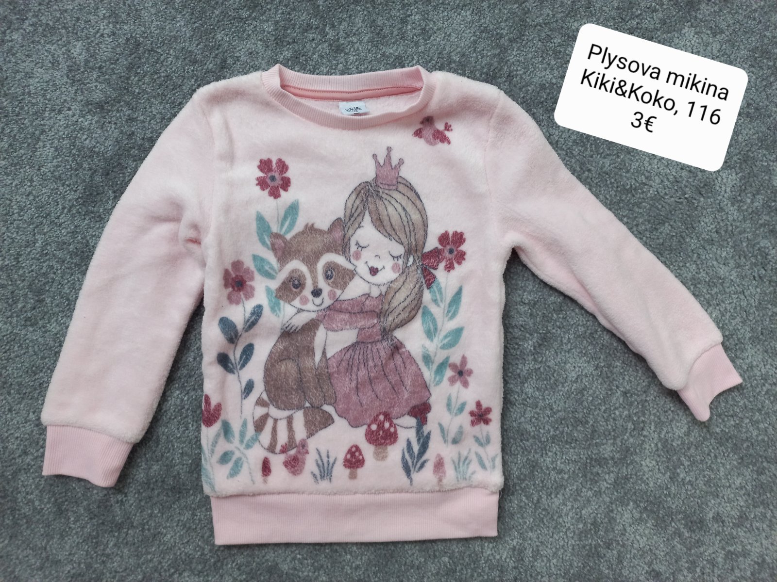 Svetlo ružová mikina, jemné žmolky, píše veľ. 122 je z Kik, len sa mi zdajú dosť kratšie rukávy. riaďte sa rozmermi: dl.46 cm, š.40 cm, od ramena 40 cm Cena: 1,50 €