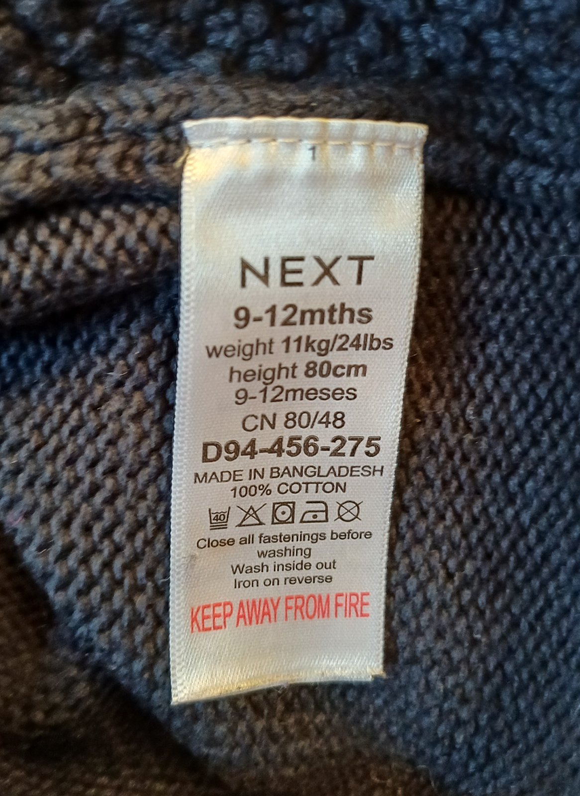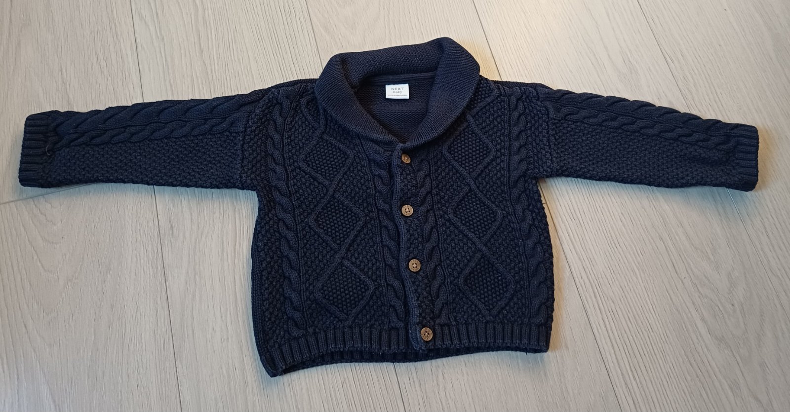 Krasny pleteny sveter NEXT so zapinanim na gombiky, farba tmavomodra, vel. 80. Vpredu krasny vzor, vzadu bez vzoru. Obleceny len parkrat na spec. prilezitost.