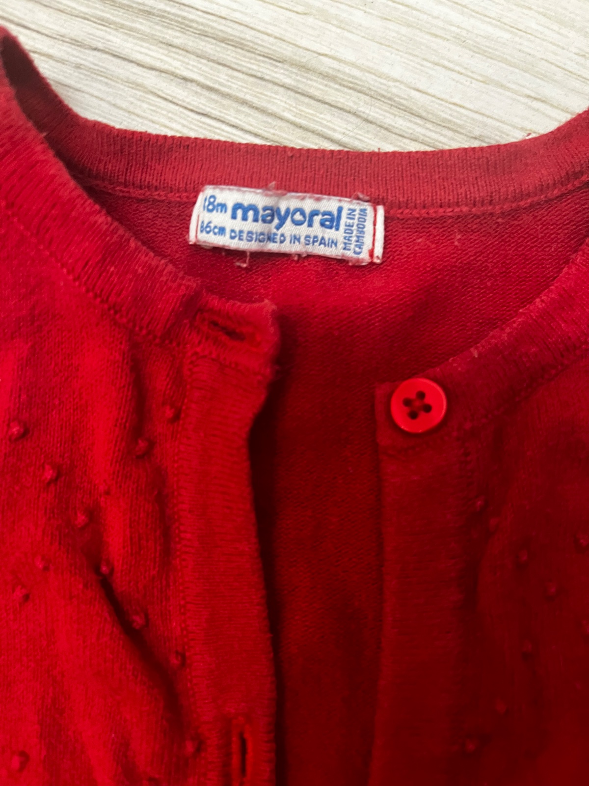 Predám jemne vzorovany červený svetrik so zapínaním na gombíky. V spodnej časti je volánik. Značka: Mayoral, veľkosť: 86 (12-18 mesiacov).