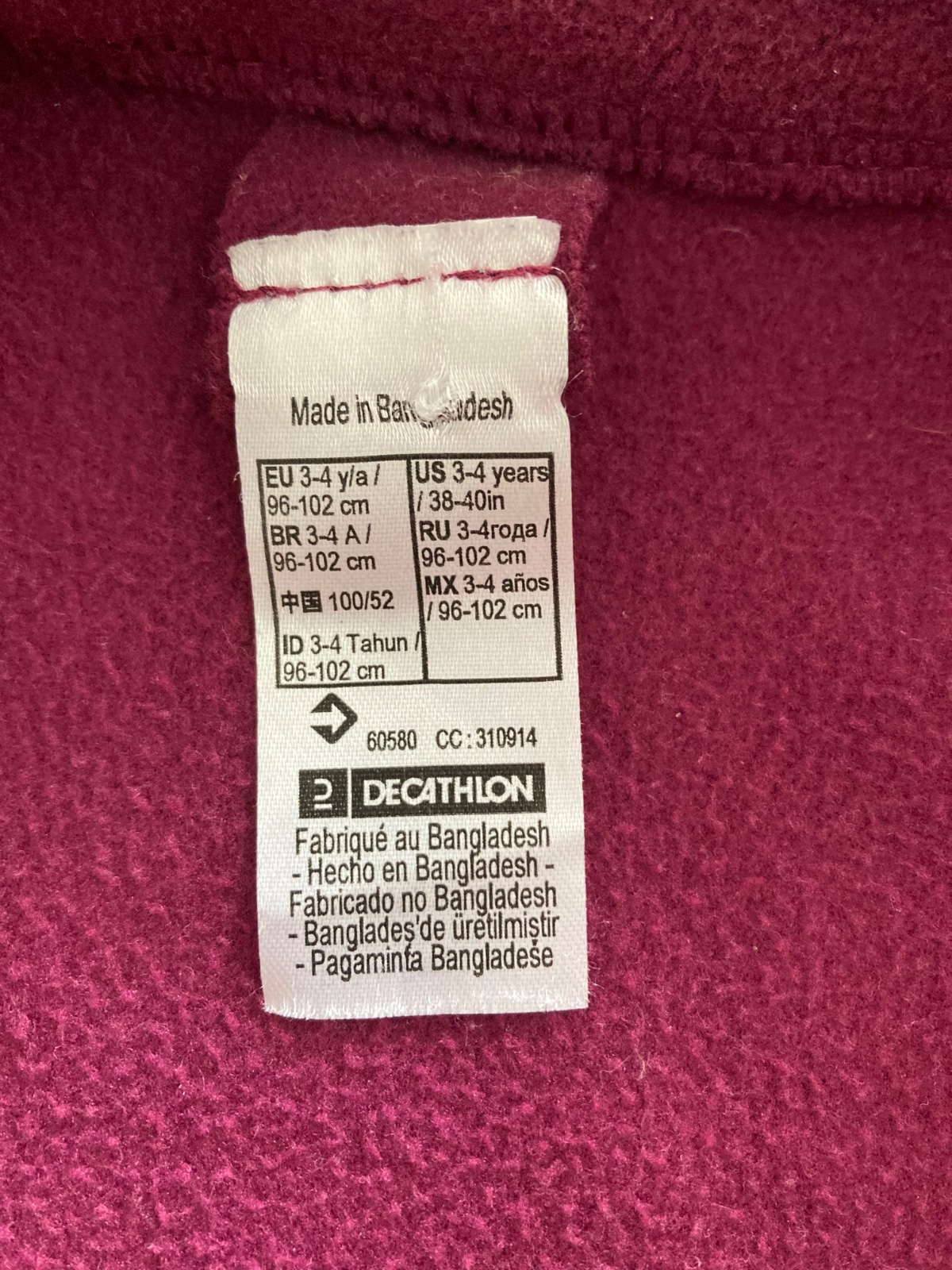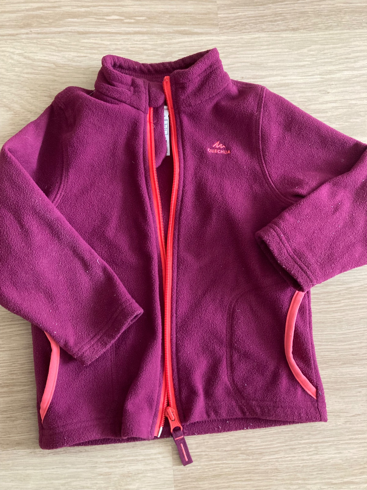 Dievčenská športová mikina z decathlonu. Zapína sa na zips, ma po bokoch vrecka. Material flis. Par krat oblečená. Pri vrecku mini fliacik neviem z čoho. Inak vsetko funkčné, bez chybičky. Veľkosť piše 96-102, sedí na velskost 98-104.