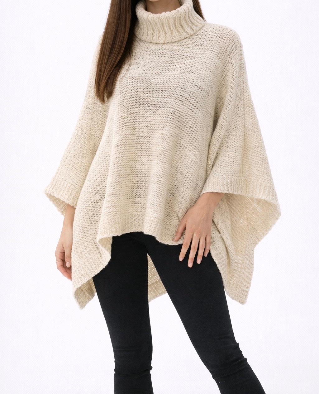 Elegantné vlnené pletené pončo / oversized sveter/ rolák v nadčasovom krémovo-ivory odtieni, minimalistického štýlu. Kúsok pôsobí veľmi luxusne vďaka kvalitnej vlne a výraznej hrubej pletenine.