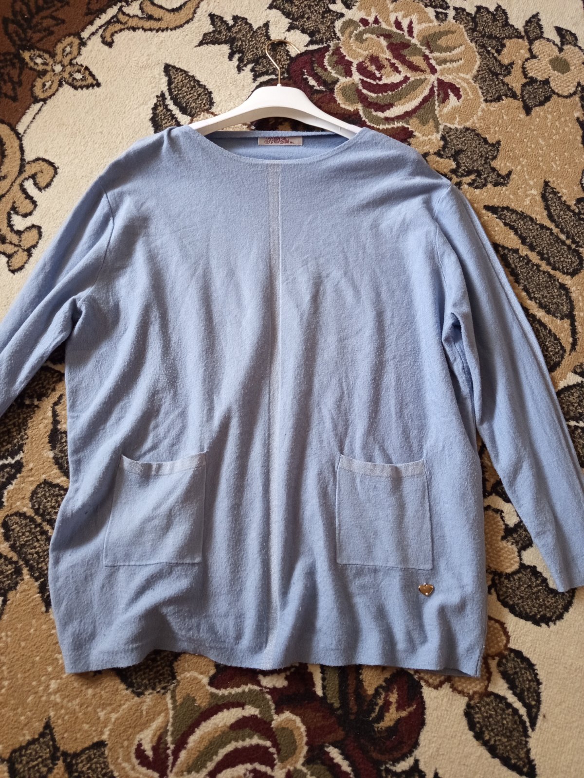 Sveter veľkosť L cena 4,30 eur, pekný stav, farba modrá s potlačou vtacikov