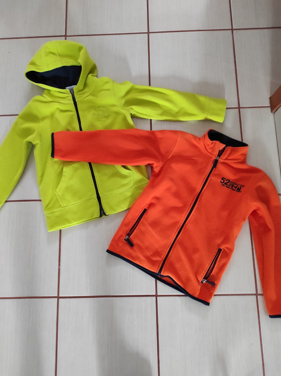 Mikiny v nosenom stave. Majú žmolky . Bez dier, fľakov. Vhodné na doma na sánkovačku, lyžovačku. Teplé super vhodné pod bundu. Alebo na behačku von na jar, na jeseň. Jedna má kapucňu a druhá nemá .