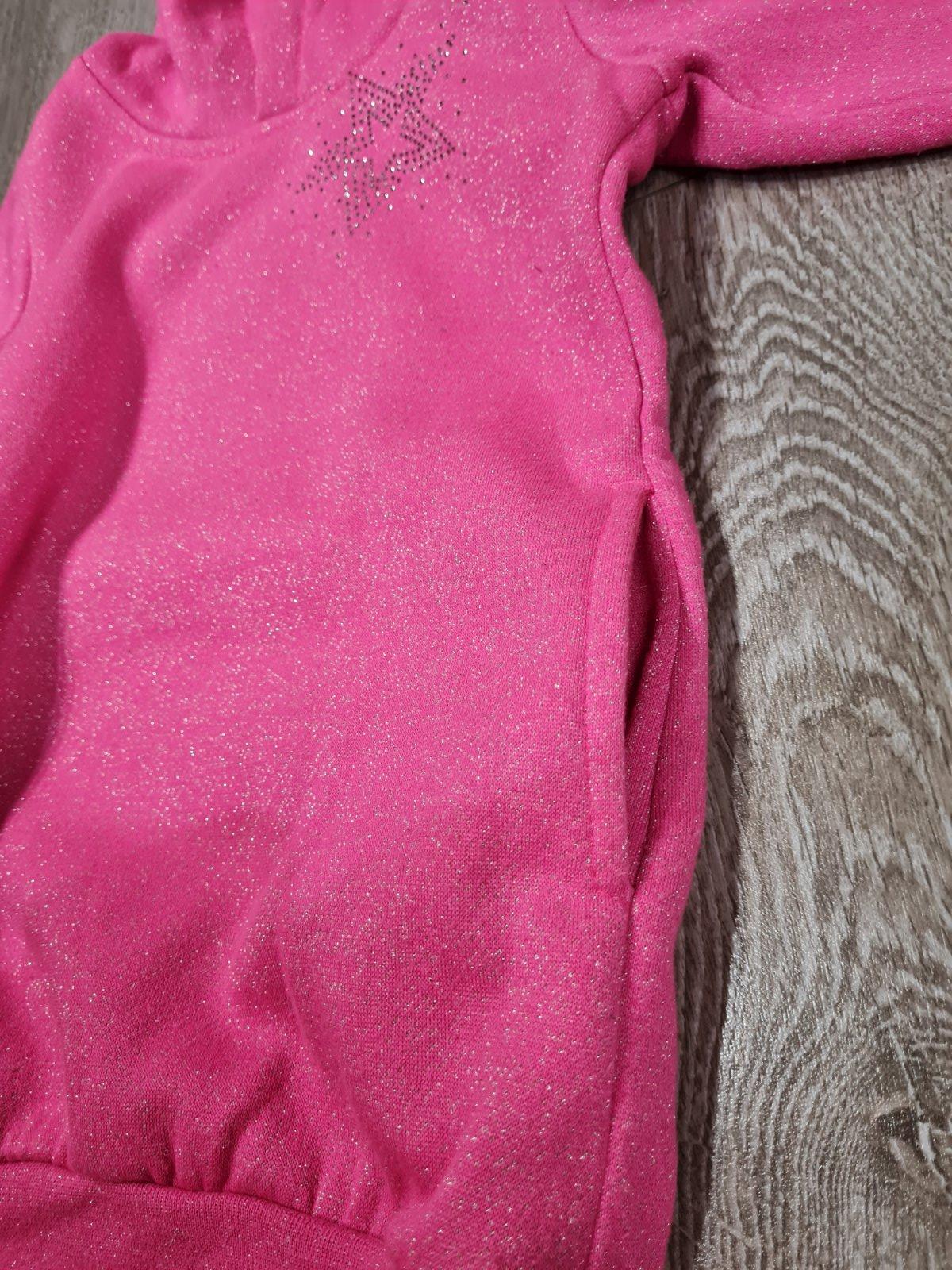 Veľmi pekná, tenká mikina vhodná na športovanie a telesnú výchovu. Farba je krásna krikľavo-ružová doplnená zelenou. Dĺžka 49cm, šírka 2x39 a dĺžka rukáva od krku 55cm.