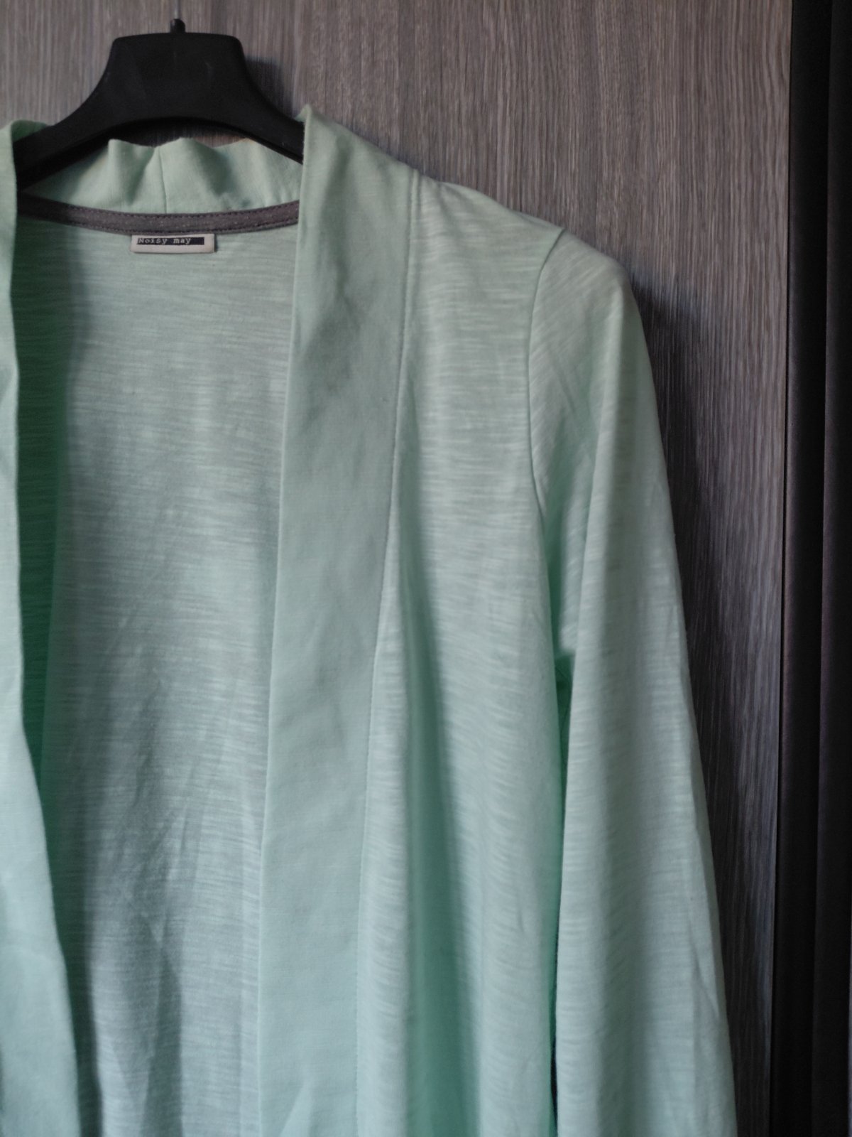 posuniem 1x oblečeny sveter mne su dlhé rukávy po bokoch má razporky, farba je jemna mätova