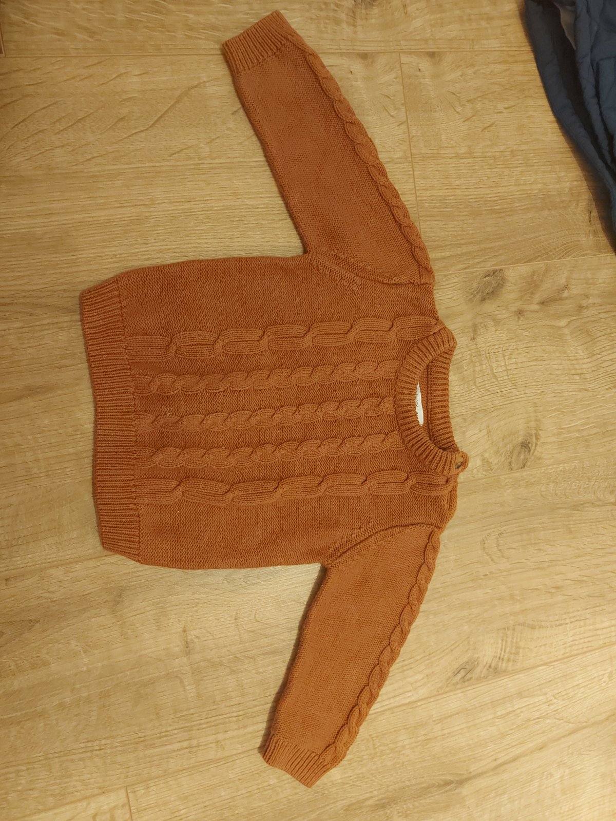 Pulóvrik je nosený, mali sme ho radi. Je bez poškodenia, ale žmolky sa nájdu. Zapínanie pri krku na gombičky, dvojvrstvový vzhľad. Dĺžka 30 cm, šírka 28 cm, rukáv 26 cm.