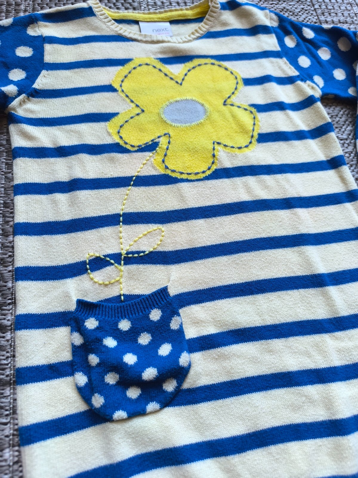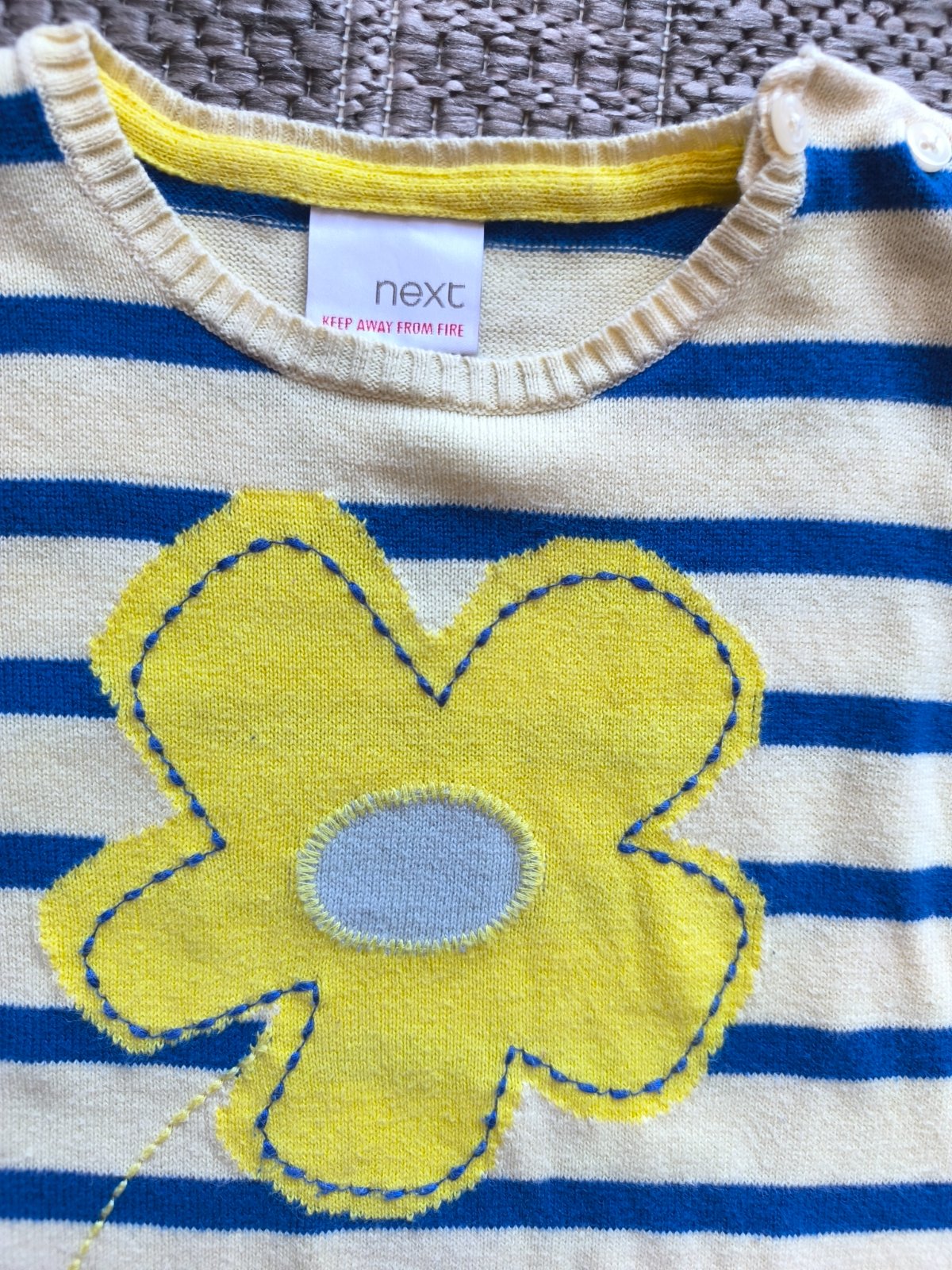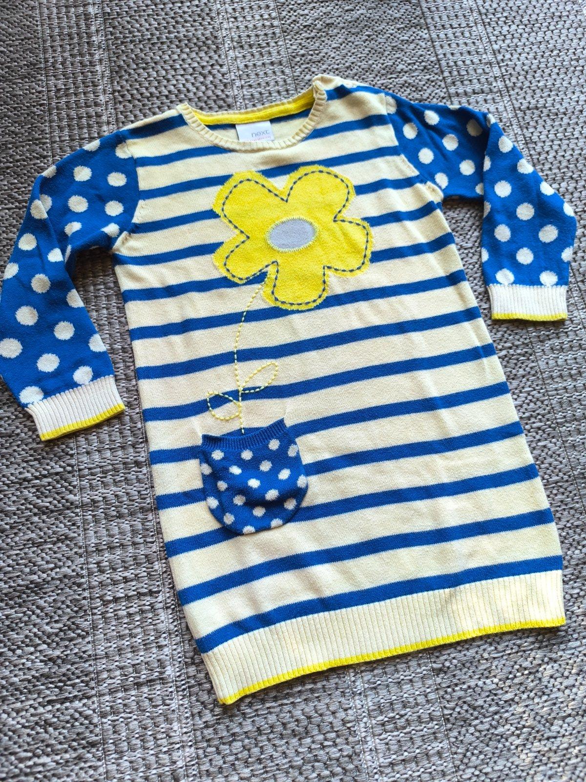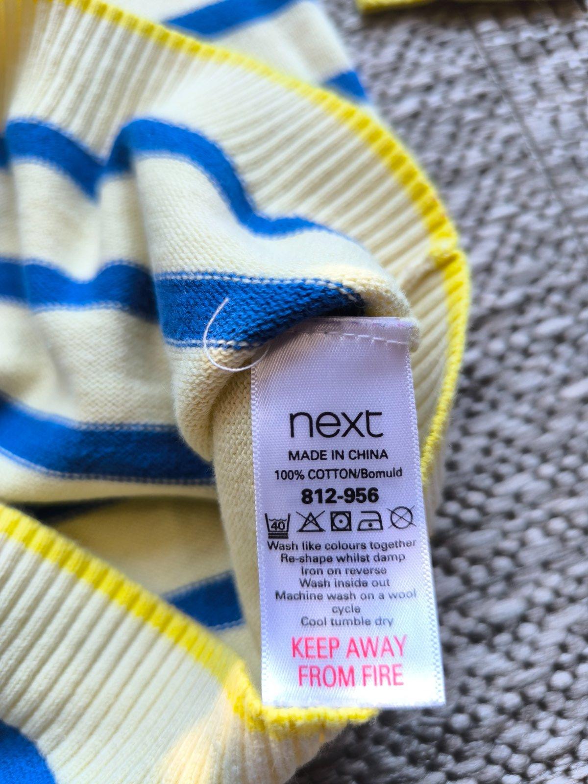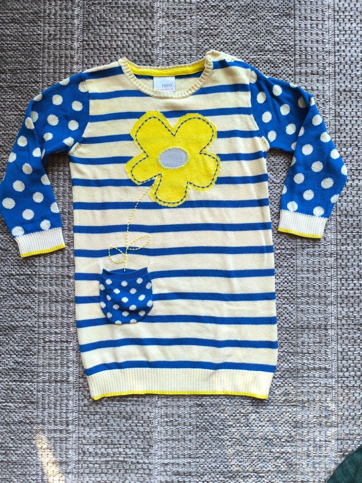 Predĺžený tenký svetrík, svetríkové šaty. Značka Next, vo veľmi dobrom stave, len vzadu na spodnom leme je fliačik - pozrite poslednú fotky. Dĺžka 54cm, šírka 32cm, rukáv od krku 34cm. 100% bavlna.