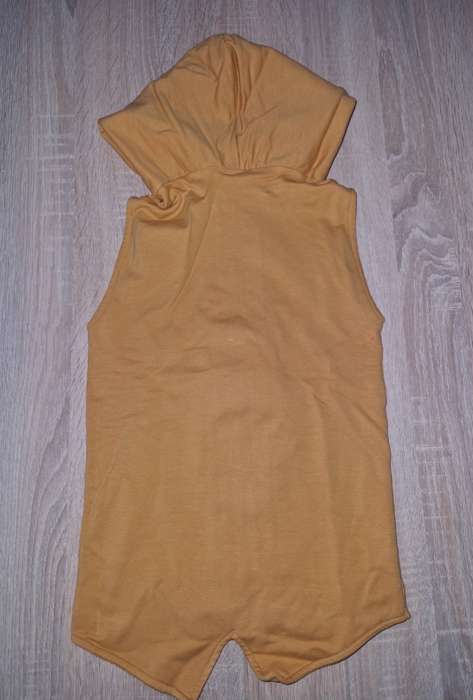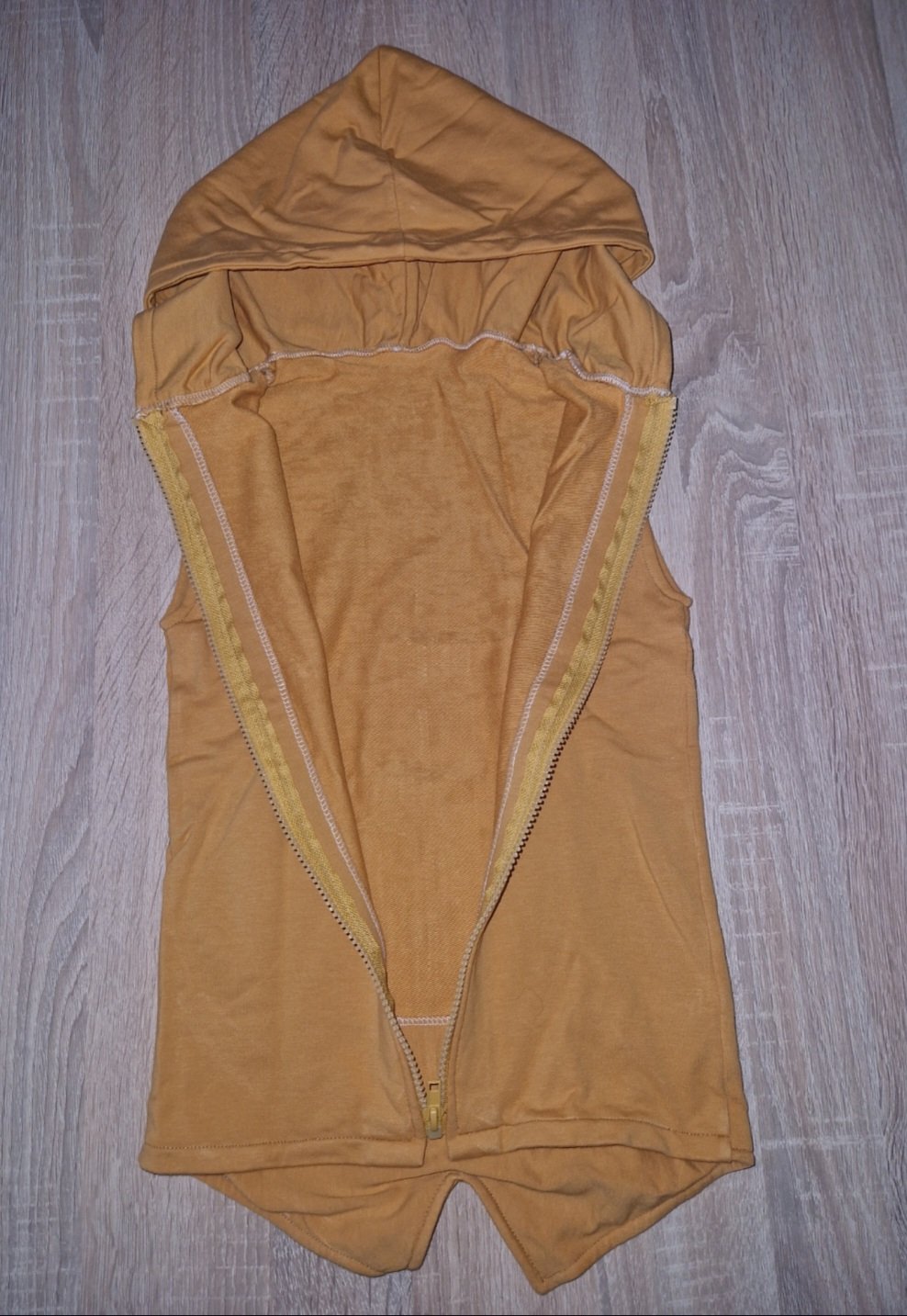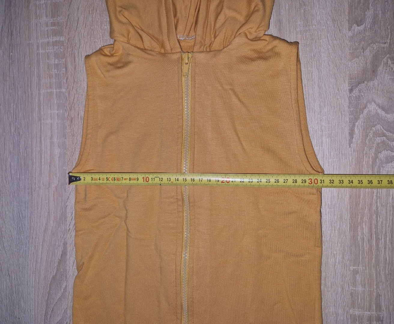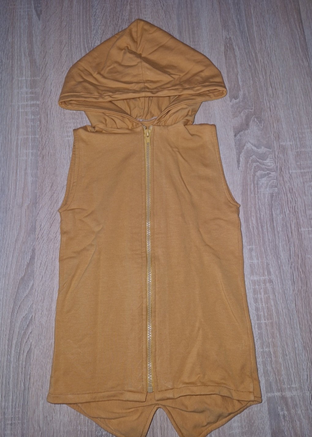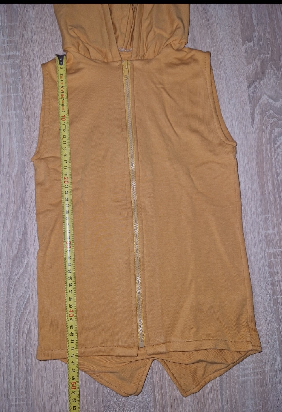 Vesta na zips s kapucňou, predĺžený strih, veľkosť 134, handmade, top stav, cena 10 €.