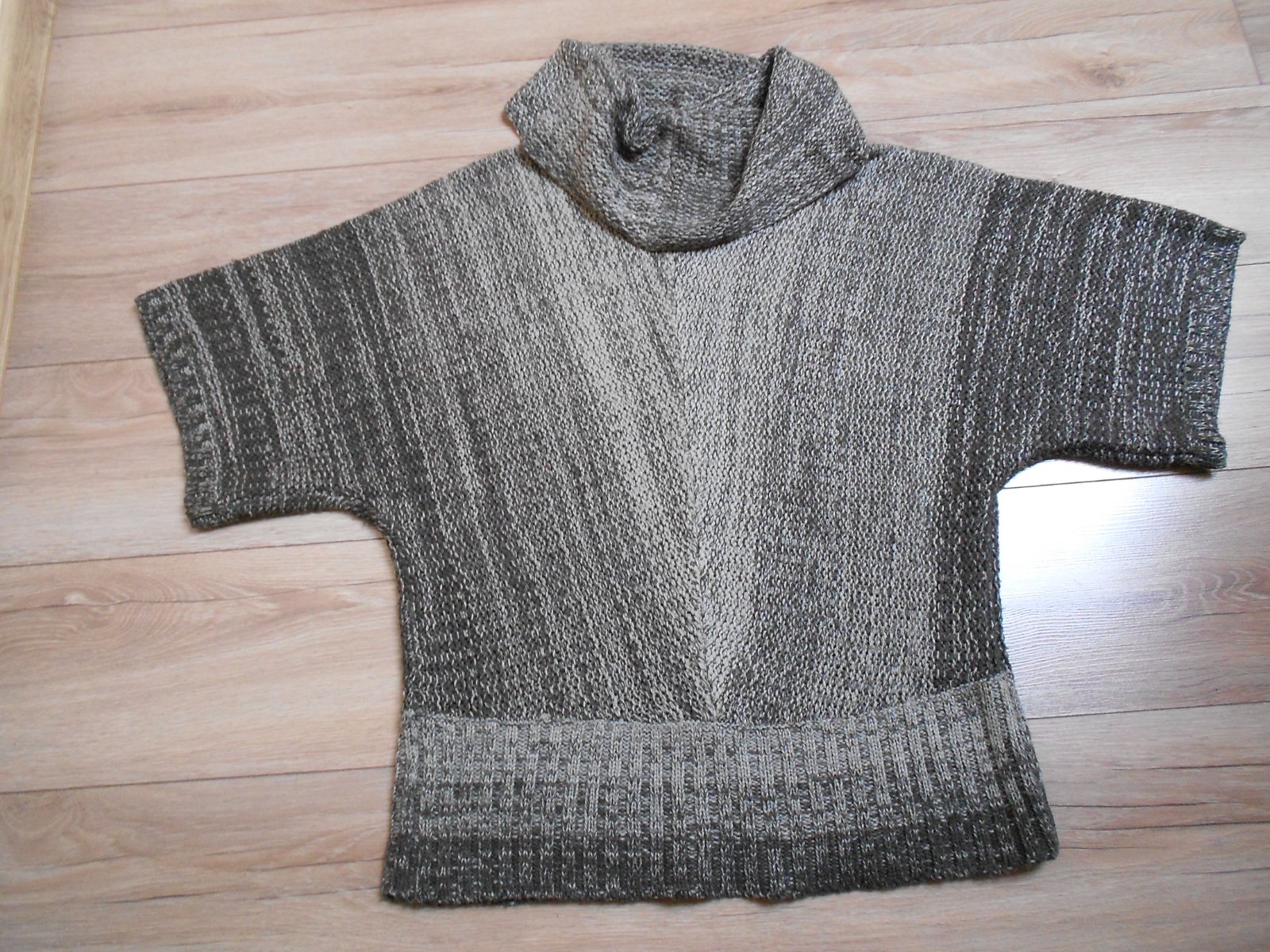 Pletená vesta s krátkymi rukávmi ,veĺkosť 44-46. Dlžka 50 cm,cez prsia 132 cm,rukávy s dkžkou 20cm,ukončené manžetou. Bez poškodenia.