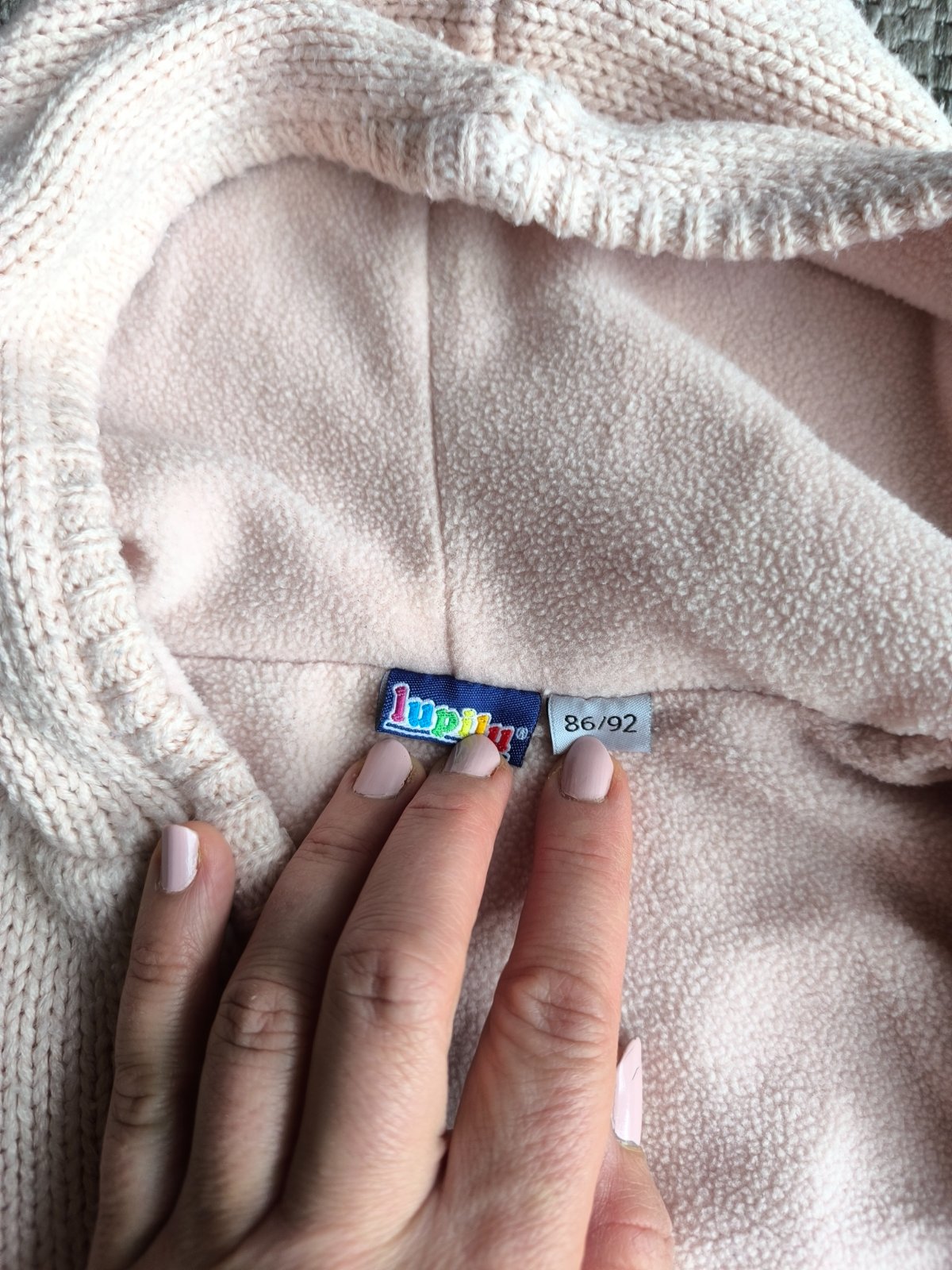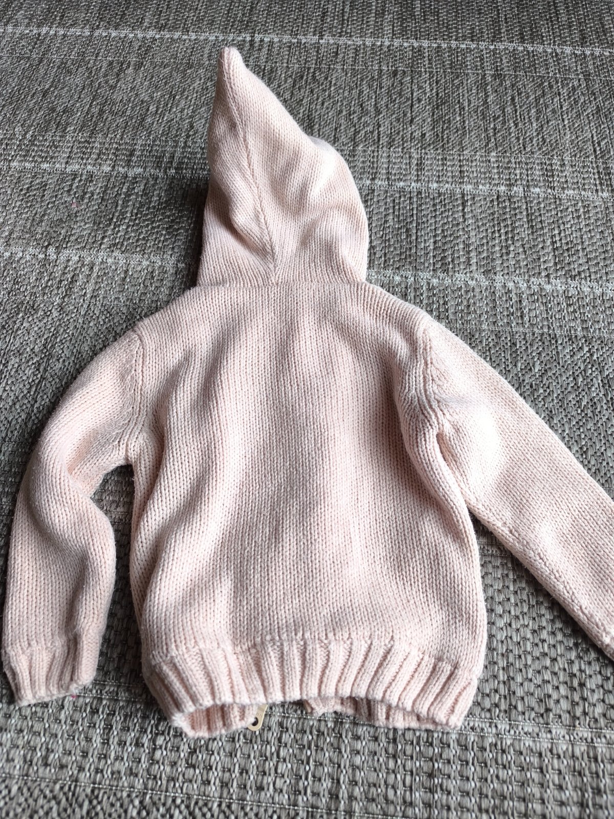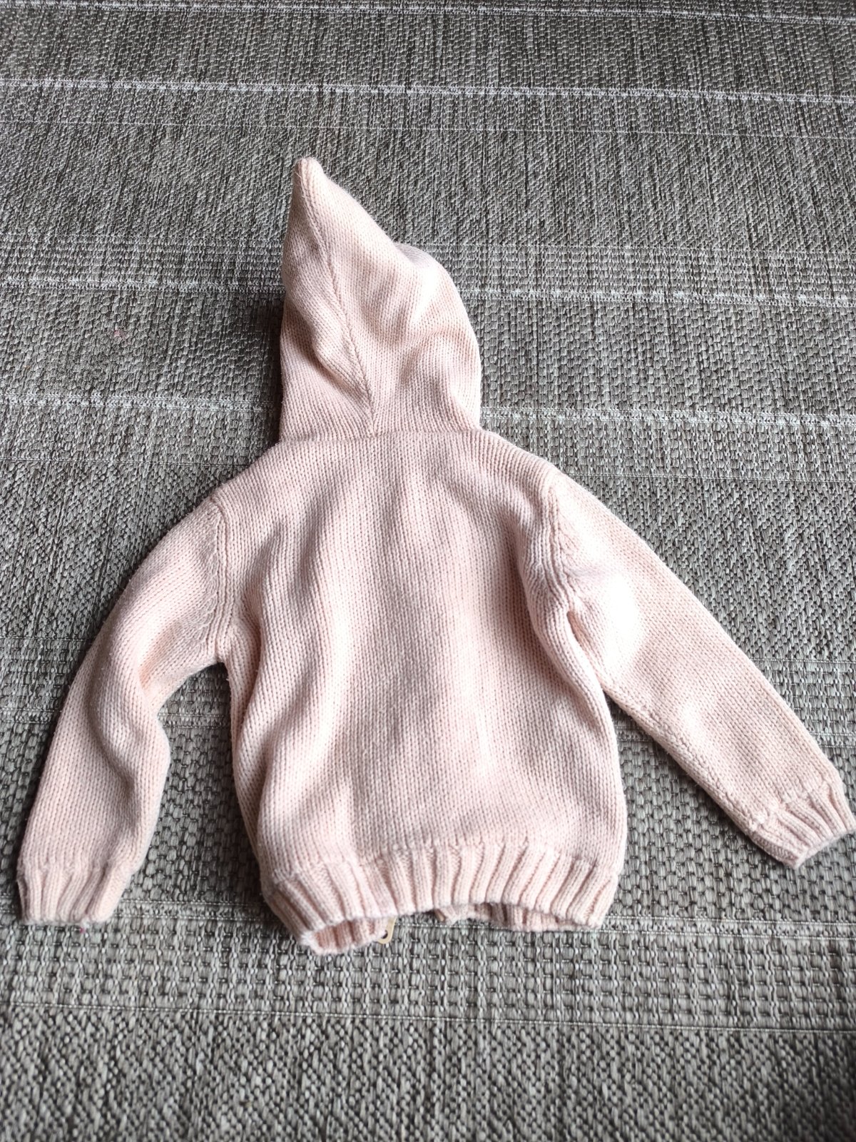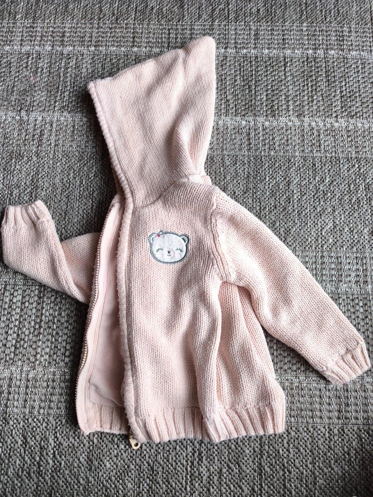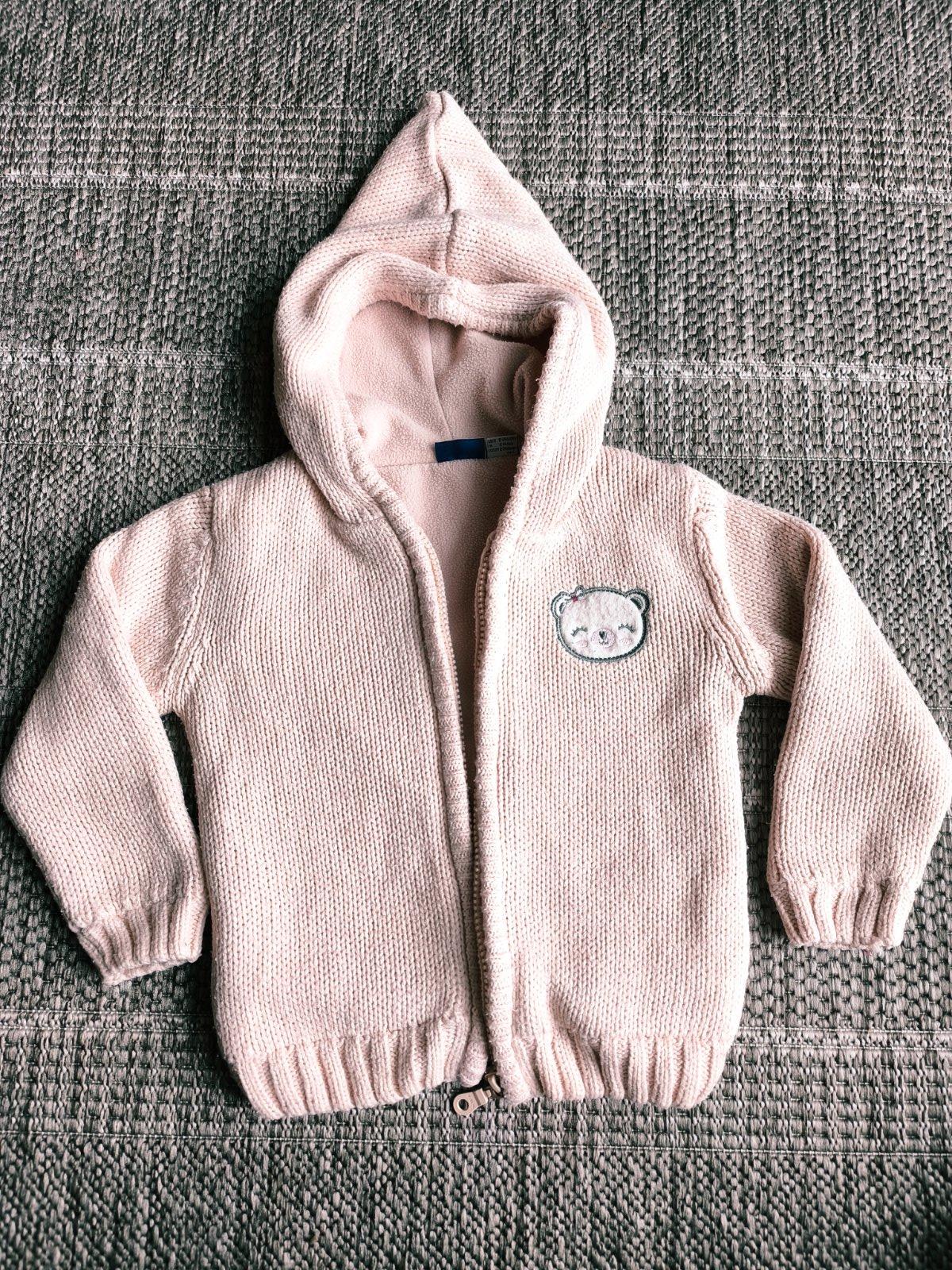 Zateplený sveter, podšitý flisom. Bledunká lisisová, alebo marhuľová farba. Rozkošná spucatá škriatkovská kapucňa. Dá sa nosiť ako mikina pod bundu, alebo aj ako vrchná vrstva v prechodnom období. Vo veľmi dobrom stave. Veľkosť 86/92, 18-24 mesiacov, dĺžka 36cm, šírka 30cm, rukáv od ramena 32cm.