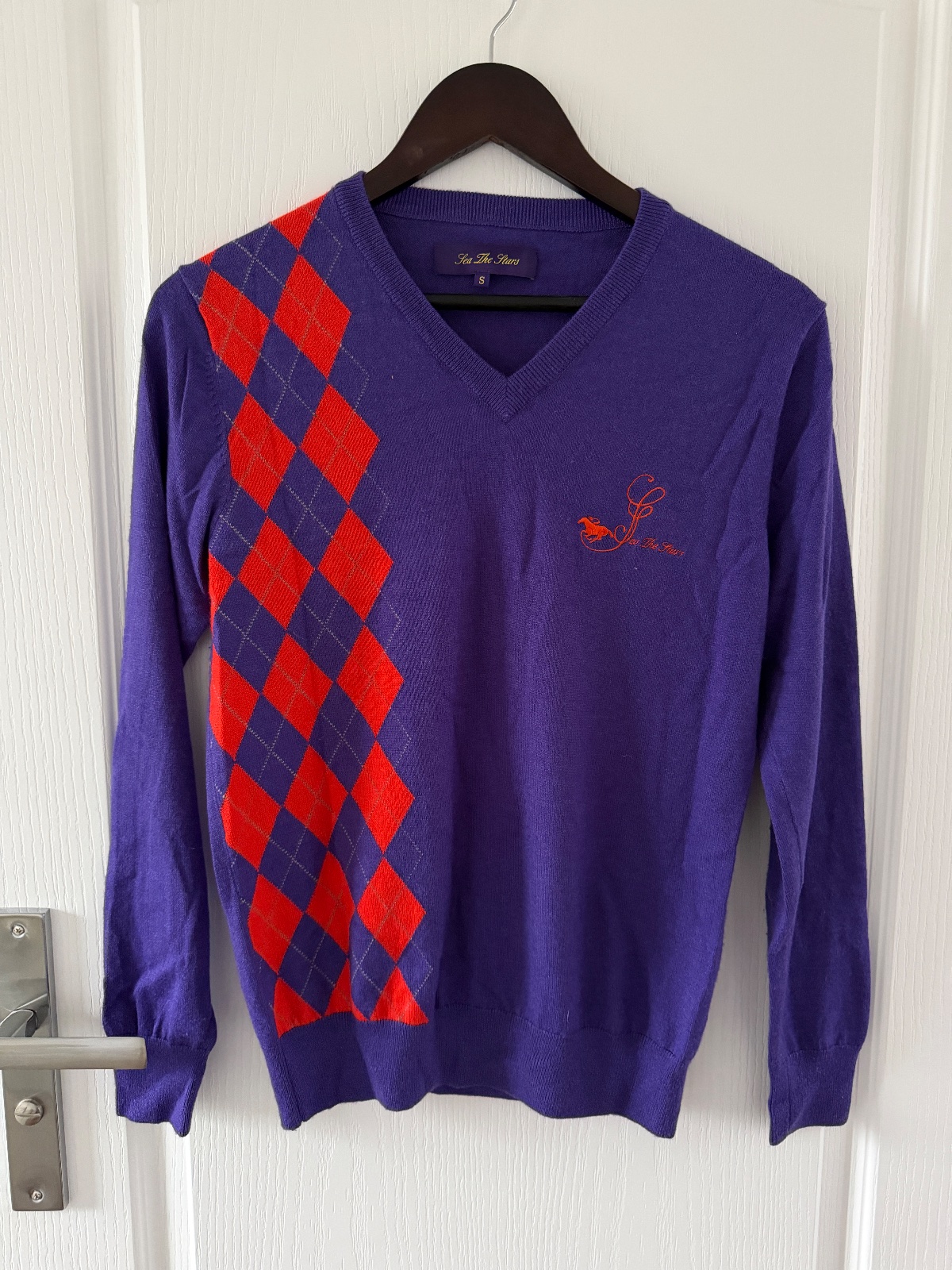 Fialový sveter zo zmesi vlny, hodvábu a kašmíru s oranžovými akcentmi. Má výstrih do V. Ľavú stranu svetra zdobia oranžové diamanty, zatiaľ čo na pravej strane je vyšívané logo značky. Sveter má krásne, 100 % prírodné zloženie: 70 % merino vlna, 20 % hodváb a 10 % kašmír. Štítok uvádza veľkosť S, šírka 46 cm a dĺžka približne 62 cm.