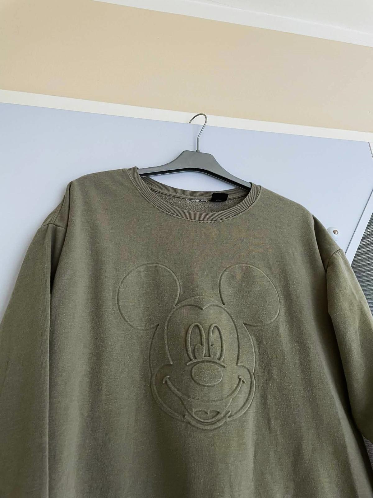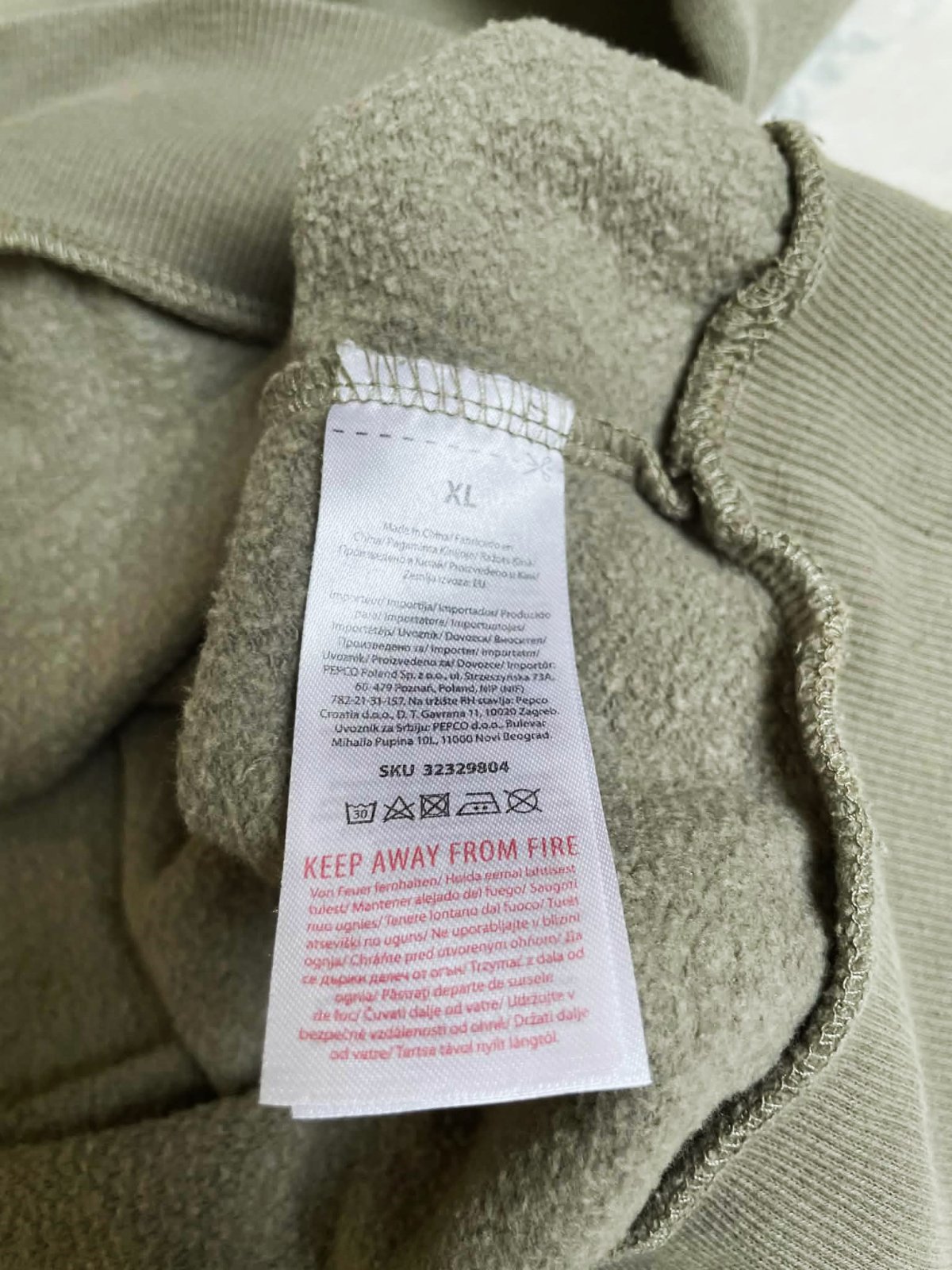 unisex mikina s plastickým potiskom,farba sivo- olivovovo zelená,uvedená veľkosť XL,ale podľa rozmerov väčšia,lebo sa nosí voľná ako over size