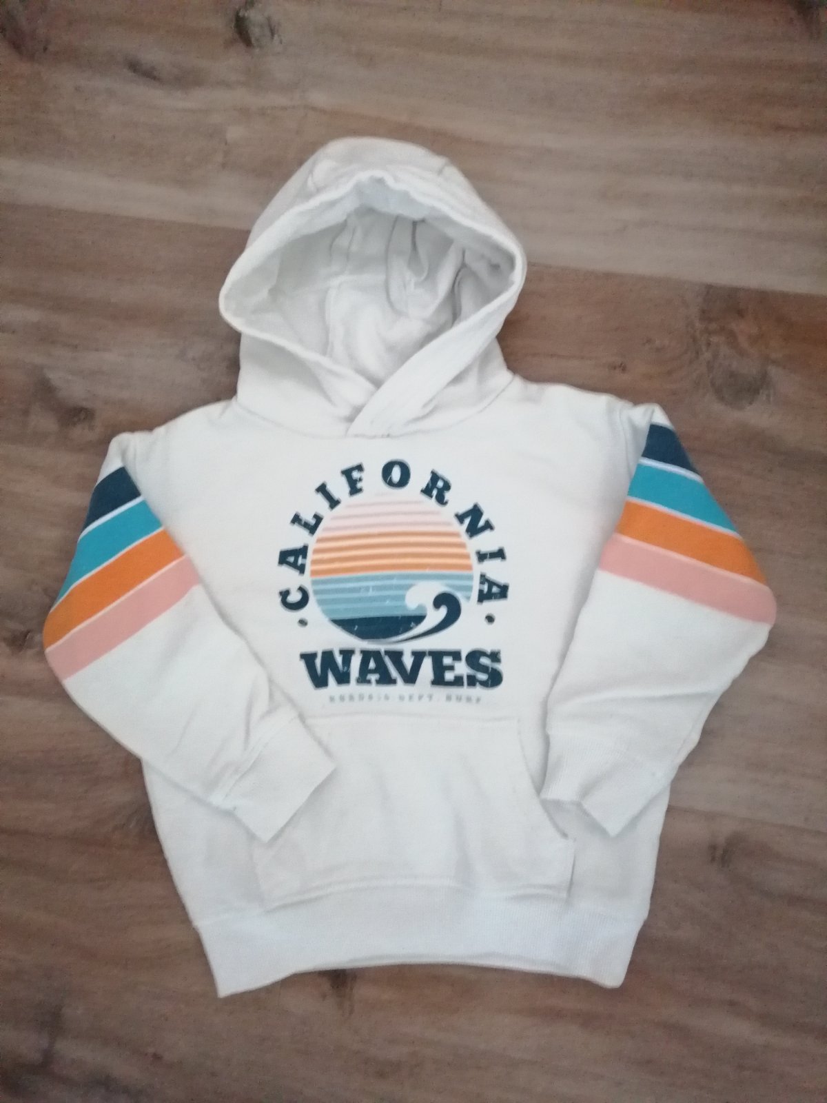 Pekná mikinka kupovaná od inej mamičky, bohužiaľ nám nesadla. Veľkosť pisana až 116 ale sedí tak 104/110 (dĺžka 41 cm). Farby už nie su také sýte, vidno trochu pranie, inak bez poskodeni.