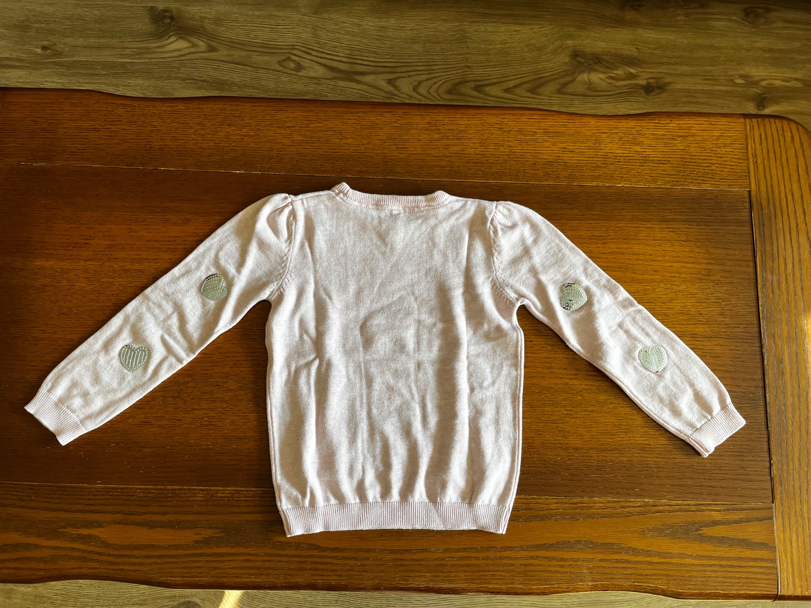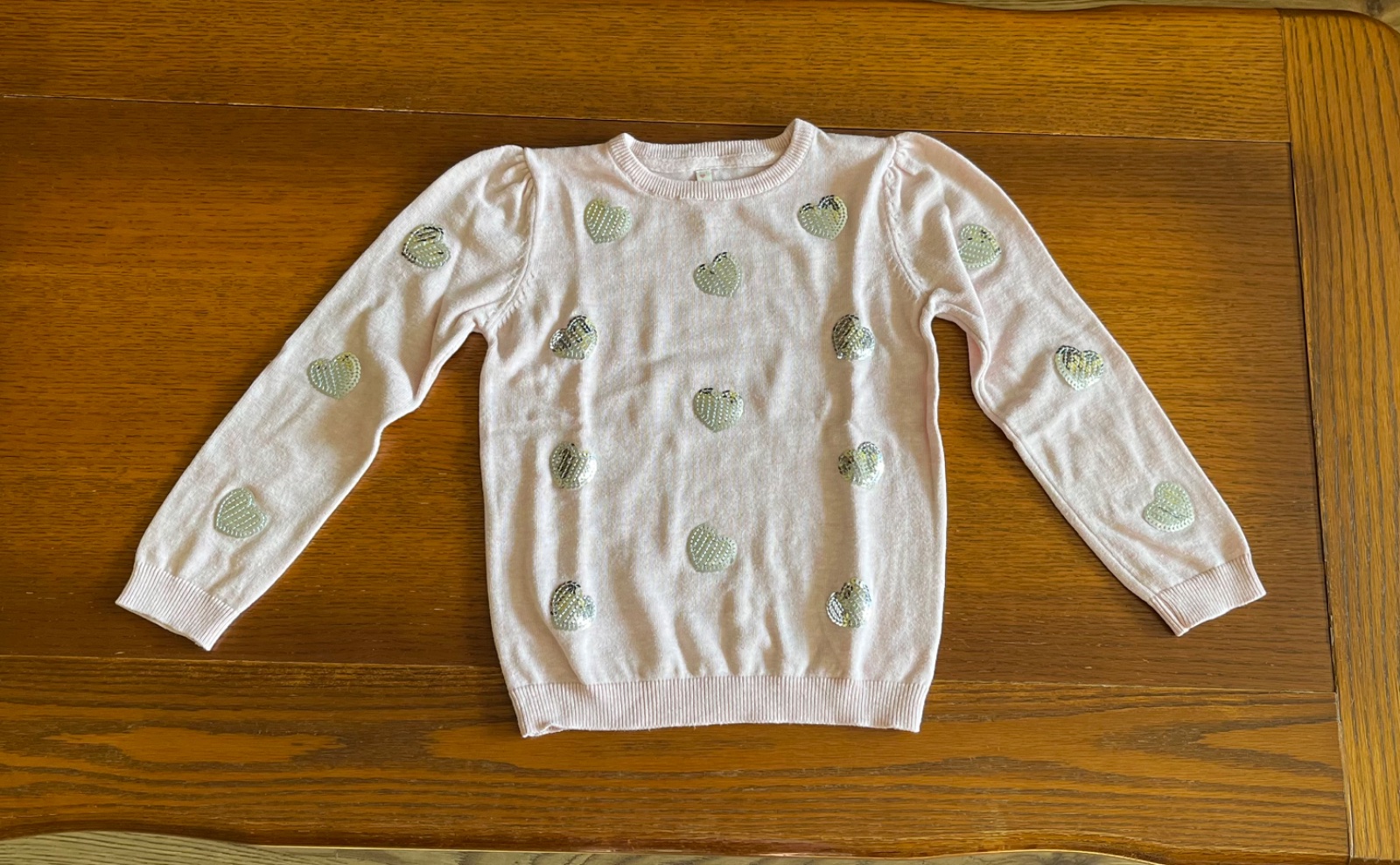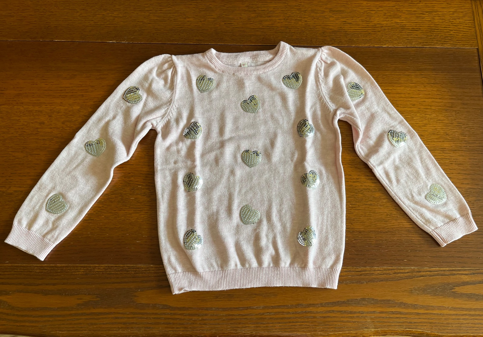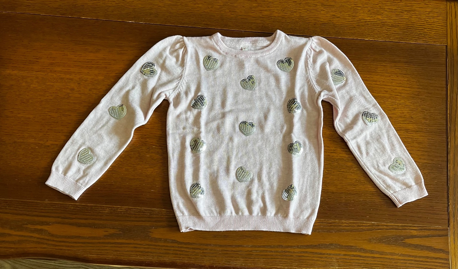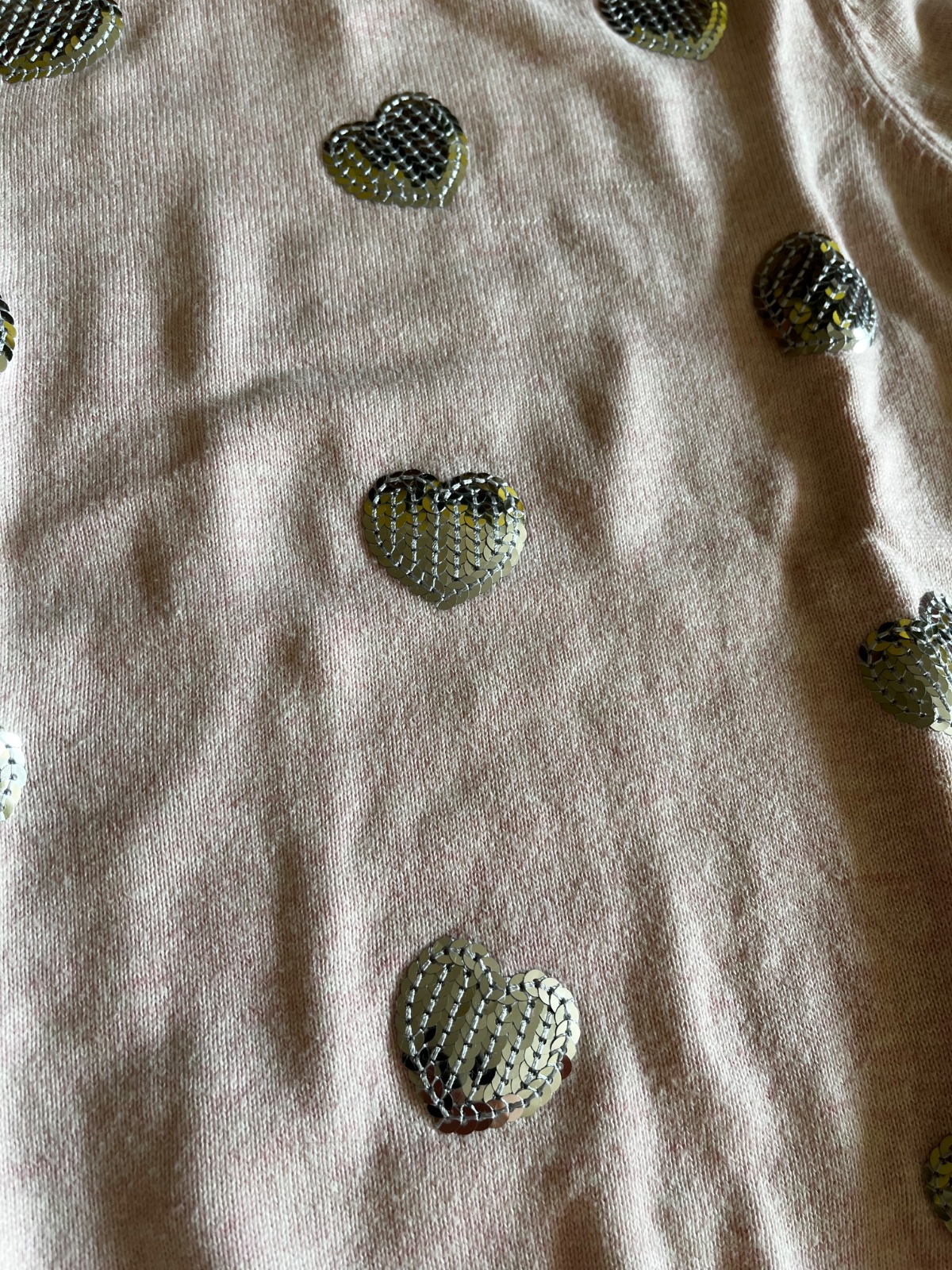 Pulóvrik je jemný, celoplošne so striebornými flitrovými srdiečkami vpredu aj na rukávoch.