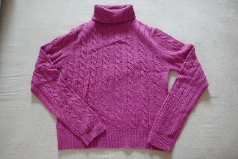 Raz oblečený cyklámenový roláčik, je tenší, nie je hrubý, osmičkový vzor, veľmi elegantný. Farba je taká cyklámenová alebo tmavoružová.