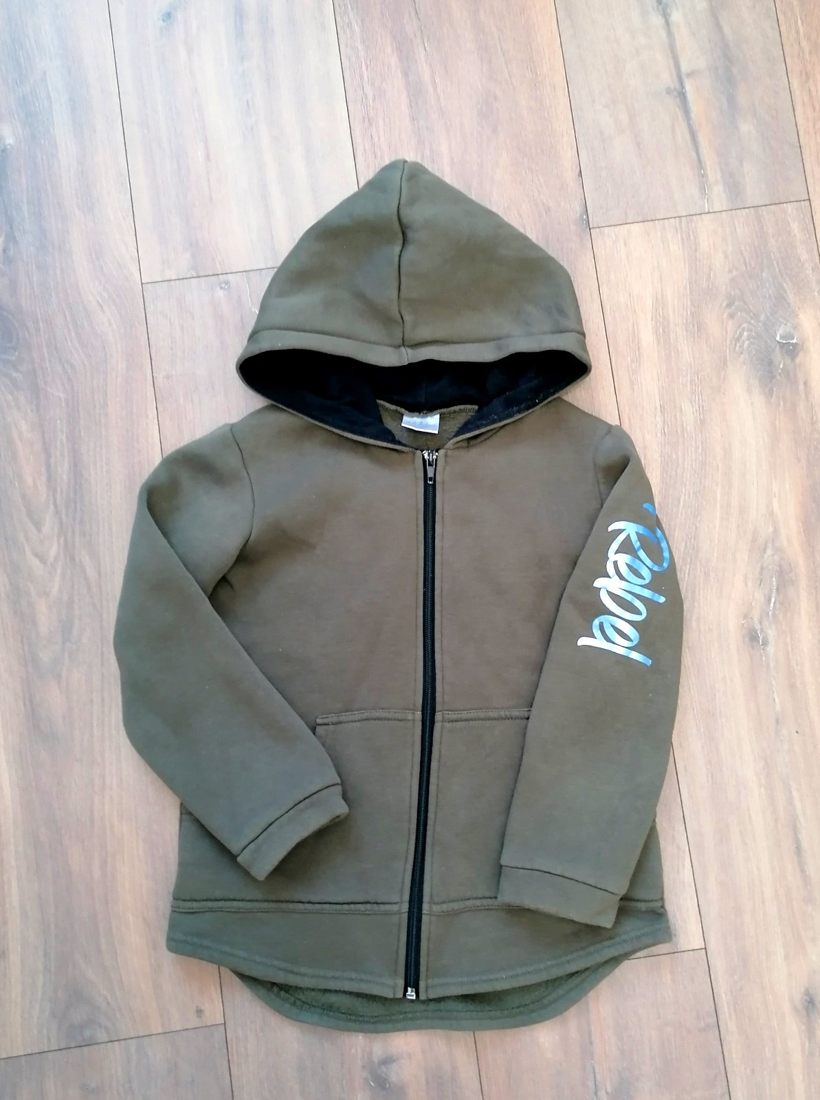 Pekná mikina, farba kaki zelená, zle sa to fotí. Na jednej ruke modrý napis Rebel. Štítok už dosť vybledol ale mala by to byt veľkosť 128,dlzka od krku po spodok prednej časti 48 cm, zadnej 51 cm. Bez poškodení, malinko vyblednuté praním môžu byť niektoré miesta (na konci rukávov napr.), inak pekný stav.