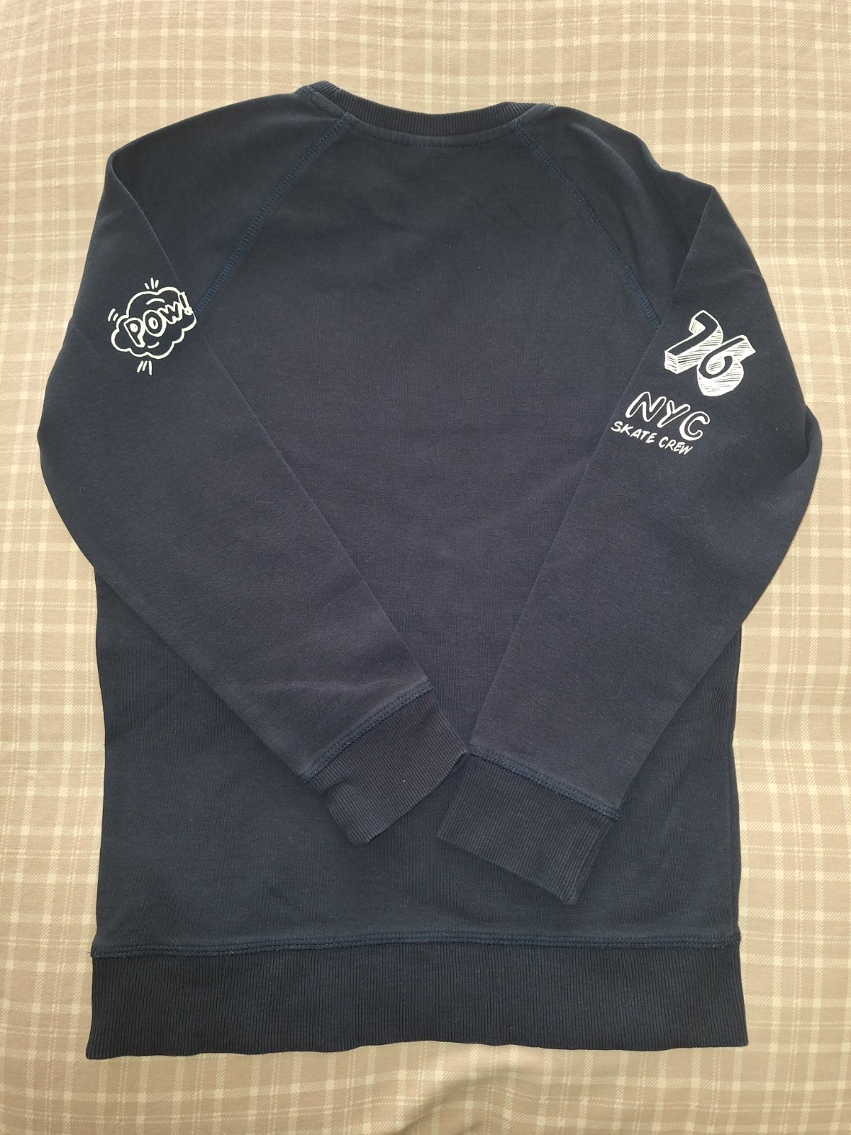 Posuvam malo nosenu mikinu 140 s potlacou vpredu a na rukavoch, dlzka rukavu od krku cca 58 cm, dlzka vzadu 58 cm, vpredu 51 cm, vyborny stav, darcek zdarma