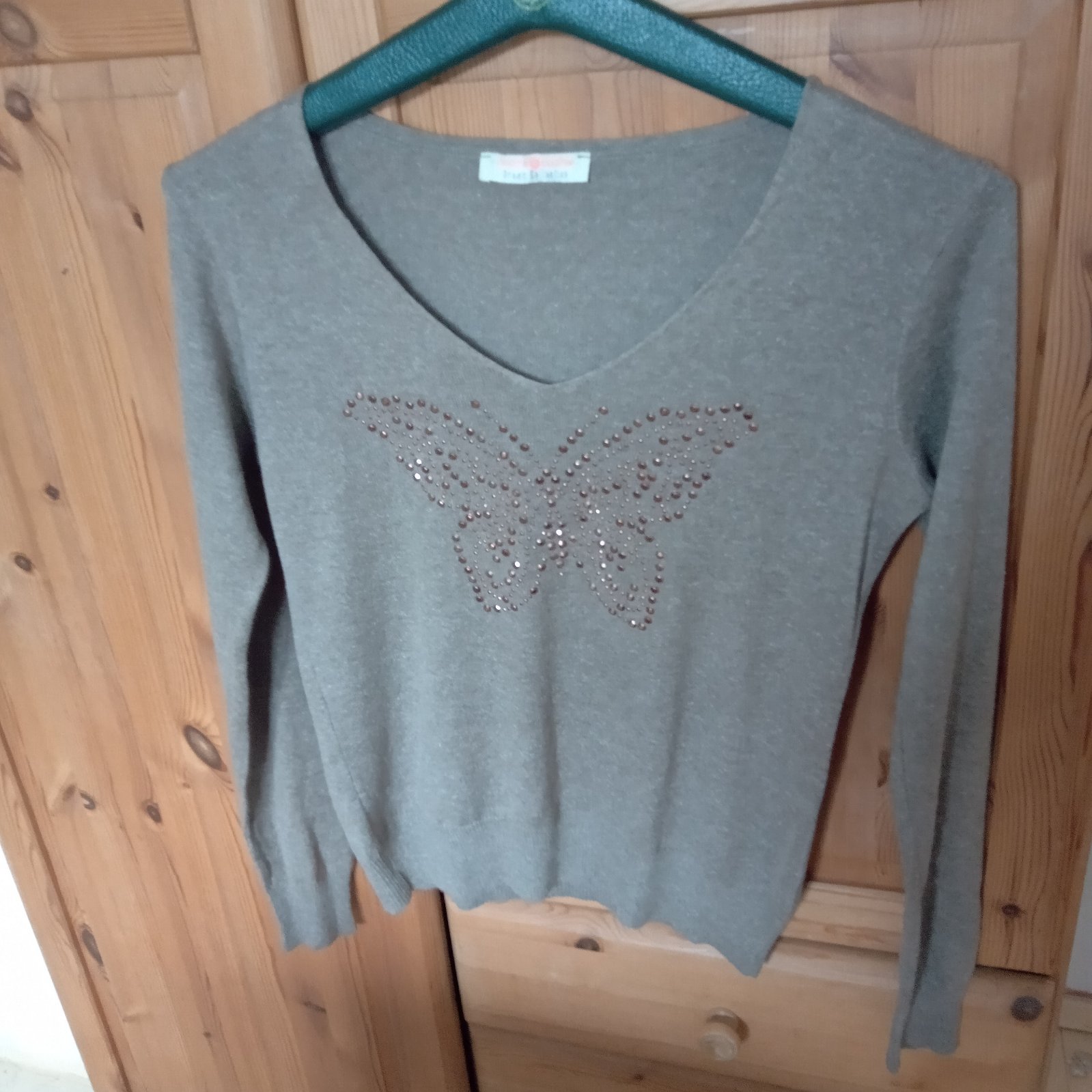 Predám svetlo hnedý pulóver s aplikáciou. Veľkosť 40, šírka v podpazuší 50cm, celková dĺžka 59cm.