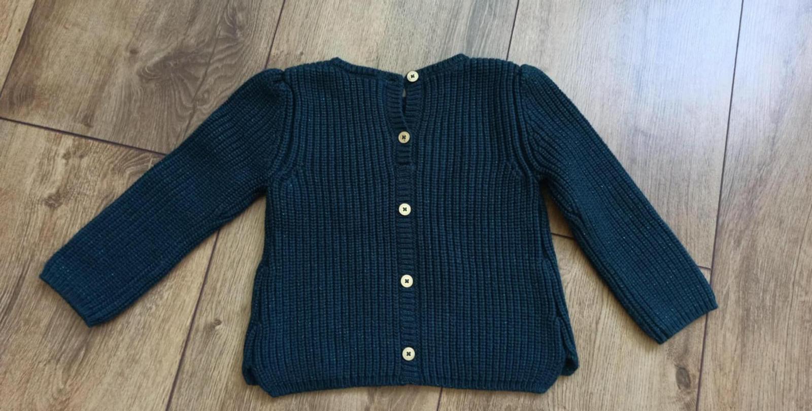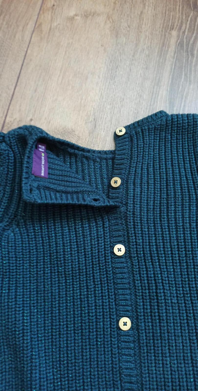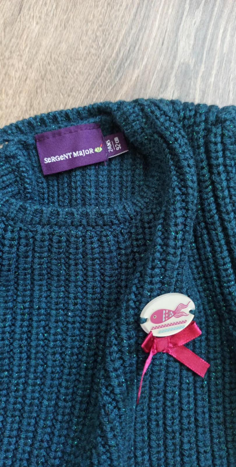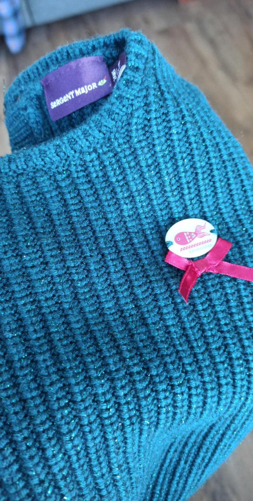 Krásny teplý svetrík s ozdobným zapínam na chrbte.Milá aplikácia vpredu. Nezničený, málo nosený, ,nevyťahaný.