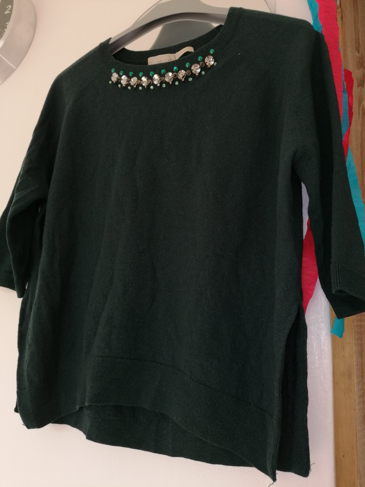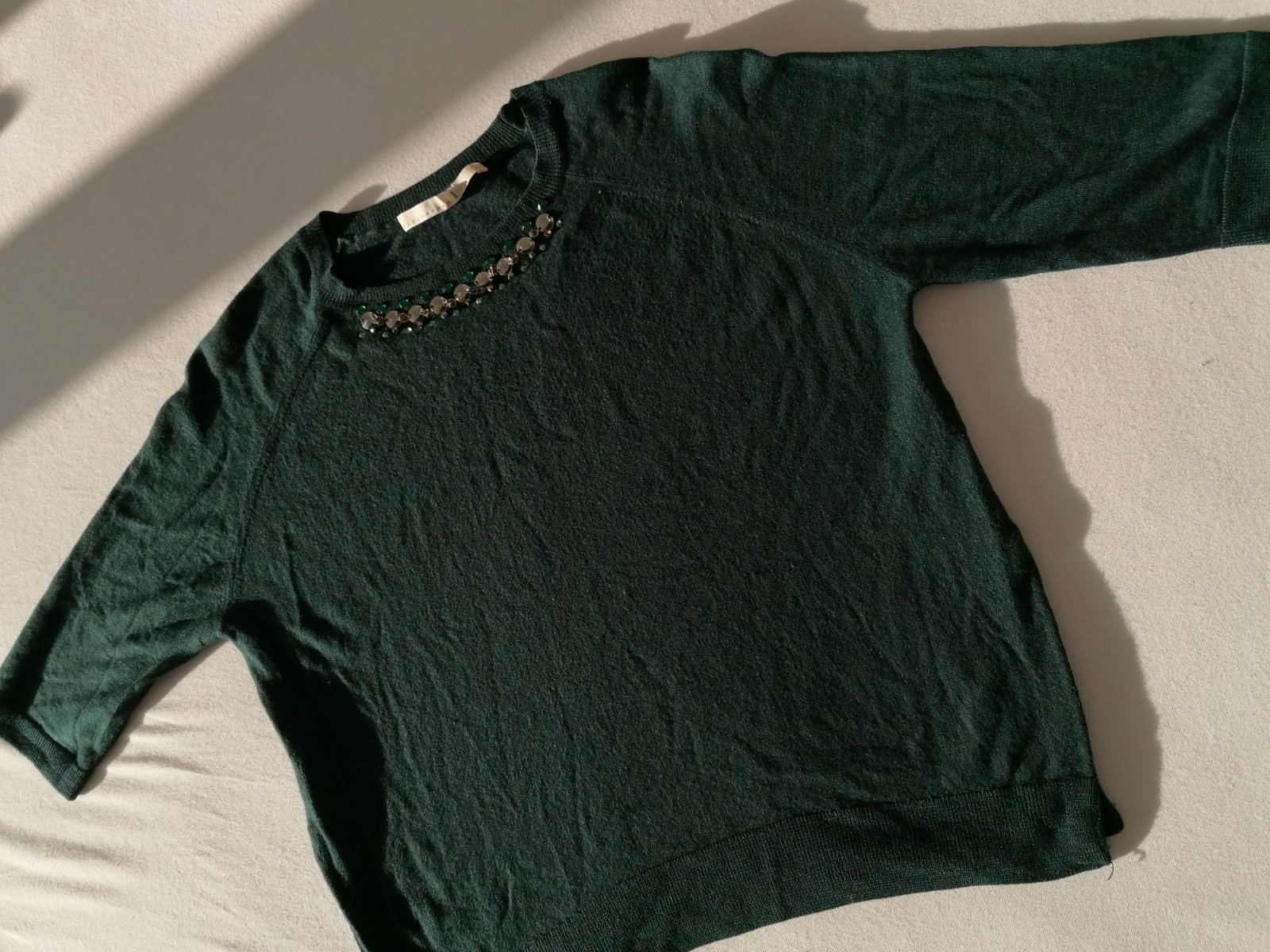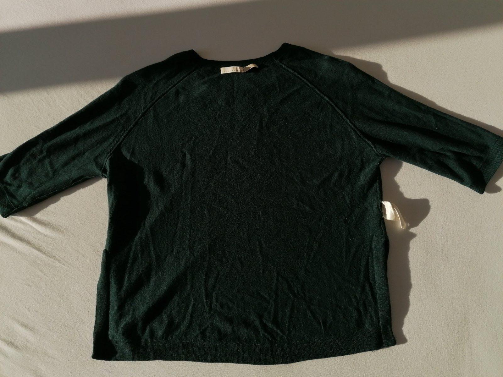 Tmavozelený sveter Tchibo s 3/4 rukávom sediaci na veľkosť M/L.