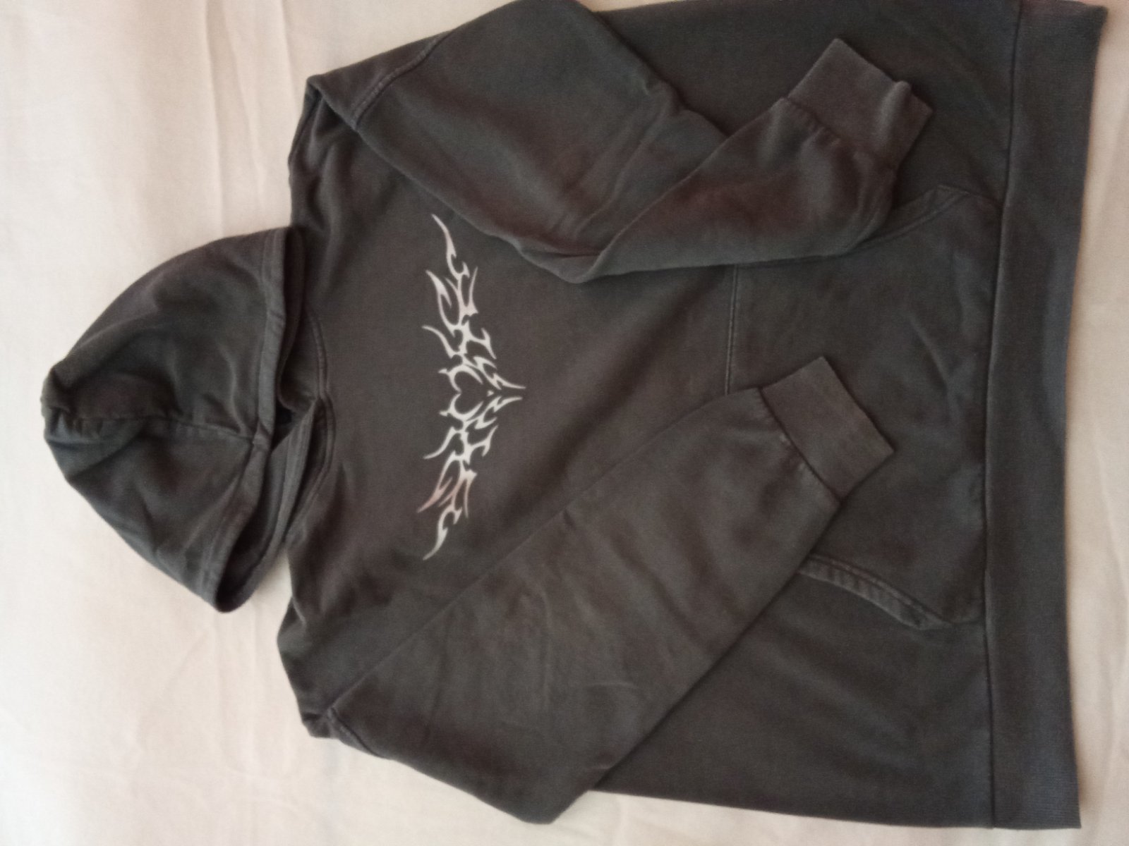 Tmavomodrá mikina s kapucňou a bielym nápisom. Vpredu klokanie vrecko. Má minižmolky z prania, inak je bezchybná (na fotke mi urobil fliačik foťák). Dlžka 56 cm, šírka 44 cm, rukáv od goliera 67 cm.