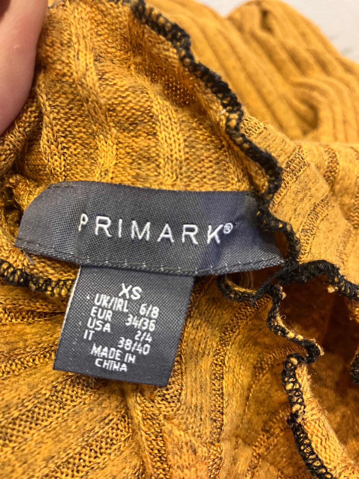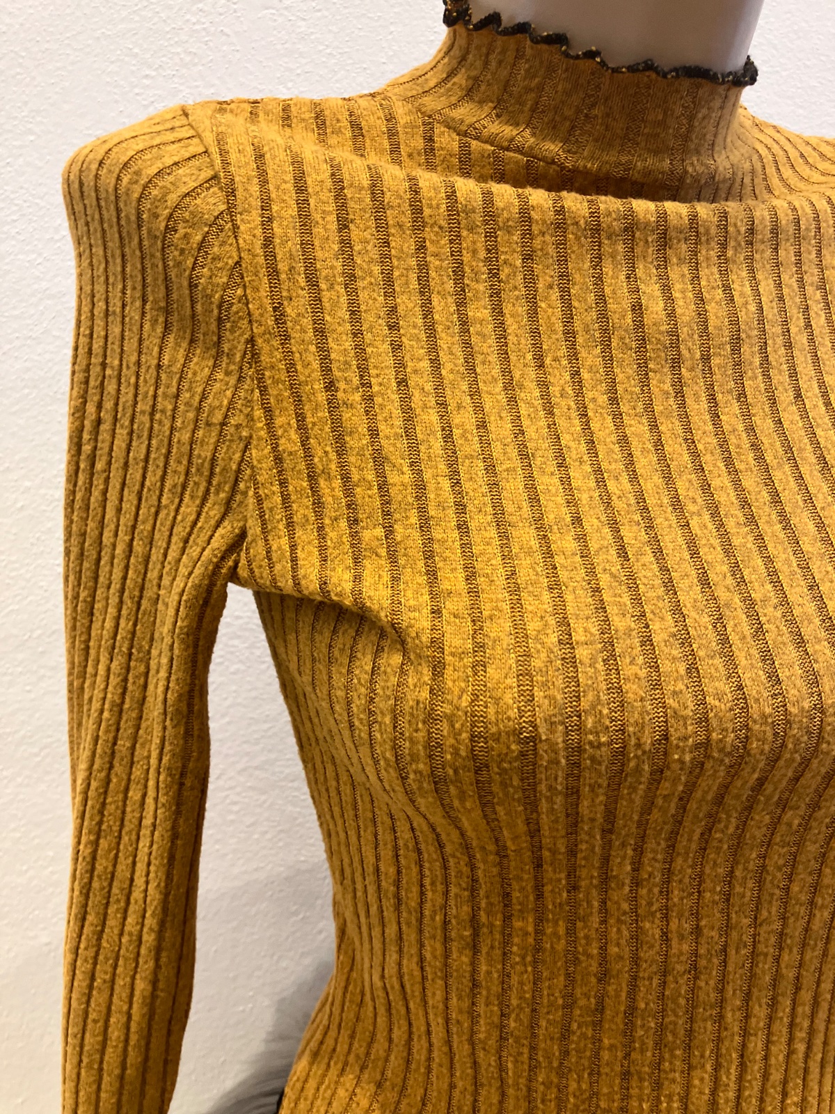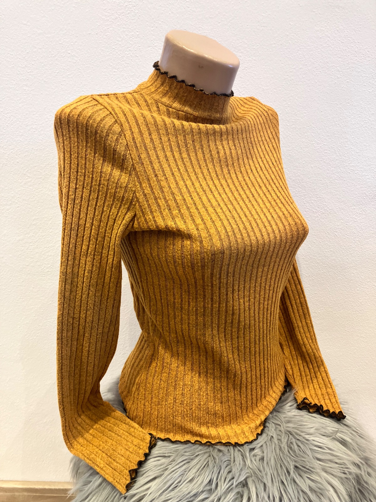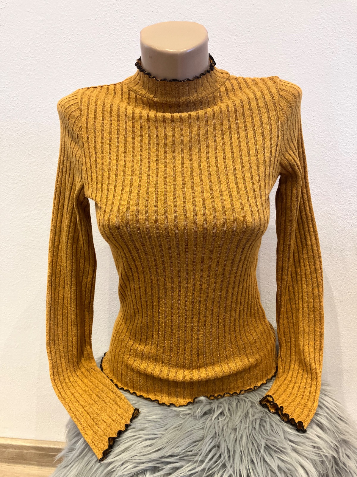 Dámsky rebrovaný sveter s rolákom, farba horčicovo-čierna, tenký, elastický.