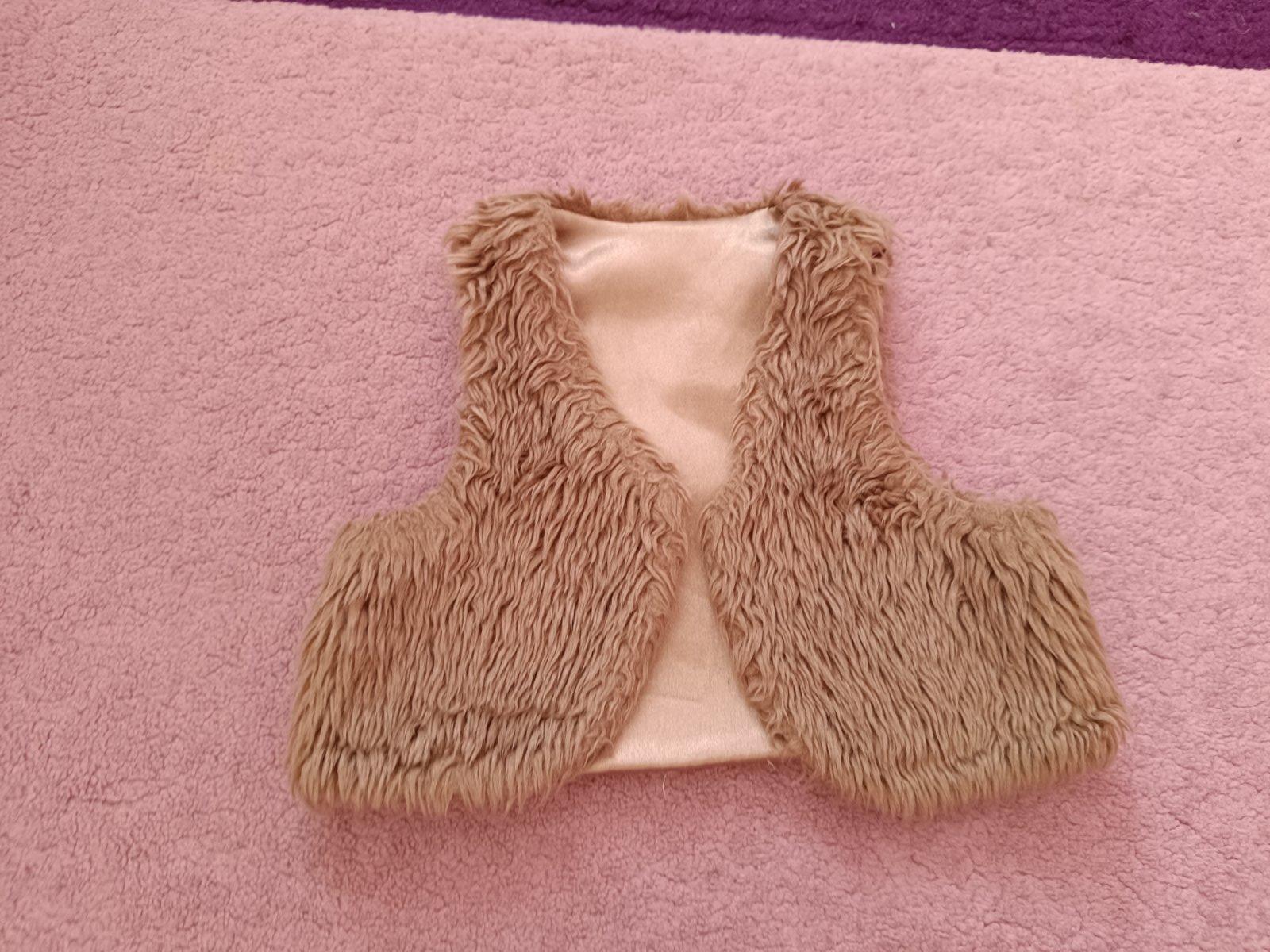 Suprová kožušinová vestička pre malú slečnu. Rozmery: dĺžka je 49 cm, šírka je 37 cm. Zapínanie na háčiky vpredu.