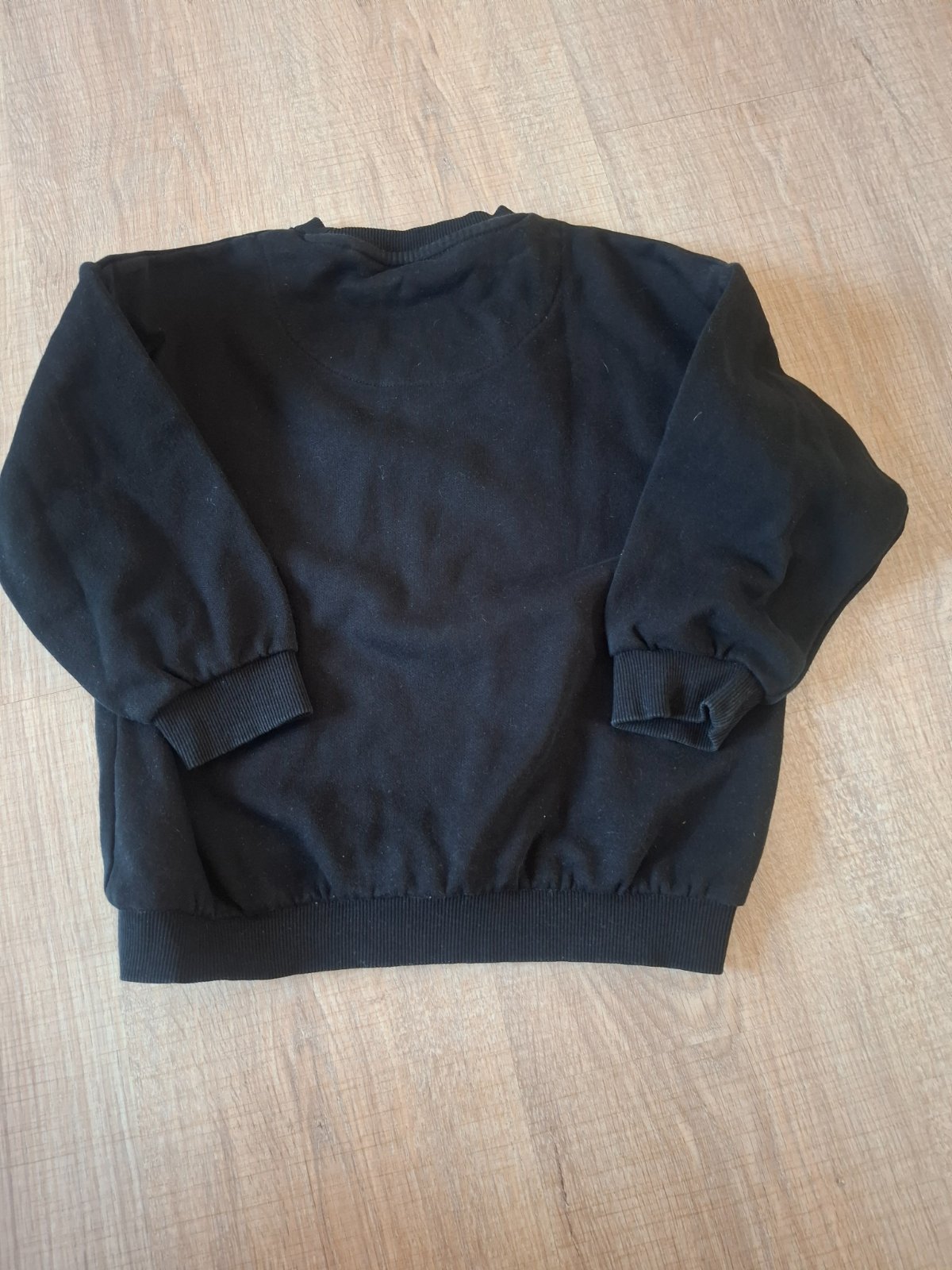 Čierna mikina, veľkosť 6-7 rokov, ako nová, neodhadla som veľkosť. Premerajte, zdá sa mi to skôr 116. Dĺžka: 46 cm, rukáv od krku: 50 cm Veľmi pekný vzor na rukávoch, tie sú ako štrikované.