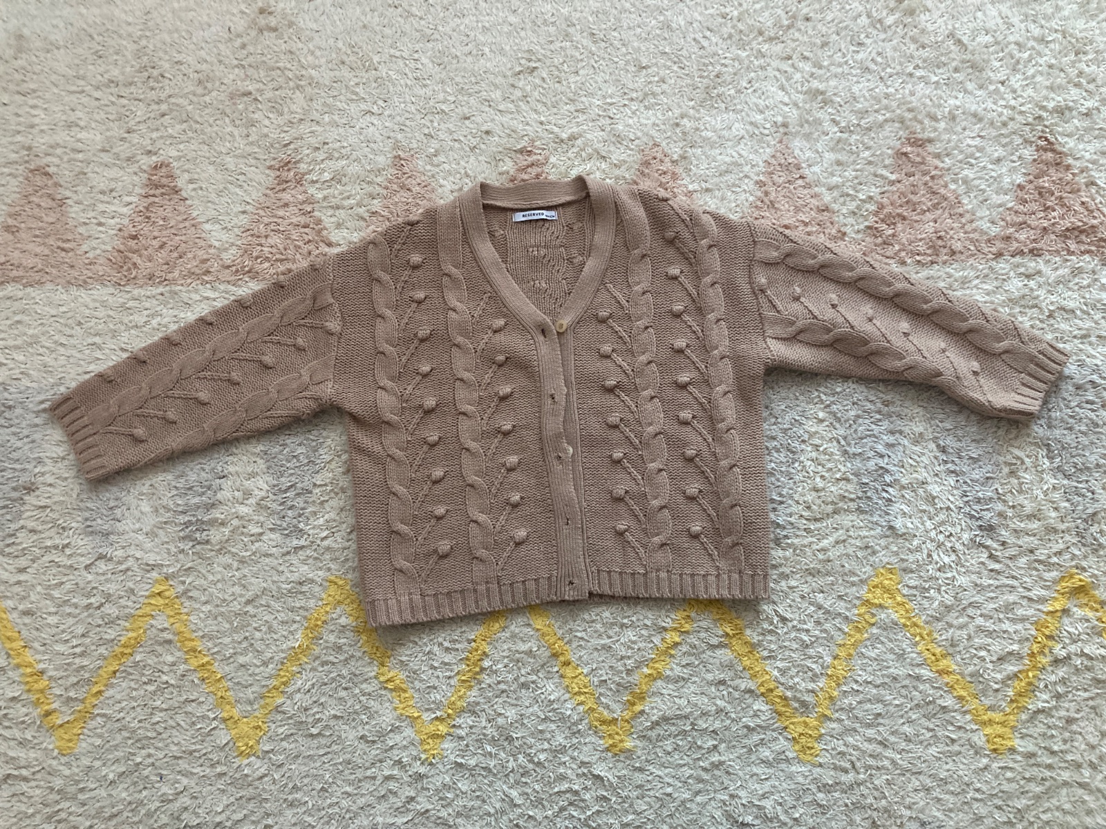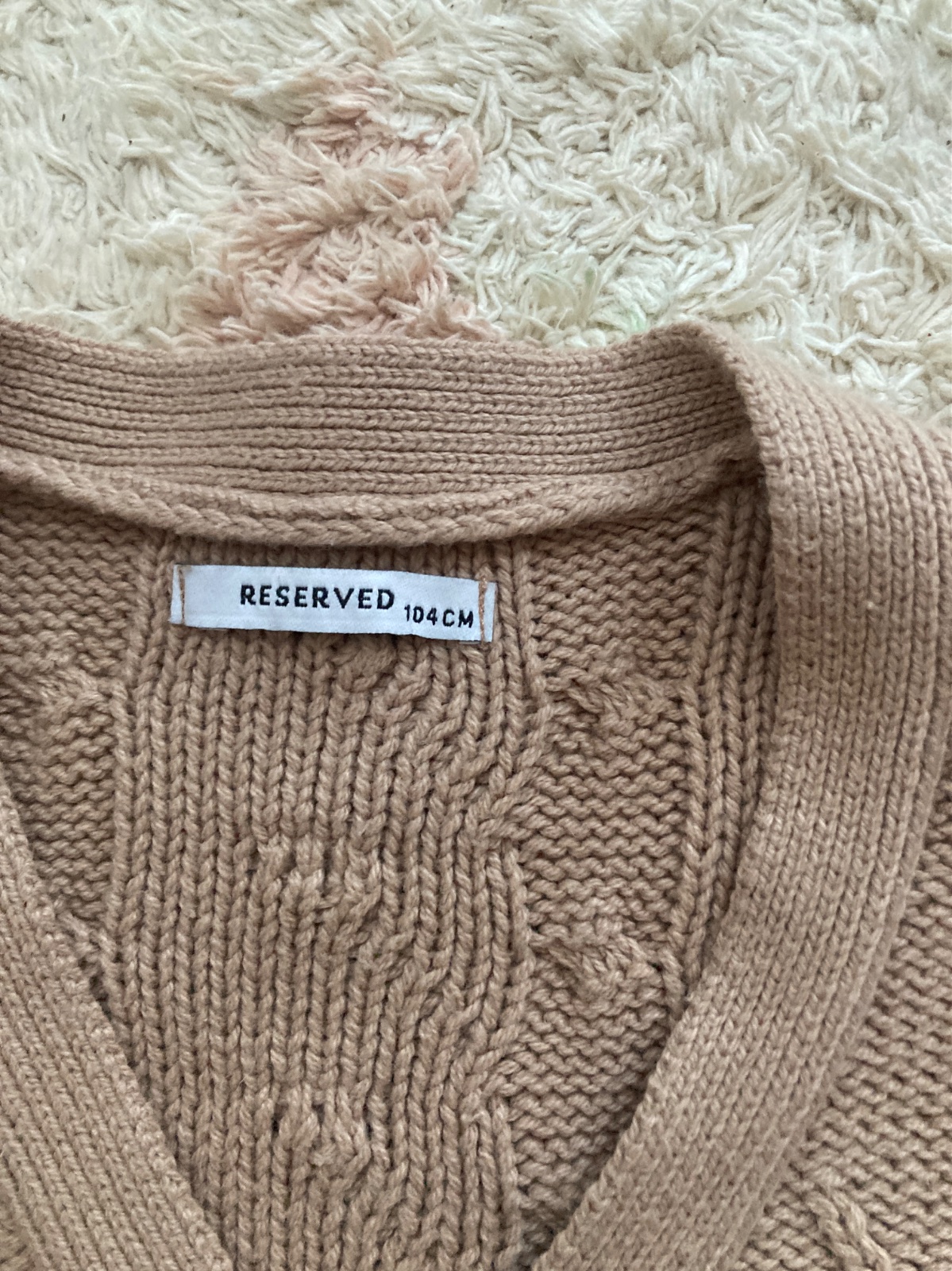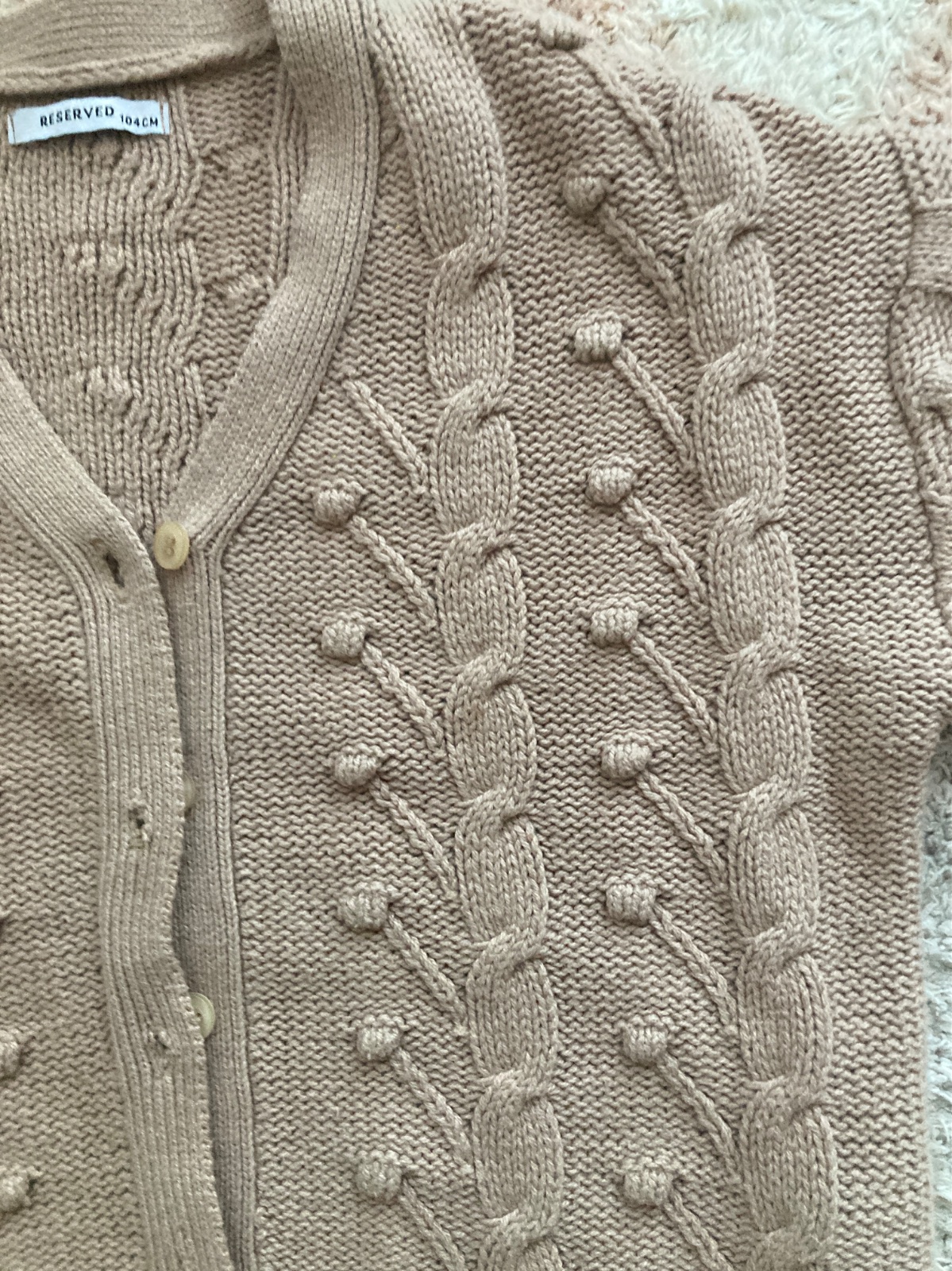 Ponukam na predaj kardigan reserved so strikovanymi bodkami. Povodne mal iba jeden gombík hore. Ostatne dierky aj gombíky sme dorobili. Samozrejme, dierky sú obšité. Visacka udava velkost 104. Sedí na 98,104. Béžová farba. Bez poškodení či známok nosenia.