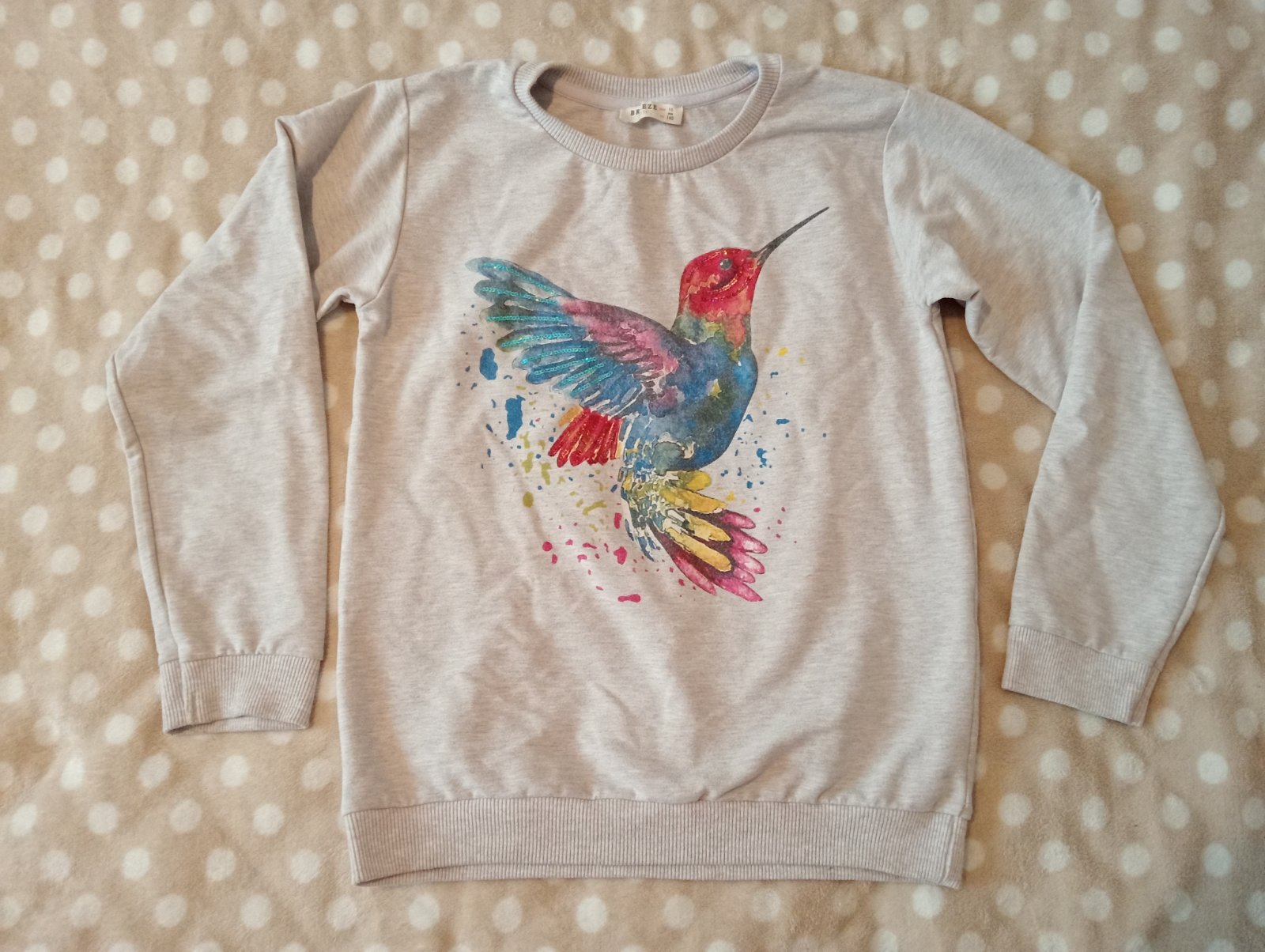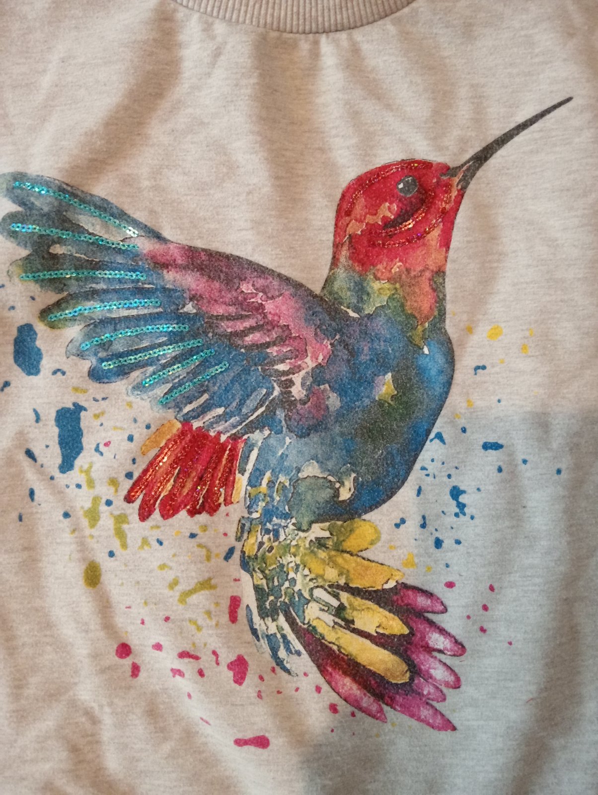 Predám mikinu/tričko s krásnou farebnou aplikáciou kolibríka, v kombinácii s flitrami. Nie je zateplená, možné nosiť aj ako tričko. Veľmi príjemná na dotyk. Bez poškodenia, vyťahania. Len drobné žmolky. Aj napriek tomu, obrázok stále pekný, výrazný. Dĺžka 53 CM, šírka pod pazuchami 40 CM, rukáv od krku 59 CM.