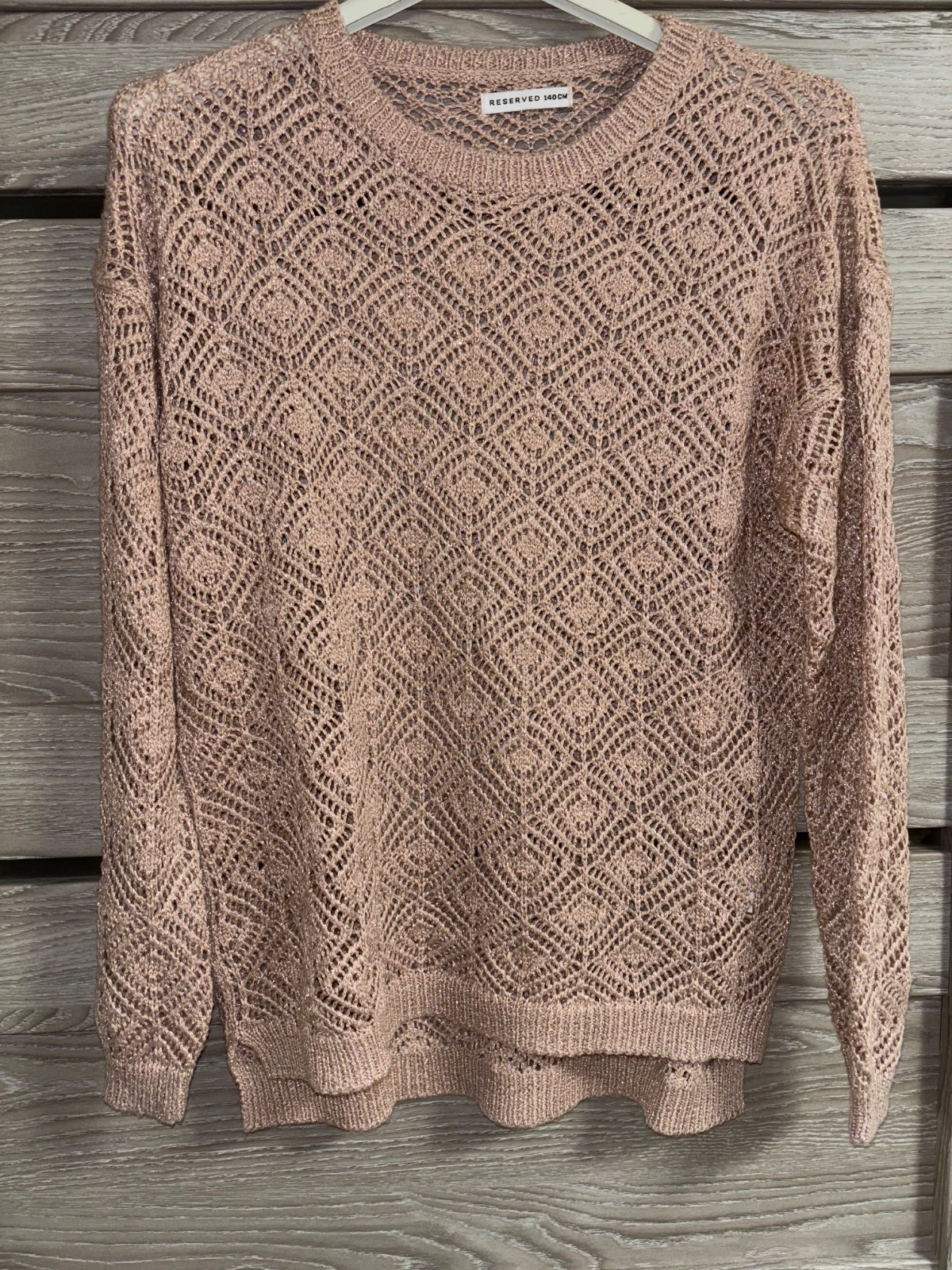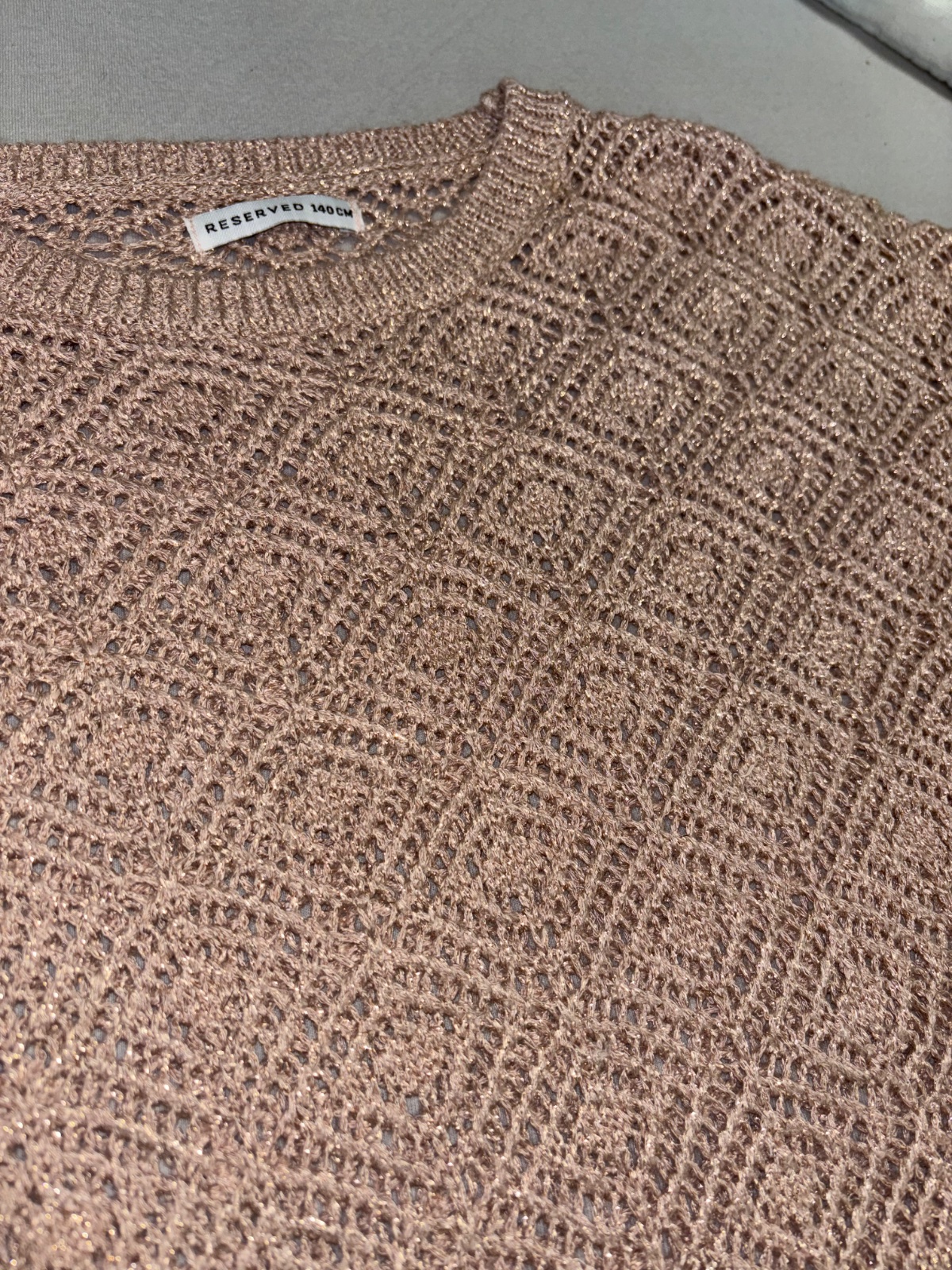 Predám nový nenosený svetrík (žiaľ bez visačky) staroružovej farby, s krásnym trblietavým efektom a predĺženou zadnou časťou. Veľkosť 140, značka Reserved