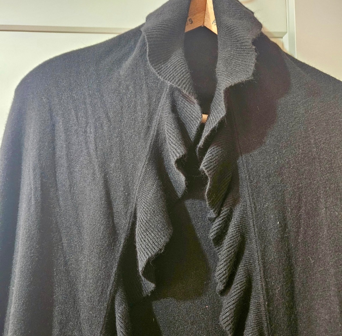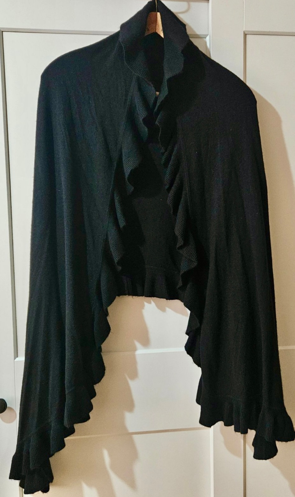 Čierne pončo s volánmi UNI z pleteniny..vyzerá elegantne..sem tam minižmolok.Nemeriam.