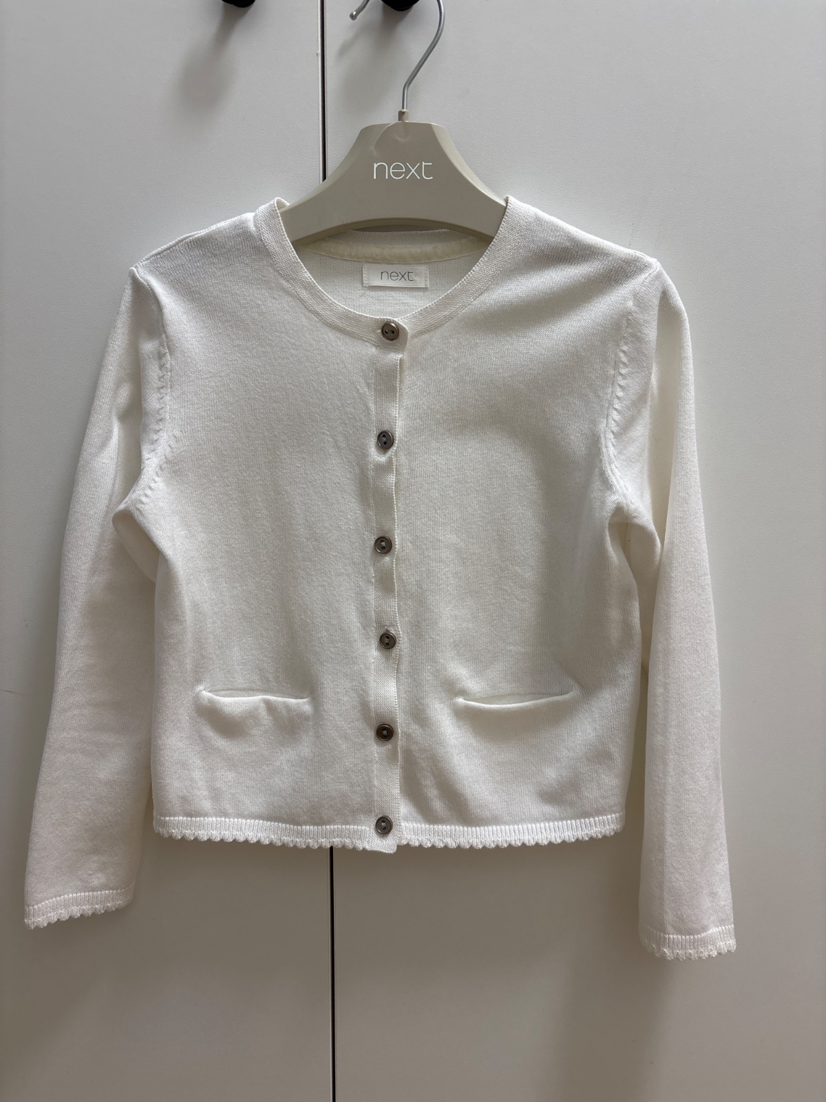Svetrík zn.Next,veľkosť 110,dĺžkou do pása bielej farby. Vhodný k šatám,či sukni.Má skryté vrecká.Top stav,ako nový.