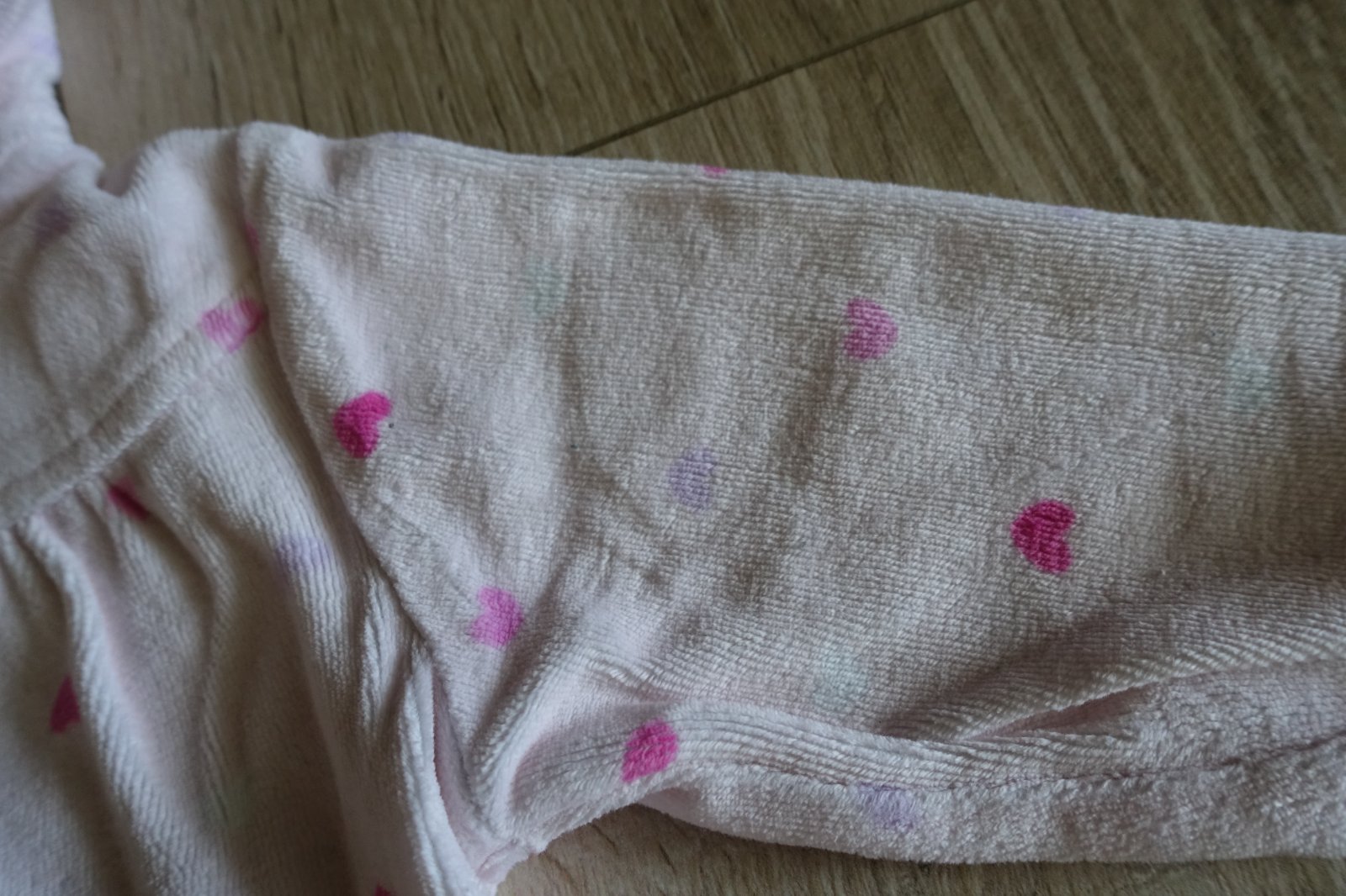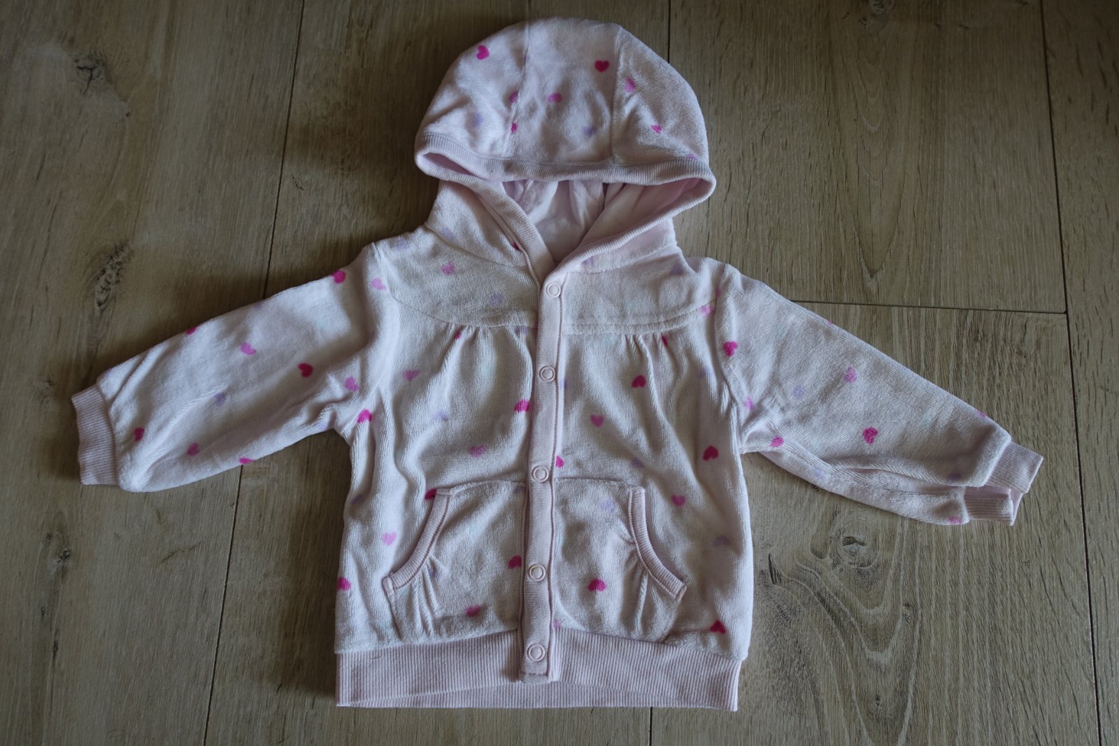 Predám krásny velúrový pastelovo ružový svetríček so srdiečkami. V skutočnosti je krásny ružový, nedá sa mi to dobre odfotiť. Nie je podteplený, je stredne hrubý. Bol nosený na striedačku aj s inými svetríkmi, preto je vhodný len pre nenáročnú mamičku. Je krásny, mäkulinký, cvoky držia pevne. Nemá žiadne fľaky, diery, ani iné poškodenia. Jedinou chybičkou krásy je, že nosením sa urobil z vnútornej strany na bavlne drobný žmolček. Ale je to viditeľné len z vnútornej strany a zvnútra kapucne, z vonkajšej strany je krásny. Aj keď len po byte, radosť určite ešte urobí. Dĺžka predného dielu je 28 cm a zadný diel je ešte o 1,5 cm predĺžený. Šírka je 25 cm. Dĺžka rukáviku od krku je 26 cm a od pliecka 21 cm. (G)